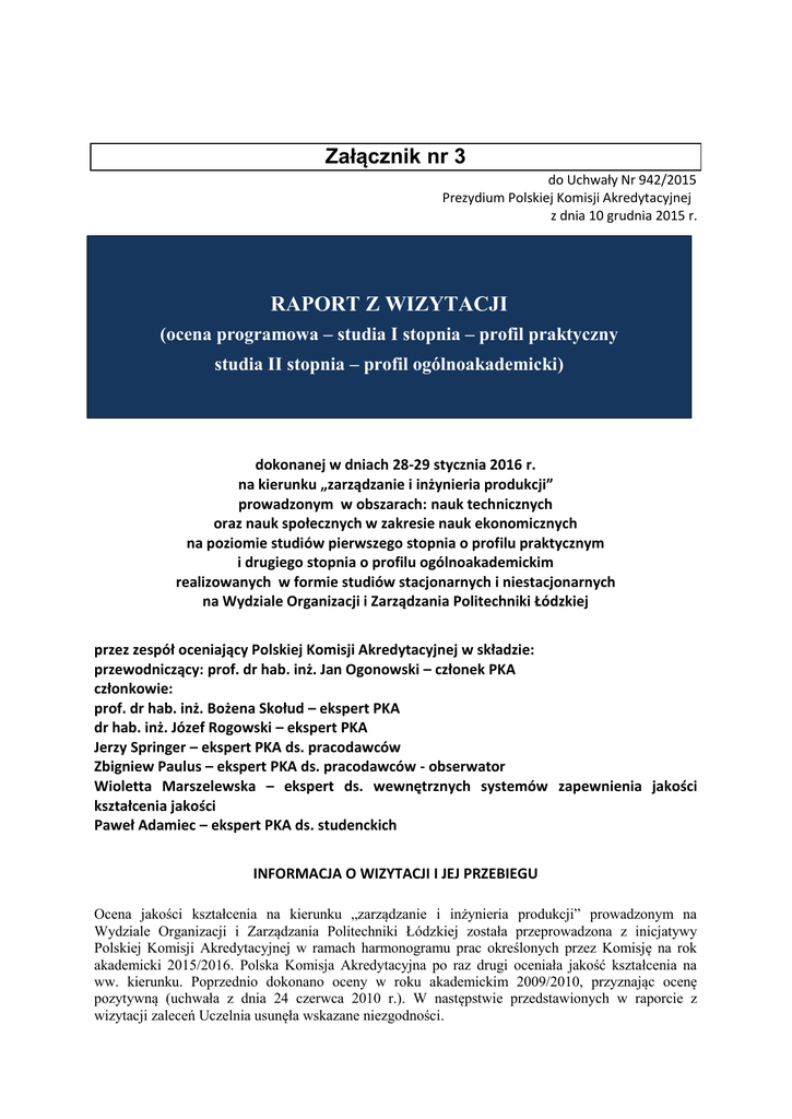 Załącznik nr 3 do Uchwały Nr 942/2015 Prezydium Polskiej Komisji Akredytacyjnej z dnia 10 grudnia 2015 r. RAPORT Z WIZYTACJI (ocena programowa – studia I stopnia – profil praktyczny studia II stopnia – profil ogólnoakademicki) dokonanej w dniach 28-29 stycznia 2016 r. na kierunku „zarządzanie i inżynieria produkcji” prowadzonym w obszarach: nauk technicznych oraz nauk społecznych w zakresie nauk ekonomicznych na poziomie studiów pierwszego stopnia o profilu praktycznym i drugiego stopnia o profilu ogólnoakademickim realizowanych w formie studiów stacjonarnych i niestacjonarnych na Wydziale Organizacji i Zarządzania Politechniki Łódzkiej przez zespół oceniający Polskiej Komisji Akredytacyjnej w składzie: przewodniczący: prof. dr hab. inż. Jan Ogonowski – członek PKA członkowie: prof. dr hab. inż. Bożena Skołud – ekspert PKA dr hab. inż. Józef Rogowski – ekspert PKA Jerzy Springer – ekspert PKA ds. pracodawców Zbigniew Paulus – ekspert PKA ds. pracodawców - obserwator Wioletta Marszelewska – ekspert ds. wewnętrznych systemów zapewnienia jakości kształcenia jakości Paweł Adamiec – ekspert PKA ds. studenckich INFORMACJA O WIZYTACJI I JEJ PRZEBIEGU Ocena jakości kształcenia na kierunku „zarządzanie i inżynieria produkcji” prowadzonym na Wydziale Organizacji i Zarządzania Politechniki Łódzkiej została przeprowadzona z inicjatywy Polskiej Komisji Akredytacyjnej w ramach harmonogramu prac określonych przez Komisję na rok akademicki 2015/2016. Polska Komisja Akredytacyjna po raz drugi oceniała jakość kształcenia na ww. kierunku. Poprzednio dokonano oceny w roku akademickim 2009/2010, przyznając ocenę pozytywną (uchwała z dnia 24 czerwca 2010 r.). W następstwie przedstawionych w raporcie z wizytacji zaleceń Uczelnia usunęła wskazane niezgodności. Wizytacja została przygotowana i przeprowadzona zgodnie z obowiązującą procedurą. Zespół Oceniający PKA zapoznał się z raportem samooceny przekazanym przez władze Uczelni. Wizytacja rozpoczęła się od spotkania z Władzami Uczelni oraz Wydziału, dalszy przebieg wizytacji odbywał się zgodnie z ustalonym harmonogramem. W trakcie wizytacji odbyły się spotkania ze studentami, pracownikami Wydziału, z osobami odpowiedzialnymi za funkcjonowanie wewnętrznego systemu zapewnienia jakości kształcenia, praktyki, a także z interesariuszami zewnętrznymi, przedstawicielami Samorządu Studentów, Biura Karier. Ponadto dokonano oceny losowo wybranych oraz etapowych i dyplomowych na studiach pierwszego orz drugiego stopnia, przeprowadzono hospitacje zajęć oraz dokonano przeglądu bazy dydaktycznej i socjalnej wykorzystywanej w procesie dydaktycznym. Przed zakończeniem wizytacji dokonano wstępnych podsumowań, sformułowano uwagi i zalecenia, o których Przewodniczący Zespołu poinformował władze Uczelni na spotkaniu podsumowującym. 2 OCENA SPEŁNIENIA KRYTERIÓW OCENY PROGRAMOWEJ Ocena końcowa spełnienia kryterium Kryterium oceny Stopień 1. Jednostka sformułowała koncepcję kształcenia i realizuje na ocenianym kierunku studiów program kształcenia umożliwiający osiągnięcie zakładanych efektów kształcenia 2. Liczba i jakość kadry naukowo-dydaktycznej zapewniają realizację programu kształcenia na ocenianym kierunku oraz osiągnięcie przez studentów zakładanych efektów kształcenia 3. Współpraca z otoczeniem społecznym, gospodarczym lub kulturalnym w procesie kształcenia 4. Jednostka dysponuje infrastrukturą dydaktyczną umożliwiającą realizację programu kształcenia o profilu praktycznym i osiągnięcie przez studentów zakładanych efektów kształcenia 4. Jednostka dysponuje infrastrukturą dydaktyczną umożliwiającą realizację programu kształcenia o profilu ogólnoakademickim i osiągnięcie przez studentów zakładanych efektów kształcenia 5. Jednostka zapewnia studentom wsparcie w procesie uczenia się i wchodzenia na rynek pracy 6. W jednostce działa skuteczny wewnętrzny system zapewniania jakości kształcenia zorientowany na ocenę realizacji efektów wyróżniająco w pełni I x II x x I x II I x II x x I x II x x znacząco częściowo niedostatecznie kształcenia i doskonalenia programu kształcenia oraz podniesienie jakości na ocenianym kierunku studiów 4 Jeżeli argumenty przedstawione w odpowiedzi na raport z wizytacji lub wniosku o ponowne rozpatrzenie sprawy będą uzasadniały zmianę uprzednio sformułowanych ocen, raport powinien zostać uzupełniony. Należy, w odniesieniu do każdego z kryteriów, w obrębie którego ocena została zmieniona, wskazać dokumenty, przedstawić dodatkowe informacje i syntetyczne wyjaśnienia przyczyn, które spowodowały zmianę, a ostateczną ocenę umieścić w tabeli nr 1. Max. 2400 znaków (ze spacjami) Tabela nr 1 Ocena końcowa spełnienia kryterium Kryterium wyróżniająco w pełni znacząco częściowo niedostatecznie Uwaga: należy wymienić tylko te kryteria, w odniesieniu do których nastąpiła zmiana oceny Cz. I Studia I stopnia Ocena spełnienia kryteriów 1-4 1. Jednostka sformułowała koncepcję kształcenia i realizuje na ocenianym kierunku studiów program kształcenia umożliwiający osiągnięcie zakładanych efektów kształcenia 1.1 Koncepcja kształcenia na ocenianym kierunku studiów jest zgodna z misją i strategią rozwoju uczelni, odpowiada celom określonym w strategii jednostki oraz w polityce zapewnienia jakości, a także uwzględnia wzorce i doświadczenia krajowe i międzynarodowe właściwe dla danego zakresu kształcenia. * 1.2 Plany rozwoju kierunku uwzględniają tendencje zmian dotyczących wymagań związanych z przygotowaniem do działalności zawodowej, właściwej dla ocenianego kierunku, są zorientowane na 5 potrzeby studentów oraz otoczenia społecznego, gospodarczego lub kulturalnego, w tym w szczególności rynku pracy. 1.3 Jednostka przyporządkowała oceniany kierunek studiów do obszaru/obszarów kształcenia oraz 