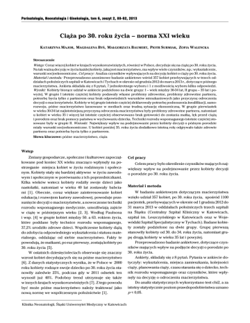 Perinatologia, Neonatologia i Ginekologia, tom 6, zeszyt 2, 88-92, 2013 Ciąża po 30. roku życia – norma XXI wieku KATARZYNA MAJOR, MAGDALENA BYŚ, MAŁGORZATA BAUMERT, PIOTR SURMIAK, ZOFIA WALENCKA Streszczenie Wstęp: Coraz więcej kobiet w krajach wysokorozwiniętych, również w Polsce, decyduje się na ciążę po 30. roku życia. Na tak ważną decyzję w życiu każdej kobiety, jaką jest macierzyństwo, ma wpływ wiele czynników, np.: wykształcenie, warunki socjoekonomiczne. Cel pracy: Analiza czynników wpływających na decyzję kobiet o ciąży po 30. roku życia. Materiał i metoda: Przeprowadzono anonimowe badanie ankietowe wśród 357 kobiet przebywających w trzech oddziałach położniczych szpitali w Katowicach i Tychach w okresie od grudnia 2012 do marca 2013 r., dotyczące późnego macierzyństwa. Ankieta składała się z 8 pytań, 7 jednokrotnego wyboru i 1 z możliwością wyboru kilku odpowiedzi. Wyniki: Kobiety biorące udział w ankiecie podzielono na dwie grupy: I – wiek między 30-34 lat, II grupa – 35 lat i powyżej. W grupie I istotnie częściej kobiety podawały własne problemy zdrowotne, problemy zdrowotne partnera, potrzebę bycia tylko z partnerem oraz brak odpowiednich warunków mieszkaniowych jako przyczynę odroczenia decyzji o macierzyństwie. Kobiety w tej grupie istotnie częściej deklarowały potrzebę podnoszenia kwalifikacji, samorozwoju, późne macierzyństwo lansowane w mediach oraz trudną sytuację ekonomiczną. W grupie pierwiastek w wieku 30-34 lat najistotniejszą przyczyną odroczenia macierzyństwa były problemy zdrowotne partnera, natomiast u kobiet w wieku 35 i więcej lat istotnie częściej obserwowano brak gotowości do zostania matką, lęk przed ciążą i porodem oraz brak pomocy państwa w wychowaniu dziecka. Techniki rozrodu wspomaganego istotnie częściej stosowane były w grupie II. Wnioski: Największy wpływ na podejmowanie przez kobiety decyzji o późnym porodzie miały warunki socjoekonomiczne. U kobiet poniżej 35. roku życia dodatkowo istotną rolę odgrywało także zdrowie partnera oraz potrzeba bycia tylko z partnerem. Słowa kluczowe: późne macierzyństwo, ciąża Wstęp Zmiany gospodarcze, społeczne i kulturowe zapoczątkowane pod koniec XX wieku znacząco wpłynęły na postrzeganie miejsca kobiet w życiu rodzinnym i społecznym. Kobiety stały się bardziej aktywne w życiu zawodowym i społecznym w porównaniu z ich poprzedniczkami. Kilka wieków wstecz kobiety rodziły swoje dzieci jako nastolatki, natomiast w wieku 40 lat zostawały babciami [1]. Obecnie, coraz większe zainteresowanie kobiet edukacją i rozwojem kariery zawodowej, powoduje przesunięcie decyzji o macierzyństwie, a nowoczesne techniki rozrodu wspomaganego medycznie, umożliwiają zajście w ciążę w późniejszym wieku [2, 3]. Według Paulsona i wsp. [4] w grupie kobiet między 50. a 63. rokiem życia, które poddane były technice rozrodu wspomaganego, 37,2% urodziło zdrowe dzieci. Współczesne kobiety dążą do zdobycia odpowiedniego wykształcenia i statusu materialnego, oddalając od siebie macierzyństwo. Fakty te powodują, że matkami, po raz pierwszy, zostają kobiety po 30. roku życia [5]. W ostatnich dziesięcioleciach obserwuje się znaczny wzrost kobiet decydujących się na późne macierzyństwo [6]. Z danych statystycznych wynika, że w Polsce w 2000 roku kobiety rodzące swoje dziecko po 30. roku życia stanowiły zaledwie 25%, podczas gdy w 2011 odsetek ten wynosił już 40%. Podobny trend utrzymuje się także w innych krajach wysokorozwiniętych [7]. Z tego powodu być może późne macierzyństwo należy traktować jako nową normę we współczesnym położnictwie [1]. Klinika Neonatologii, Śląski Uniwersytet Medyczny w Katowicach Cel pracy Celem pracy było określenie czynników mających największy wpływ na podejmowanie przez kobiety decyzji o porodzie po 30. roku życia. Materiał i metoda W badaniu ankietowym dotyczącym macierzyństwa wzięło udział 357 kobiet, po 30. roku życia, spośród 1100 pacjentek, przebywających w okresie od 1 grudnia 2012 do 31 marca 2013 w oddziałach położniczych trzech szpitali na Śląsku (Centralny Szpital Kliniczny w Katowicach, szpital im. Leszczyńskiego w Katowicach oraz w Wojewódzki Szpital Specjalistyczny w Tychach). Badane kobiety zostały podzielone na dwie grupy. Grupę pierwszą stanowiły kobiety od 30. do 34. roku życia, natomiast grupę drugą kobiety w wieku 35 lat i powyżej. Przeprowadzono badanie ankietowe, dotyczące czynników mających wpływ na podjęcie decyzji o porodzie po 30. roku życia. Ankiety, składały się z 8 pytań. Pytania w ankiecie dotyczyły: wyksztalcenia, miejsca zamieszkania, kolejności ciąży, planowania ciąży, czasu starania się o dziecko, technik rozrodu wspomaganego oraz czynników, które wpłynęły na decyzję o odroczeniu macierzyństwa. Do analiz statystycznych wykorzystano test chi2, a za istotny statystycznie poziom prawdopodobieństwa uznano p < 0,05. 89 Ciąża po 30. roku życia – norma XXI wieku Wyniki W okresie od grudnia 2012 do marca 2013 na terenie trzech szpitali: CSK Katowice, szpital im. Leszczyńskiego w Katowicach oraz w szpitalu Wielospecjalistycznym w Tychach odbyło się 1100 porodów. Ankietę wypełniło 357 kobiet w wieku 30 i więcej lat (32,5%), które stanowiły grupę badaną. Najliczniejsza grupę (223; 62,5%) stanowiły kobiety pomiędzy 30. a 34. rokiem życia. Nie obserwowano różnic istotnych statystycznie pomiędzy dwoma grupami badanych kobiet (grupa I – kobiety w wieku 30-34 lat, grupa II – $ 35. roku życia) porównując kolejność ciąży, miejsce zamieszkania oraz wykształcenie. W grupie kobiet w wieku 35 i więcej lat istotnie częściej stosowane były techniki rozrodu wspomaganego (p = 0,03). Najczęściej stosowanymi technikami rozrodu wspomaganego były: zapłodnienie pozaustrojowe (8,9%) oraz inseminacja domaciczna (6,7%). Wyniki przedstawio