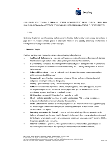 REGULAMIN KORZYSTANIA Z SERWISU „PORTAL DOKUMENTÓW” PRZEZ KLIENTA FIRMY PKO LEASING ORAZ ZASADY AKCEPTACJI WYSTAWIANIA I UDOSTĘPNIANIA FAKTUR ELEKTRONICZNYCH 1. WSTĘP Niniejszy Regulamin określa zasady funkcjonowania Portalu Dokumentów oraz zasady korzystania z jego zasobów, w szczególności prawa i obowiązki Klientów oraz zasady akceptacji wystawiania i udostępniania/przesyłania Faktur Elektronicznych. 2. SŁOWNIK POJĘĆ Poniższe terminy mają następujące znaczenie w niniejszym Regulaminie: • Archiwum E-Dokumentów – oznacza archiwizowany zbiór dokumentów finansowych danego Klienta oraz innych dokumentów udostępnionych w Portalu Dokumentów; • E-Dokumenty – oznaczają dokumenty elektroniczne dotyczące danego Klienta, w tym Fakturę Elektroniczną i wszelkie inne elektroniczne dokumenty PKO Leasing udostępnione w Portalu Dokumentów; • Faktura Elektroniczna - oznacza elektroniczny dokument finansowy, opatrzony podpisem elektronicznym, kwalifikowanym; • Rozrachunki – przedstawiają rozrachunki księgowe Klienta (należności i zobowiązania) dotyczące zawartych umów, na dany dzień; • Wpłaty – przedstawiają wpłaty Klientów dokonywane na dany dzień; • Faktura - oznacza w szczególności fakturę, notę korygującą, fakturę korygującą, duplikat faktury lub inny rachunek, zarówno w formie papierowej, jak i w formie elektronicznej, spełniający wymogi określone w przepisach prawa; • PKO Leasing – oznacza PKO Leasing S.A. z siedzibą w Łodzi; • Klient - podmiot gospodarczy, który prowadzi współpracę z PKO Leasing, posiadający indywidualne konto internetowe w Portalu Dokumentów; • Portal Dokumentów- oznacza platformę dedykowaną dla Klientów PKO Leasing pozwalającą na prezentację E-Dokumentów związanych z obsługą zawartych przez Klientów umów, rozrachunków oraz wpłat; • Podmioty uprawnione do Kontroli – oznacza podmioty władzy publicznej uprawnione do żądania udostępnienia dokumentów i informacji niezbędnych do przeprowadzenia postępowań kontrolnych, w tym postępowania przewidzianego przepisami ustawy z dnia 29 sierpnia 1997 r. Ordynacja podatkowa z późn. zm.; • Przerwa Techniczna – przerwa w funkcjonowaniu Portalu Dokumentów, pozwalająca na wykonanie prac niezbędnych do naprawy lub konserwacji Portalu Dokumentów; PKO Leasing Spółka Akcyjna, Al. Marszałka Edwarda Śmigłego-Rydza 20, 93-281 Łódź t: 42 253 96 00, f: 42 253 96 16, infolinia: 0 801 350 828, www.pkoleasing.pl Sąd Rejonowy dla Łodzi Śródmieścia w Łodzi, XX Wydział Krajowego Rejestru Sądowego numer KRS 0000022886, NIP: 725-17-35-694, kapitał zakładowy: 174 056 900 zł (w całości wpłacony) Strona 1/4 • Regulamin - niniejszy Regulamin określa zasady korzystania z Portalu Dokumentów oraz zasady akceptacji wystawiania i udostępniania/przesyłania Faktur Elektronicznych; • Usługa – świadczenie, polegające na korzystaniu z Portalu Dokumentów; • Usługodawca – oznacza podmiot współpracujący z PKO Leasing w zakresie dostawy i obsługi Portalu Dokumentów 3. POSTANOWIENIA OGÓLNE 1. Każdy Klient korzystający z usługi udostępniania E-Dokumentów za pośrednictwem Portalu Dokumentów jest zobowiązany do zapoznania się z niniejszym Regulaminem, jego akceptacji i przestrzegania jego postanowień. 2. Niniejszy Regulamin udostępniany jest za pośrednictwem strony internetowej PKO Leasing znajdującej się pod adresem: www.pkoleasing.pl/efaktura 4. INFORMACJE TECHNICZNE 1. Do korzystania z serwisu internetowego Portal Dokumentów niezbędny jest dostęp do Internetu, oraz przeglądarka internetowa z włączoną obsługą JavaScript i Cookies. Aplikacja została dostosowana do współpracy z następującymi przeglądarkami: Przeglądarka internetowa (MS Internet Explorer 11.0 lub wyższy, Mozilla Firefox 42.0, Google Chrome 46.0.24). 2. W celu prawidłowego odczytu E-Dokumentów konieczne jest zainstalowanie programu Adobe Acrobat Reader, którą można pobrać bezpłatnie z następującej lokalizacji: http://get.adobe.com/reader/. 3. W celu weryfikacji Faktur Elektronicznych poprzez korzystanie z bezpiecznego podpisu elektronicznego w rozumieniu ustawy z dnia 18 września 2001 roku o podpisie elektronicznym (Dz.U. z 2001, nr 130, poz.1450, z późn.zm), można pobrać aplikację dostępną bezpłatnie na stronie Usługodawcy http://infinite.pl/oferta/infinite-ecm.html w zakładce „E-podpis”. 4. Warunkiem korzystania z Portalu Dokumentów jest posiadanie aktywnego konta dostępowego do Portalu Dokumentów. 5. Aby uaktywnić konto dostępowe do Portalu Dokumentów dla trwającej umowy, należy wypełnić Zgodę na wystawianie dokumentów elektronicznych dostępną na stronie internetowej www.pkoleasing.pl/efaktura, a następnie przesłać na adres: PKO Leasing SA, 93-281 Łódź, Al. Marszałka Edwarda Śmigłego-Rydza 20 lub podpisać odpowiednie dokumenty na etapie podpisywania Umowy Leasingu. PKO Leasing Spółka Akcyjna, Al. Marszałka Edwarda Śmigłego-Rydza 20, 93-281 Łódź t: 42 253 96 00, f: 42 253 96 16, infolinia: 0 801 350 828, www.pkoleasing.pl Sąd Rejonowy dla Łodzi Śródmieścia w Łodzi, XX Wydział Krajowego Rejestru Sądowego numer KRS 0000022886, NIP: 725-17-35-694, kapitał zakładowy: 174 056 900 zł (w całości wpłacony) Strona 2/4 5. OBSŁUGA ORAZ DOSTARCZENIE E-FAKTURY 1. Każda wystawiona Faktura Elektroniczna jest udostępniona Klientowi na Portalu Dokumentów. Jednocześnie Klient otrzymuje powiadomienie o nowym dokumencie drogą mailową na adres wskazany w Zgodzie na wystawianie dokumentów elektronicznych. 2. Za termin doręczenia Klientowi Faktury Elektronicznej uznaje się moment zamieszczenia dokumentu na Portalu Dokumentów. 3. Za potwierdzenie otrzymania przez Klienta korekty, do faktury wystawionej uprzednio przez PKO Leasing w formie Elektronicznej Faktury, uznaje się moment zamieszczenia dokumentu na Portalu Dokumentów. 4. Nie wystawia się duplik