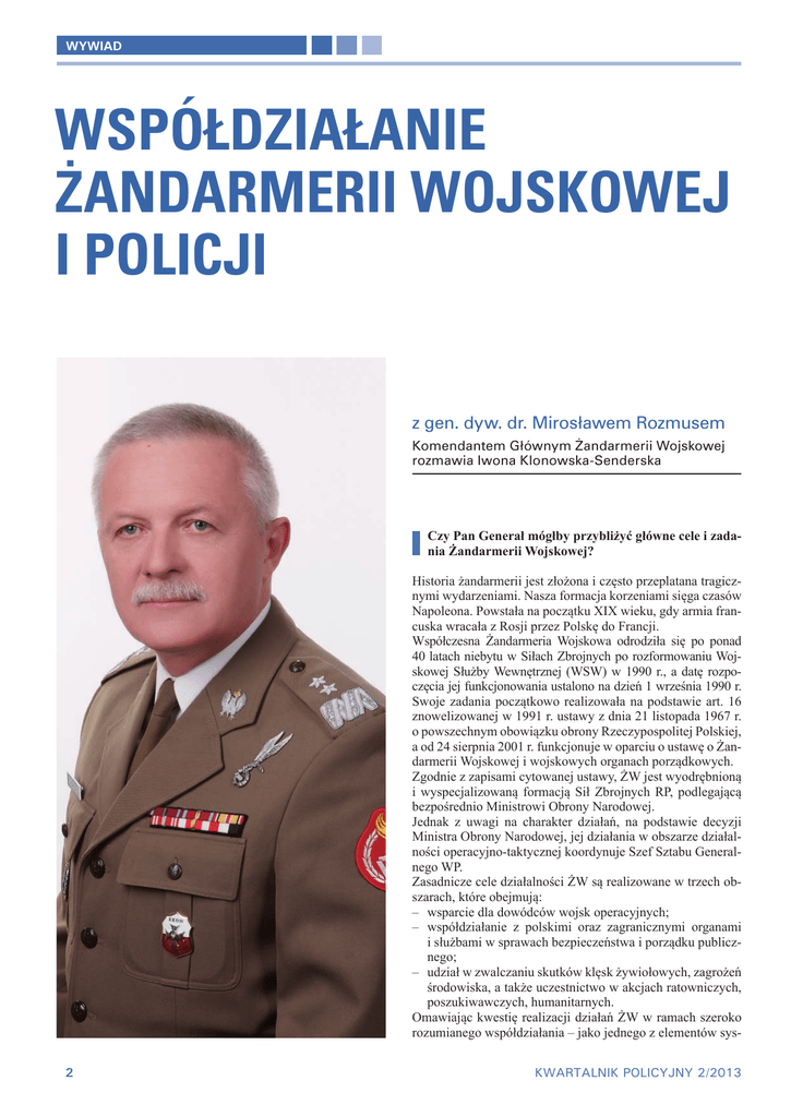wywiad Współdziałanie Żandarmerii Wojskowej i Policji z gen. dyw. dr. Mirosławem Rozmusem Komendantem Głównym Żandarmerii Wojskowej rozmawia Iwona Klonowska-Senderska Czy Pan Generał mógłby przybliżyć główne cele i zadania Żandarmerii Wojskowej? Historia żandarmerii jest złożona i często przeplatana tragicznymi wydarzeniami. Nasza formacja korzeniami sięga czasów Napoleona. Powstała na początku XIX wieku, gdy armia francuska wracała z Rosji przez Polskę do Francji. Współczesna Żandarmeria Wojskowa odrodziła się po ponad 40 latach niebytu w Siłach Zbrojnych po rozformowaniu Wojskowej Służby Wewnętrznej (WSW) w 1990 r., a datę rozpoczęcia jej funkcjonowania ustalono na dzień 1 września 1990 r. Swoje zadania początkowo realizowała na podstawie art. 16 znowelizowanej w 1991 r. ustawy z dnia 21 listopada 1967 r. o powszechnym obowiązku obrony Rzeczypospolitej Polskiej, a od 24 sierpnia 2001 r. funkcjonuje w oparciu o ustawę o Żandarmerii Wojskowej i wojskowych organach porządkowych. Zgodnie z zapisami cytowanej ustawy, ŻW jest wyodrębnioną i wyspecjalizowaną formacją Sił Zbrojnych RP, podlegającą bezpośrednio Ministrowi Obrony Narodowej. Jednak z uwagi na charakter działań, na podstawie decyzji Ministra Obrony Narodowej, jej działania w obszarze działalności operacyjno-taktycznej koordynuje Szef Sztabu Generalnego WP. Zasadnicze cele działalności ŻW są realizowane w trzech obszarach, które obejmują: –– wsparcie dla dowódców wojsk operacyjnych; –– współdziałanie z polskimi oraz zagranicznymi organami i służbami w sprawach bezpieczeństwa i porządku publicznego; –– udział w zwalczaniu skutków klęsk żywiołowych, zagrożeń środowiska, a także uczestnictwo w akcjach ratowniczych, poszukiwawczych, humanitarnych. Omawiając kwestię realizacji działań ŻW w ramach szeroko rozumianego współdziałania – jako jednego z elementów sys2 KWARTALNIK POLICYJNY 2/2013 wywiad gen. dyw. dr Mirosław Rozmus temu bezpieczeństwa wewnętrznego i porządku publicznego państwa – zakres podmiotowy oraz przedmiotowy działań ŻW należy rozpatrywać w dwóch przypadkach, mianowicie: kiedy ŻW jest samodzielnym i jedynym podmiotem prowadzącym działania (co jest obecnie mało prawdopodobne) bądź podmiotem wiodącym w działaniach prowadzonych z wykorzystaniem wsparcia innych służb oraz drugi przypadek – kiedy ŻW w czasie prowadzenia takich działań wspiera inne podmioty uprawnione do ich prowadzenia w ramach szeroko rozumianego współdziałania – z czym mamy do czynienia w czasie pokoju, z kolei sytuacja ta będzie odwrotna w przypadku konfliktu zbrojnego w strefie bezpośrednich działań oraz w strefie tylnej prowadzonych działań. Wskazany wcześniej cel działań ŻW oraz ich zakres podmiotowy i przedmiotowy wynika bezpośrednio z posiadanych uprawnień ustawowych, w myśl których formacja jest właściwa w stosunku do żołnierzy pełniących czynną służbę wojskową, pracowników wojska, osób przebywających na terenie obiektów wojskowych, żołnierzy sił zbrojnych państw obcych przebywających na terytorium RP oraz ich personelu cywilnego. W art. 4 ustawy określono zasadnicze zadania ŻW, do których należą: –– zapewnienie przestrzegania dyscypliny wojskowej; –– ochranianie porządku publicznego na terenach i w obiektach jednostek wojskowych oraz w miejscach publicznych; –– ochranianie życia i zdrowia ludzi oraz mienia wojskowego przed zamachami naruszającymi te dobra; –– wykrywanie przestępstw i wykroczeń, w tym również skarbowych, ujawnianie i ściganie ich sprawców oraz ujawnianie i zabezpieczanie dowodów tych przestępstw i wykroczeń; –– zapobieganie popełnianiu przestępstw i wykroczeń oraz innym zjawiskom patologicznym, a w szczególności alkoholizmowi i narkomanii w Siłach Zbrojnych; –– współdziałanie z polskimi oraz zagranicznymi organami i służbami właściwymi w sprawach bezpieczeństwa i porządku publicznego oraz policjami wojskowymi; –– udział w zwalczaniu klęsk żywiołowych, nadzwyczajnych zagrożeń środowiska i likwidowanie ich skutków oraz czynne uczestnictwo w akcjach poszukiwawczych, ratowniczych i humanitarnych, mających na celu ochronę życia i zdrowia oraz mienia; –– dokonywanie analizy oświadczeń majątkowych żołnierzy zawodowych i przedstawianie Ministrowi Obrony Narodowej wniosków w tym zakresie; –– wykonywanie innych zadań określonych w odrębnych przepisach. Oczywiście zadania te realizowane są we współdziałaniu z innymi służbami realizującymi zadania w obszarze bezpieczeństwa i porządku publicznego. Są one także wykonywane poza granicami kraju w ramach misji i operacji pokojowych oraz stabilizacyjnych, w których uczestniczą nasze Siły Zbrojne. Proszę o przybliżenie struktury ŻW. Czy jest podobna do struktury Policji? Funkcjonowanie bieżące oraz działanie w okresie kryzysu jest realizowane w oparciu o trzy zasadnicze piony funkcjonalne – dochodzeniowo-śledczy, prewencyjny oraz administracyjno-logistyczny (w tym sztab). Zapewniają one sprawne kierowanie i dowodzenie oraz użycie operacyjne jednostek ŻW. Podobnie jak Policję, ŻW tworzą komenda główna oraz terenowe i specjalistyczne jednostki organizacyjne. Jednostki terenowe to samodzielne jednostki organizacyjne – oddziały ŻW podległe KG ŻW, które realizują zadania na określonym terenie odpowiedzialności – w ich strukturach występują wydziały: dochodzeniowo-śledczy, kryminalny, prewencji oraz sztab. Jednostki specjalistyczne to oddziały specjalne oraz oddział zabezpieczenia i Centrum Szkolenia, które realizują zadania na rzecz całości sił ŻW, wspierają je w zależności od potrzeb i charakteru realizowanych przez nie zadań. Oddziały specjalne ŻW są przeznaczone także do zapobiegania aktom terroru i likwidacji ich skutków. Są szkolone i wyposażone podobnie jak jednostki prewencji i 
