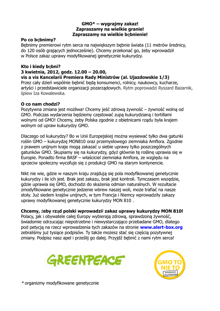 GMO* – wygrajmy zakaz! Zapraszamy na wielkie granie! Zapraszamy na wielkie bębnienie! Po co bębnimy? Bębnimy premierowi rytm serca na największym bębnie świata (11 metrów średnicy, do 120 osób grających jednocześnie). Chcemy przekonać go, żeby wprowadził w Polsce zakaz uprawy modyfikowanej genetycznie kukurydzy. Kto i kiedy bębni? 3 kwietnia, 2012, godz. 12.00 – 20.00, vis a vis Kancelarii Premiera Rady Ministrów (al. Ujazdowskie 1/3) Przez cały dzień wspólnie bębnić będą konsumenci, rolnicy, naukowcy, kucharze, artyści i przedstawiciele organizacji pozarządowych. Rytm poprowadzi Ryszard Bazarnik, śpiew Iza Kowalewska. O co nam chodzi? Pozytywna zmiana jest możliwa! Chcemy jeść zdrową żywność – żywność wolną od GMO. Podczas wydarzenia będziemy częstować zupą kukurydzianą i tortillami wolnymi od GMO! Chcemy, żeby Polska zgodnie z obietnicami rządu była krajem wolnym od upraw kukurydzy GMO. Dlaczego od kukurydzy? Bo w Unii Europejskiej można wysiewać tylko dwa gatunki roślin GMO – kukurydzę MON810 oraz przemysłowego ziemniaka Amflora. Zgodnie z prawem unijnym kraje mogą zakazać u siebie uprawy tylko poszczególnych gatunków GMO. Skupiamy się na kukurydzy, gdyż głównie tę roślinę uprawia się w Europie. Ponadto firma BASF – właściciel ziemniaka Amflora, ze względu na sprzeciw społeczny wycofuje się z produkcji GMO na starym kontynencie. Nikt nie wie, gdzie w naszym kraju znajdują się pola modyfikowanej genetycznie kukurydzy i ile ich jest. Brak jest zakazu, brak jest kontroli. Tymczasem wszędzie, gdzie uprawia się GMO, dochodzi do skażenia odmian naturalnych. W rezultacie zmodyfikowane genetycznie jedzenie wbrew naszej woli, może trafiać na nasze stoły. Już siedem krajów unijnych, w tym Francja i Niemcy wprowadziły zakazy uprawy modyfikowanej genetycznie kukurydzy MON 810 . Chcemy, żeby rząd polski wprowadził zakaz uprawy kukurydzy MON 810! Polacy, jak i obywatele całej Europy wybierają zdrową, sprawdzoną żywność, świadomie odrzucając niepotrzebne i niewystarczająco przebadane GMO, dlatego pod petycją na rzecz wprowadzenia tych zakazów na stronie www.alert-box.org zebraliśmy już tysiące podpisów. Ty także możesz stać się częścią pozytywnej zmiany. Podpisz nasz apel i prześlij go dalej. Przyjdź bębnić z nami rytm serca! * organizmy modyfikowane genetycznie