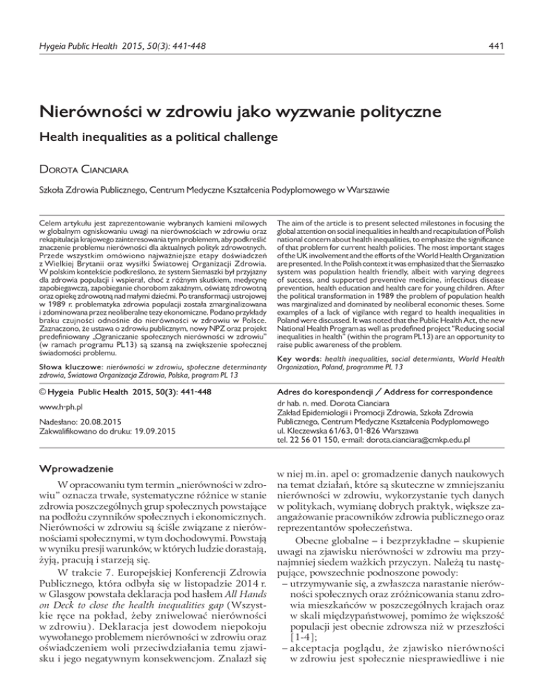 Cianciara Hygeia Public D. Health Nierówności 2015, w 50(3): zdrowiu 441-448 jako wyzwanie polityczne 441 Nierówności w zdrowiu jako wyzwanie polityczne Health inequalities as a political challenge Dorota Cianciara Szkoła Zdrowia Publicznego, Centrum Medyczne Kształcenia Podyplomowego w Warszawie Celem artykułu jest zaprezentowanie wybranych kamieni milowych w globalnym ogniskowaniu uwagi na nierównościach w zdrowiu oraz rekapitulacja krajowego zainteresowania tym problemem, aby podkreślić znaczenie problemu nierówności dla aktualnych polityk zdrowotnych. Przede wszystkim omówiono najważniejsze etapy doświadczeń z Wielkiej Brytanii oraz wysiłki Światowej Organizacji Zdrowia. W polskim kontekście podkreślono, że system Siemaszki był przyjazny dla zdrowia populacji i wspierał, choć z różnym skutkiem, medycynę zapobiegawczą, zapobieganie chorobom zakaźnym, oświatę zdrowotną oraz opiekę zdrowotną nad małymi dziećmi. Po transformacji ustrojowej w 1989 r. problematyka zdrowia populacji została zmarginalizowana i zdominowana przez neoliberalne tezy ekonomiczne. Podano przykłady braku czujności odnośnie do nierówności w zdrowiu w Polsce. Zaznaczono, że ustawa o zdrowiu publicznym, nowy NPZ oraz projekt predefiniowany „Ograniczanie społecznych nierówności w zdrowiu” (w ramach programu PL13) są szansą na zwiększenie społecznej świadomości problemu. Słowa kluczowe: nierówności w zdrowiu, społeczne determinanty zdrowia, Światowa Organizacja Zdrowia, Polska, program PL 13 The aim of the article is to present selected milestones in focusing the global attention on social inequalities in health and recapitulation of Polish national concern about health inequalities, to emphasize the significance of that problem for current health policies. The most important stages of the UK involvement and the efforts of the World Health Organization are presented. In the Polish context it was emphasized that the Siemaszko system was population health friendly, albeit with varying degrees of success, and supported preventive medicine, infectious disease prevention, health education and health care for young children. After the political transformation in 1989 the problem of population health was marginalized and dominated by neoliberal economic theses. Some examples of a lack of vigilance with regard to health inequalities in Poland were discussed. It was noted that the Public Health Act, the new National Health Program as well as predefined project “Reducing social inequalities in health” (within the program PL13) are an opportunity to raise public awareness of the problem. Key words: health inequalities, social determiants, World Health Organization, Poland, programme PL 13 © Hygeia Public Health 2015, 50(3): 441-448 Adres do korespondencji / Address for correspondence www.h-ph.pl dr hab. n. med. Dorota Cianciara Zakład Epidemiologii i Promocji Zdrowia, Szkoła Zdrowia Publicznego, Centrum Medyczne Kształcenia Podyplomowego ul. Kleczewska 61/63, 01-826 Warszawa tel. 22 56 01 150, e-mail: [email protected] Nadesłano: 20.08.2015 Zakwalifikowano do druku: 19.09.2015 Wprowadzenie W opracowaniu tym termin „nierówności w zdrowiu” oznacza trwałe, systematyczne różnice w stanie zdrowia poszczególnych grup społecznych powstające na podłożu czynników społecznych i ekonomicznych. Nierówności w zdrowiu są ściśle związane z nierównościami społecznymi, w tym dochodowymi. Powstają w wyniku presji warunków, w których ludzie dorastają, żyją, pracują i starzeją się. W trakcie 7. Europejskiej Konferencji Zdrowia Publicznego, która odbyła się w listopadzie 2014 r. w Glasgow powstała deklaracja pod hasłem All Hands on Deck to close the health inequalities gap (Wszystkie ręce na pokład, żeby zniwelować nierówności w zdrowiu). Deklaracja jest dowodem niepokoju wywołanego problemem nierówności w zdrowiu oraz oświadczeniem woli przeciwdziałania temu zjawisku i jego negatywnym konsekwencjom. Znalazł się w niej m.in. apel o: gromadzenie danych naukowych na temat działań, które są skuteczne w zmniejszaniu nierówności w zdrowiu, wykorzystanie tych danych w politykach, wymianę dobrych praktyk, większe zaangażowanie pracowników zdrowia publicznego oraz reprezentantów społeczeństwa. Obecne globalne – i bezprzykładne – skupienie uwagi na zjawisku nierówności w zdrowiu ma przynajmniej siedem ważkich przyczyn. Należą tu następujące, powszechnie podnoszone powody: –utrzymywanie się, a zwłaszcza narastanie nierówności społecznych oraz zróżnicowania stanu zdrowia mieszkańców w poszczególnych krajach oraz w skali międzypaństwowej, pomimo że większość populacji jest obecnie zdrowsza niż w przeszłości [1-4]; –akceptacja poglądu, że zjawisko nierówności w zdrowiu jest społecznie niesprawiedliwe i nie 442 fair w stosunku do grup, które nie mają szansy na osiągnięcie pełnego potencjału zdrowia [5]; –respektowanie praw człowieka stało się ważnym kryterium oceny władz, prawa i reguł życia społecznego; –świadomość, że nierówności mogą być szkodliwe dla wszystkich członków społeczeństwa w wyniku np. rozprzestrzeniania się chorób zakaźnych, skutków nadużywania alkoholu, przemocy czy przestępczości [6]; –uznanie, że kapitał ludzki i zdrowie są warunkiem wzrostu gospodarczego [7, 8], a nierówności w zdrowiu są kosztowne, powodują realne straty mikro- oraz makroekonomiczne, w tym generują koszty medycyny naprawczej i systemu opieki społecznej [9]; –przekonanie, że nierównościom w zdrowiu można i trzeba przeciwdziałać [5]; –wola pokonania tego problemu, w tym [10]: • uzupełnienia niedostatków wiedzy, m.in. dotyczącej wszechstronnej diagnozy problemu, a zwłaszcza na temat skutecznych metod przeciwdziałania zjawisku; • ulepszenia procesu translacji wiedzy, czyli wykorzystania w aktualnych politykach istniejących dowodów naukowych 