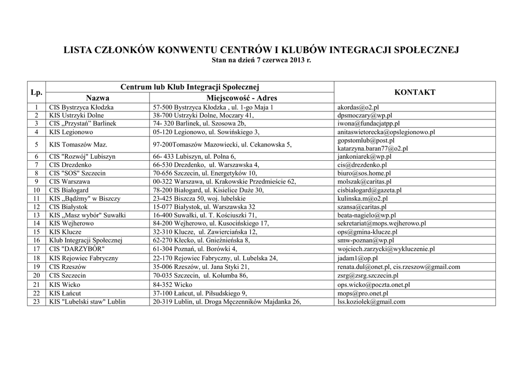 LISTA CZŁONKÓW KONWENTU CENTRÓW I KLUBÓW INTEGRACJI SPOŁECZNEJ Stan na dzień 7 czerwca 2013 r. Lp. Nazwa Centrum lub Klub Integracji Społecznej Miejscowość - Adres 1 2 3 4 CIS Bystrzyca Kłodzka KIS Ustrzyki Dolne CIS „Przystań” Barlinek KIS Legionowo 57-500 Bystrzyca Kłodzka , ul. 1-go Maja 1 38-700 Ustrzyki Dolne, Moczary 41, 74- 320 Barlinek, ul. Szosowa 2b, 05-120 Legionowo, ul. Sowińskiego 3, 5 KIS Tomaszów Maz. 97-200Tomaszów Mazowiecki, ul. Cekanowska 5, 6 7 8 9 10 11 12 13 14 15 16 17 18 19 20 21 22 23 CIS "Rozwój" Lubiszyn CIS Drezdenko CIS "SOS" Szczecin CIS Warszawa CIS Białogard KIS „Bądźmy" w Biszczy CIS Białystok KIS „Masz wybór" Suwałki KIS Wejherowo KIS Klucze Klub Integracji Społecznej CIS "DARZYBÓR" KIS Rejowiec Fabryczny CIS Rzeszów CIS Szczecin KIS Wicko KIS Łańcut KIS "Lubelski staw" Lublin 66- 433 Lubiszyn, ul. Polna 6, 66-530 Drezdenko, ul. Warszawska 4, 70-656 Szczecin, ul. Energetyków 10, 00-322 Warszawa, ul. Krakowskie Przedmieście 62, 78-200 Białogard, ul. Kisielice Duże 30, 23-425 Biszcza 50, woj. lubelskie 15-077 Białystok, ul. Warszawska 32 16-400 Suwałki, ul. T. Kościuszki 71, 84-200 Wejherowo, ul. Kusocińskiego 17, 32-310 Klucze, ul. Zawierciańska 12, 62-270 Kłecko, ul. Gnieźnieńska 8, 61-304 Poznań, ul. Borówki 4, 22-170 Rejowiec Fabryczny, ul. Lubelska 24, 35-006 Rzeszów, ul. Jana Styki 21, 70-035 Szczecin, ul. Kolumba 86, 84-352 Wicko 37-100 Łańcut, ul. Piłsudskiego 9, 20-319 Lublin, ul. Droga Męczenników Majdanka 26, KONTAKT [email protected] [email protected] [email protected] [email protected] [email protected] [email protected] [email protected] [email protected] [email protected] [email protected] [email protected] [email protected] [email protected] [email protected] [email protected] [email protected] [email protected] [email protected] [email protected] [email protected], [email protected] [email protected] [email protected] [email protected] [email protected] 24 25 26 27 28 29 30 31 32 33 34 35 36 37 38 39 40 41 42 43 44 45 46 47 48 49 50 51 52 Koszaliński CIS "Tacy Sami" CIS Ostrzyce CIS Gdańsk CIS Wieprz CIS Byczyna KIS Sejny KIS Koziegłowy KIS Janów Lubelski KlS Bytom CIS Lubosz CIS "Od Nowa" Łobez KIS -GOPS Tomaszów Lub. CIS Chełm KIS Tomaszów Maz. KIS Pabianice KIS Tłuszcz KIS Zamość CIS Braniewo CIS Zielona Góra KIS Lublin KIS MOPS Włocławek CIS Drezdenko CIS – Poznań Piątkowo CIS Staszów KIS Kielce CIS Wrocław CIS Ostrowiec Św. CIS Stargard Szcz. KIS Mielec 75-129 Koszalin, ul. Mieszka I-go 16, 83-311 Goręczyno, Ostrzyce, ul. Droga Kaszubska 9, 80-546 Gdańsk, ul. Floriańska 3 34-122 Gmina Wieprz 424 46-220 Byczyna, Polanowice 94 16-500 Sejny, ul. Piłsudskiego 34 42-350 Koziegłowy, ul. Zarecka 28 23-300 Janów Lubelski, ul. Bohaterów Poryt. Wzgórza 23, 41-902 Bytom, ul. Powstańców Warszawskich 14, 64-423 Lubosz, Chudobczyce 27 73-150 Łobez, ul. Bema 27, 22-600 Tomaszów Lubelski, ul. Kościelna 11, 22-100 Chełm, ul. Połaniecka 10, 97-200 Tomaszów Mazowiecki, ul. Cekanowska 5, 95-200 Pabianice, ul. Partyzancka 31, 05-240 Tłuszcz, ul. Warszawska 2, 22-400 Zamość, ul. Św. Piątka 24, 14-500 Braniewo, ul. Kościuszki 10, 65-175 Zielona Góra, ul. Staszica 4, 20-401 Lublin, ul. Krochmalna 13, 87-800 Włocławek, ul. Okrzei 61, 66-530 Drezdenko, ul. Warszawska 1 60-388 Poznań, oś. Jana III Sobieskiego 105, 28-200 Staszów, ul. Parkowa 6, 25-606 Kielce, ul. Jagiellońska 42a, 53-611 Wrocław, ul. Strzegomska 49, 27-400 Ostrowiec Świętokrzyski, ul. Sandomierska 26A, 73-110 Stargard Szczeciński, ul. Krasińskiego 19, 39-300 Mielec, ul. Łukasiewicza 1c, [email protected], [email protected] [email protected], [email protected] [email protected] [email protected] [email protected] [email protected] [email protected] [email protected] [email protected] [email protected] [email protected] [email protected] [email protected] [email protected] [email protected], [email protected], [email protected] [email protected], [email protected] [email protected] [email protected], [email protected] [email protected] [email protected] [email protected] [email protected] [email protected] [email protected] [email protected] [email protected] [email protected],[email protected] [email protected] 53 54 55 56 57 58 59 60 61 62 63 64 65 66 67 68 69 70 71 72 73 74 75 76 77 78 KIS Stalowa Wola CIS Gorzów Wlkp. KIS Śrem CIS Nowy Sącz CIS Ełk KIS Jedlicze CIS Płock CIS "Zielone światło" Opoczno KIS "Aktywni Razem" Ełk CIS CISTOR Toruń KIS MOPS Kraków KIS Olsztynek KIS Stella Dubienka KlS CISTOR Toruń KIS Ostrowiec Św. KIS Wrocław CIS Kraków CIS Kielce CIS Osówek / Osieczna CIS w Bytowie CIS w Tychach KIS MOPS w Koszalinie KIS MOPR Konin KIS MOPS Ruda Śląska KIS MOPS Puławy KIS MGOPS Więcbork 79. KIS „Szansa” w Lublinie 80. CIS „Nadzieja” w Lublinie 37-450 Stalowa Wola, ul. Dmowskiego 1, 66-400 Gorzów Wlkp., ul. Teatralna 26, 63-100 Śrem, ul. Okulickiego 3, 33-300 Nowy Sącz, ul. Wyspiańskiego 22, 19-300 Ełk, ul. Kościuszki 28B, 38-460 Jedlicze, ul. Rynek 5, 09-402 Płock, ul. Pedagogiczna 7, 26-300 Opoczno, ul. Biernackiego 4/23, 19-300 Ełk, ul. Słowackiego 15B, 87-100 Toruń, ul. Stokrotkowa 22, 31-958 Kraków, os. Słoneczne 15, 11-015 Olsztynek, ul. Świerczewskiego 19, 22- 145 Dubienka, ul. Zawalna 21, 87-100 Toruń, ul. Stokrotkowa 22, 27-400 Ostrowiec Św., ul. Sandomierska 26A, 53-611 Wrocław, ul. Strzegomska 49, 32- 000 Kraków, Os. Zielone 22 25-013 Kielce, ul. Jana Pawła II 3 83-243 Osieczna, ul. Osówek 47 77-100 Bytów, ul. 1-ego Maja 15 44-100 Tychy, ul. Edukacji 11 75-412 Koszalin, ul. Al. Monet Casino 62-510 Konin, ul. Sosnowa 16 41-709 Ruda Śląska, ul. Markowej 20 24-100 Puławy, ul. Leśna 17 89-410 Więcbork, ul. Mickiewicza 22a 20-082 Lublin, ul. Zielona 3, Bractwo Miłosierdzia im. Św. Brata Alberta 20-442 Lublin, ul. Abramowicka 2 F [email protected] [email protected] [email protected] [email protected] [email protecte