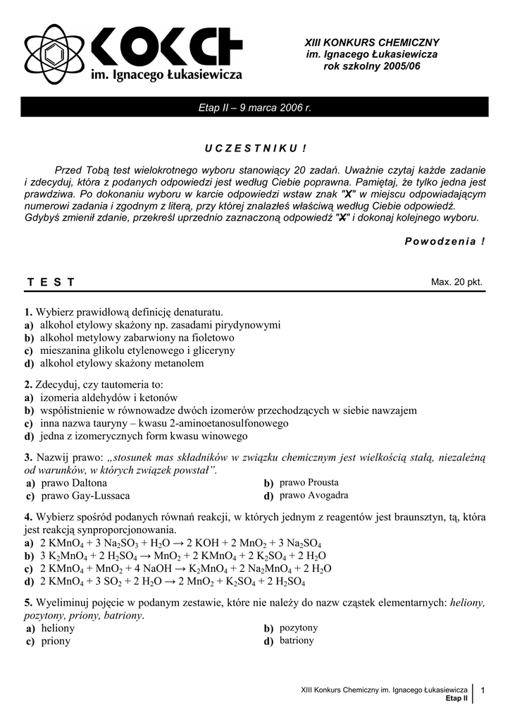 XIII KONKURS CHEMICZNY im. Ignacego Łukasiewicza rok szkolny 2005/06 Etap II – 9 marca 2006 r. UCZESTNIKU ! Przed Tobą test wielokrotnego wyboru stanowiący 20 zadań. Uważnie czytaj każde zadanie i zdecyduj, która z podanych odpowiedzi jest według Ciebie poprawna. Pamiętaj, że tylko jedna jest prawdziwa. Po dokonaniu wyboru w karcie odpowiedzi wstaw znak "X" w miejscu odpowiadającym numerowi zadania i zgodnym z literą, przy której znalazłeś właściwą według Ciebie odpowiedź. Gdybyś zmienił zdanie, przekreśl uprzednio zaznaczoną odpowiedź "X" i dokonaj kolejnego wyboru. Powodzenia ! T E S T Max. 20 pkt. 1. Wybierz prawidłową definicję denaturatu. a) alkohol etylowy skażony np. zasadami pirydynowymi b) alkohol metylowy zabarwiony na fioletowo c) mieszanina glikolu etylenowego i gliceryny d) alkohol etylowy skażony metanolem 2. Zdecyduj, czy tautomeria to: a) izomeria aldehydów i ketonów b) współistnienie w równowadze dwóch izomerów przechodzących w siebie nawzajem c) inna nazwa tauryny – kwasu 2-aminoetanosulfonowego d) jedna z izomerycznych form kwasu winowego 3. Nazwij prawo: „stosunek mas składników w związku chemicznym jest wielkością stałą, niezależną od warunków, w których związek powstał”. a) prawo Daltona b) prawo Prousta c) prawo Gay-Lussaca d) prawo Avogadra 4. Wybierz spośród podanych równań reakcji, w których jednym z reagentów jest braunsztyn, tą, która jest reakcją synproporcjonowania. a) 2 KMnO4 + 3 Na2SO3 + H2O → 2 KOH + 2 MnO2 + 3 Na2SO4 b) 3 K2MnO4 + 2 H2SO4 → MnO2 + 2 KMnO4 + 2 K2SO4 + 2 H2O c) 2 KMnO4 + MnO2 + 4 NaOH → K2MnO4 + 2 Na2MnO4 + 2 H2O d) 2 KMnO4 + 3 SO2 + 2 H2O → 2 MnO2 + K2SO4 + 2 H2SO4 5. Wyeliminuj pojęcie w podanym zestawie, które nie należy do nazw cząstek elementarnych: heliony, pozytony, priony, batriony. b) pozytony a) heliony c) priony d) batriony XIII Konkurs Chemiczny im. Ignacego Łukasiewicza Etap II 1 6. Wskaż właściwy opis hasła: anihilacja cząstek. a) inhalacja ziołowa zalecana przy bólu gardła b) wysyłanie przez niektóre jądra cząstek związane z przemianami jądrowymi c) przemiana cząsteczek CO2 w procesie asymilacji d) przemiana masy w energię zachodząca na skutek zderzenia cząstki elementarnej z jej antycząstką 7. Przyporządkuj wielkości – przeliczanie jednostek. I attometr X II femtometr Y III nanometr Z IV pikometr W a) I – X, II – Y, III – Z, IV – W c) I – W, II – Z, III – X, IV – Y 10-9 m 10-12 m 10-15 m 10-18 m b) I – Y, II – W, III – X, IV – Z d) I – Z, II – X, III – Y, IV – W 8. Wskaż prawidłowo zapisaną konfigurację elektronów walencyjnych atomu manganu. 1 6 b) 4s 3d a) 4s2 3d5 2 2 6 2 6 2 5 c) 3s2 3p6 3d5 4s2 d) 1s 2s 2p 3s 3p 4s 3d 9. Wybierz zdanie prawdziwe. a) metan jest jedynym alkanem, który nie tworzy izomerów b) aktywność alkanów wzrasta wraz z długością łańcucha węglowodorowego c) pentan tworzy cztery izomery d) substytucja fotochemiczna metanu prowadzi do powstania mieszaniny fluorowcopochodnych 10. Wybierz zdanie fałszywe. a) wszystkie α-aminokwasy zawierają w cząsteczce asymetryczny atom węgla b) anilina i alanina należą do różnych szeregów homologicznych c) cysteina zawiera w cząsteczce atom siarki d) walina to kwas α-aminowalerianowy 11. Zaznacz właściwy dalszy ciąg zdania: Po odparowaniu części wody bez zmiany temperatury z roztworu elektrolitu... a) stopień dysocjacji zmaleje a stała dysocjacji wzrośnie b) stopień dysocjacji nie zmieni się i stała dysocjacji nie zmieni się c) stopień dysocjacji zmaleje a stała dysocjacji nie zmieni się d) Stopień dysocjacji wzrośnie a stała dysocjacji zmaleje 12. Przyporządkuj barwy z kolumny 1 do roztworów zawierających jony w kolumnie 2. 1 2 2+ I zielona X Mn Y MnO 2-4 II fioletowa III a) I – X, II – Y, III – Z c) I – Z, II – X, III – Y bladoróżowa Z MnO-4 b) I – Y, II – Z, III – X d) I – X, II – Z, III – Y 13. Zdecyduj, w którym zdaniu popełniono najwięcej błędów. a) 1 mol każdego gazu zawiera 6,02·1023 cząsteczek i w warunkach normalnych zajmuje objętość 2,24·10-1 m3, a w warunkach standardowych zmniejsza swoją objętość. XIII Konkurs Chemiczny im. Ignacego Łukasiewicza Etap II 2 b) 1 mol tlenu w warunkach normalnych zawiera 12,04·1023 atomów i waży 16 g, a w warunkach standardowych zawiera 6,02·1023 cząsteczek. c) 2,24 dm3 dwutlenku węgla w warunkach normalnych zawiera 6,02·1022 atomów węgla i 6,02·1022 cząsteczek tlenu. d) 1 mol etanu zbudowany jest z dwukrotnie większej liczby atomów niż 1 mol acetylenu, stąd 1 mol etanu zajmuje objętość w warunkach normalnych 22,4 dm3, a 1 mol acetylenu 44,8 dm3. 14. Odszukaj dalszy ciąg definicji: Jednostka masy atomowej to: a) 1/12 masy atomu izotopu 12C b) masa atomowa wodoru c) liczba wynikająca z porównania masy atomu danego pierwiastka z 1/12 masy atomu izotopu 12C d) masa molowa 15. Wybierz zestaw szkła laboratoryjnego stosowany do miareczkowania alkacymetrycznego. a) zlewka, pipeta, lejek b) kolba okrągłodenna, lejek c) erlenmayerka, biureta d) biureta, kolba miarowa 16. Połącz w pary nazwy typów reakcji z równaniami reakcji. I reakcja addycji X CaCO3 → CaO + CO2 II reakcja analizy Y C2 H 6 O → C 2 H 4 + H 2 O III reakcja eliminacji Z C3 H 6 + H 2 O → C 3 H 8 O IV reakcja syntezy W CO + H2 → CH2O a) I – X, II – Y, III – W, IV – Y c) I – Y, II – X, III – W, IV – Z b) I – W, II – X, III – Z, IV – Y d) I – Z, II – X, III – Y, IV – W 17. Zdecyduj, dlaczego preparaty anatomiczne przechowywane są w formalinie. a) formalina powoduje zmiany struktury białek zachodzące z rozerwaniem wiązań peptydowych b) formalina powoduje denaturację białka bakterii c) formalina ma właściwości redukujące d) formalina chroni preparat przed kontaktem z powietrzem 18. Wskaż grupę związków, które mogą reagować z zasadą sodową. a) C15H31COOH, C2H5OH, C6H5O
