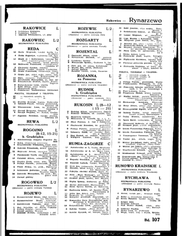 Rakowke RAKOWICE 4 3 1 L ROZEWIE Leśnictwo Bialagóra Leśnictwo Tyllce Sikorski Włodzimierz, wł. dóbr RAKOWIEC ROZMÓWNICA PUBLICZNA (Abonenci — patrz centrala Hel) ROZGARTY L/2 ROZMÓWNICA PUBLICZNA Barta C bydła, Ludwlchowo 4 Bisha Augustyn, wędzarnia ryb, Spo kojna 12 Bloch dr i Koltermann, fabryka ka mieni wapienno-piaskowych i wy rób, cement., tartak parowy 15 Brlllowskl Franciszek, elektromonter, Gdańska 17 5 Chojnacki Gustaw, Inżynier 21 Górski Teodor, majątek Ciechocino 26 Grabę Franciszek, restauracja, Gdań ska 20 9 Grabę Jan, skład mąki, paszy, mat. bud., Wejherowska 27 14 Hare, olejarnia, Ludwichowo 20 Jarosławski Mieczysław, dr, maj. Jar 18 Kaszubowski Brunon, kupiec, RumiaZagórze 8 Kożyczkowski Leon, oberża 7 Kuni Alfred, młyn wodny 3 Marczewski Jerzy 1 Państwowe Nadleśnictwo Gniewowo 16 13 6 17 Rosinke Konrad, kupiec, Białarzeka Schmidt Paweł, fabryka • czekoladek, Odańska 28 Wlczanowski Leon, ks. proboszcz, Gdańska 2 Zarząd Drogowy, Gdańska 19 Zarząd Majątku, wł. Rotkei, Ciecho cino Zygcnda Bolesław, handel drzewa, Odańska 14 REWA L/2 ROZMÓWNICA PUBLICZNA ROGOŹNO L (8-12, 15-21) k. Grudziądza 1 7 4 8 11 5 13 10 9 6 3 16 14 Administracja majątku Rogoźno Za mek Kolei, ekspedycja towarowa Krzyżanowski Władysław, właśc. dóbr, Rogożno-wieś Kulerskl Franciszek, dzierż, majątku, Skurgwy Majewski Antoni, obywatel ziemski, Rogoźno wieś Paczkowski Teofil, obywatel ziemski. Rogoźno wieś Pakalskl Alfons, mleczarnia, Rogoź no wieś Pawlltz Erich, wlaśc. dóbr, Sobótka Policja Państw., posterunek, Rogoź no wieś Ptach Alojzy, ks. prob., Dąbrówka Król. Schiemann Jadischke, wlaśc. oberży, Rogoźno Zamek Zalewski Mieczysław, ks. prob , Ro goźno wieś Zarząd gminny ROGÓWKO L/2 ROZMÓWNICA PUBLICZNA (Abonenci — patrz centrala Turzno) ROJEWO 2 6 3 1 4 5 7 Hammermeister Bruno, młyn motoro wy, Plonkówko Bruno, Leśnłanki, pow. Inowrocław Każmlerczak Tadeusz, ppor. rez., maj. Płonkowo Maj. żetechlln, wł. Marta Trębicka Policja Państw., posterunek Zarząd gminny, Rojewo Zieliński Roman, restauracja i skł. towarów kolon. Hammermeister 37 L ROŻENTAL Wojciech, handel 39 26 5 7 46 L 3 5 Ouzowski Alfons, rolnik Karczewski Bernard, wł. 2 8 Leśnictwo Glerłoż Mleczarnia Spółdz., Grabowo k. Lu bawy Plltt Jan, wł. młyna, Kołodziejkl Wyżlic Jan, rolnik, Zielkowo Zarząd gminny żuralski Stefan, rolnik, Kazan Ice 6 4 1 7 16 2 36 parowej mleczarni RÓŻANNA na Pomorzu 24 37 4 RUDNIK k. Grudziądza L 1 23 L ROZMÓWNICA PUBLICZNA (Abonenci — patrz centrala Gru dziądz) RUKOSIN L(8—12 i 15 — 21) 5 7 Badzląg Alfons, ogrodnictwo, Dalwln Homeler Wilhelm, ob. ziemski, Dal wln 11 Majętność Łukocin 9 Mleczarnia w Tczewie, sp. z o. o., oddział Turze 10 Młyn Parowy, A. Gaj 1 Zablewskl, Turze 4 Piechowski Bolesław, ks. proboszcz, Lublszewo 8 Policja Państw., posterunek graniczno-kontrolny, Swietllkowo 12 Schwartz Edith, wł. ziemska. Male niu, p Miłobądz 2 Sieg Rudolf, wł ziemski, Lublszewo 1 Waligóra Czesław, maj. państw., Małżewko RUMIA-ZAGÓRZE 17 16 31 22 6 40 35 31 33 43 15 58 38 11 43 13 30 12 42 19 8 33 C Autodorożka nr 1 , Socha, Abrahama przy dworcu Autodorożka nr 2, wł. Muza Leon, Krzywa 3 Autodorożka nr 3, Abrahama 12, ,,Bazar", dom handlowy, Węgllkowski E , pl Kaszubski 5 Bogucki Stanisław, dr med., lekarz, al. Sobieskiego 32 Bojarski Ludwik, iryzjer, Starowiej ska 12 Bork Jan, restauracja, Wybickiego 1 Drewke, skład żelaza i mat. bud.. Ant. Abrahama 12 Fabryka obróbki drzewa, dawn. Fr. Sfallńskl Foto ,,Mare Nostrum", w l . Wiazewlcz Franciszek, Mickiewicza 27 Orodzki Józef, apteka, Ant. Abraha ma 2 Hepka Ignacy, drukarnia, al. Sobie skiego 26 Herter Aleksander, Mickiewicza 5 Hotel Sporsa Karola, al. Sobieskie go 35 Hurtownia kolon., wł. Sawicki Piotr, Starowiejska 8 Jelito Jan. dzierż, maj., Łężyce Kasprzyk, ks. salezjanin Kolejowe przedsicb. dowozowe, w l . Retur Alfons Komunalna Kasa Oszczędności pow. morskiego w Wejherowie. Wplatnla (filia), Ant. Abrahama 2 Kożyczkowski Leon, piekarnia, al Sobieskiego 28 Kuhnke Teodor, „Stary Dwór", al. Sobieskiego 39 Kusche Ryszard, wł. iabryki, Staro wiejska Kühl Joachim, młyn wodny, Dębo górska 1 Kwiatkowski Gabriel, al. Sobieskie go 47 Lesner Wojciech, wł. nieruchom.. Dębogórska 6 Liga Morska 1 Kolonialna, oddz. Madyńskl Józef Steian, inż., Halle ra 29 Malotka Jan, młyn i tartak, Szmelta Mańkowska Helena, al. Sobieskiego 30 Miejskie Zakłady Elektryczne, mon ter obwodowy, Mickiewicza 9 Muza Leon, w l . autodorotki. Krzy wa 3 Niklas Antoni, Leśna Penkowski Józef, kupiec. Dębogór ska 13 Piątkowski Kazimierz, fabryka kafli, Wodna 37a Pierwsza piekarnia parowa, w l . Les ner W. Pietruszka Stanisław, wł. łlrmy „ B o atman" z Gdyni, Szkolna 62 POCZTA, TELEGRAF I TELEFON: 48 — naczelnik urzędu, b. 47 — naczelnik urzędu, m. 49 — dział nadawczy ROZMÓWNICA PUBLICZNA (Abonenci — patrz centrala Gruczno) POCZTA, TELEGRAF I TELEFON: 49 — naczelnik urzędu, b. 19 — ,, m. 11 2 3 ROZMÓWNICA PUBLICZNA (Abonenci — patrz centrala Toruń) REDA 10 32 L/2 Rynarzewo 10 21 28 27 14 12 18 20 17 11 41 25 29 56' 3 44 35 9 22 39 59 18 34 Policja Państw., posterunek. Wąska Pomieczyńska Hildegarda, ks. pral. Dąbrowskiego 6 Pomorska fabryka wyrobów drzew nych, S. A., al. Sobieskiego 6 Port Lotniczy, Rumia Pospieszny Michał, mistrz rzeżnicki. Kościelna 3 Radtke Antoni, parcele budowlane, restauracja i kawiarnia, narożnik Piłsudskiego i Wybickiego Restauracja kolejowa, Kłosowski Zygmunt, dworzec Retur Alfons, składn mat budowl., al. Sobieskiego 96 Roszczynialskl Hipolit, wójt gm. Ru mią Schlahs Teodor, tartak motorowy, handel drzewa, Starowiejska 3 Socha Brunon, autodorotki, Ant. Abrahama Spors Karol, restauracja, al Sobies kiego 36 Strezewskl Ambroży, pl. Kaszubski 4 Stromskl Józef, przeds. elektrotechn.. Morska 11 Szkoła Powszechna Publiczna, Rumia, pl. Wolności 4 Szkoła Powszechna Publiczna, Zagó