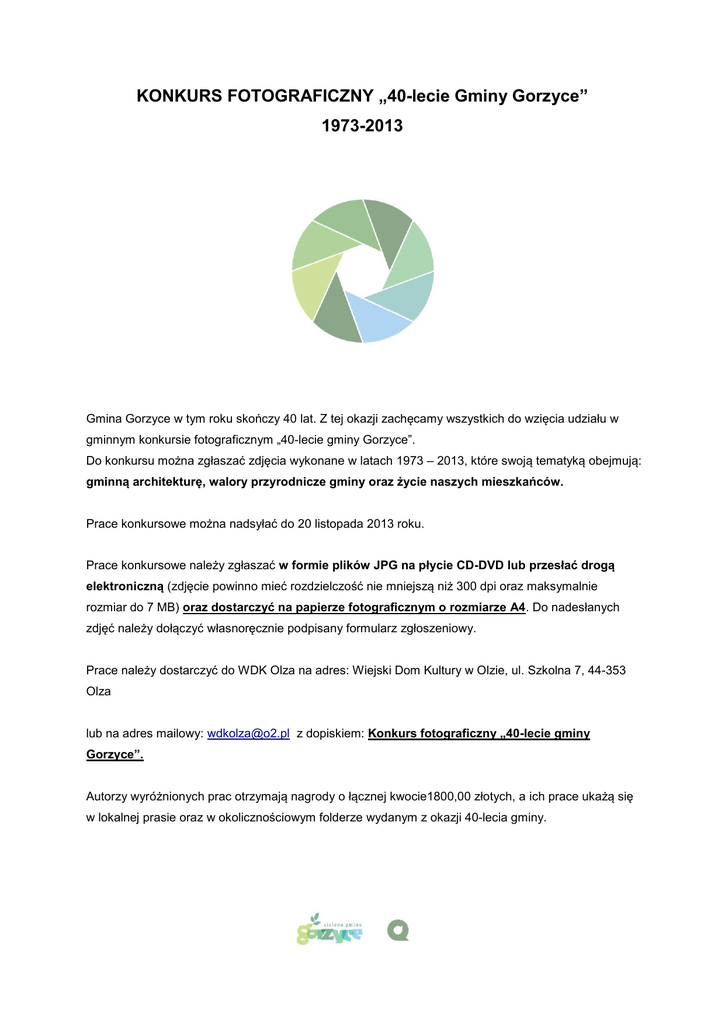 KONKURS FOTOGRAFICZNY „40-lecie Gminy Gorzyce” 1973-2013 Gmina Gorzyce w tym roku skończy 40 lat. Z tej okazji zachęcamy wszystkich do wzięcia udziału w gminnym konkursie fotograficznym „40-lecie gminy Gorzyce”. Do konkursu można zgłaszać zdjęcia wykonane w latach 1973 – 2013, które swoją tematyką obejmują: gminną architekturę, walory przyrodnicze gminy oraz życie naszych mieszkańców. Prace konkursowe można nadsyłać do 20 listopada 2013 roku. Prace konkursowe należy zgłaszać w formie plików JPG na płycie CD-DVD lub przesłać drogą elektroniczną (zdjęcie powinno mieć rozdzielczość nie mniejszą niż 300 dpi oraz maksymalnie rozmiar do 7 MB) oraz dostarczyć na papierze fotograficznym o rozmiarze A4. Do nadesłanych zdjęć należy dołączyć własnoręcznie podpisany formularz zgłoszeniowy. Prace należy dostarczyć do WDK Olza na adres: Wiejski Dom Kultury w Olzie, ul. Szkolna 7, 44-353 Olza lub na adres mailowy: [email protected] z dopiskiem: Konkurs fotograficzny „40-lecie gminy Gorzyce”. Autorzy wyróżnionych prac otrzymają nagrody o łącznej kwocie1800,00 złotych, a ich prace ukażą się w lokalnej prasie oraz w okolicznościowym folderze wydanym z okazji 40-lecia gminy. REGULAMIN KONKURSU FOTOGRAFICZNEGO „40-LECIE GMINY GORZYCE” I Cel Konkursu Celem Konkursu organizowanego przez Gminę Gorzyce jest promocja walorów przyrodniczych i historycznych Gminy Gorzyce oraz aktywizacja mieszkańców do działań promocyjnych na rzecz obchodów 40-lecia gminy Gorzyce. II Organizator i Adresaci Konkursu 1. Organizatorem Konkursu Fotograficznego „40-lecie gminy Gorzyce” jest WDK Olza z siedzibą w Olzie przy ul. Szkolnej 7, zwany dalej „Organizatorem”. 2. Uczestnikami Konkursu mogą być wyłącznie osoby fizyczne, zwane dalej „Uczestnikami”. 3. W sytuacji, gdy Uczestnik nie ukończył osiemnastego roku życia, jego udział w konkursie może się odbyć za pisemną zgodą rodzica lub opiekuna prawnego. III Zasady udziału w Konkursie 1. Uczestnicy mają prawo zgłaszać do Konkursu wyłącznie fotografie, do których posiadają wszelkie prawa autorskie. Uczestnicy Konkursu ponoszą pełną odpowiedzialność związaną z użyciem przesłanych przez siebie fotografii, a w szczególności pełną odpowiedzialność za naruszenie praw osób trzecich. W przypadku wystąpienia przeciwko Organizatorowi przez osobę trzecią z roszczeniami wynikającymi z naruszenia jej praw, Uczestnik zobowiązany jest do ich zaspokojenia i zwolnienia Organizatora z odpowiedzialności. 2. W przypadku naruszenia obowiązującego prawa, praw osób trzecich, a także prób oszustwa, Organizator zastrzega sobie prawo do usunięcia zdjęcia z postępowania konkursowego. Działania Organizatora nie wymagają dla swej ważności przesłania do Uczestnika jakiegokolwiek oświadczenia. Organizator ma również prawo do usunięcia zdjęć bez informowania o tym Uczestnika z innych przyczyn np. gdy zawierają treści obraźliwe, nawołujące do przemocy, odwołujące się do jakiejkolwiek dyskryminacji. 3. Zdjęcia konkursowe powinny być wykonane na terenie Gminy Gorzyce w latach 1973 - 2013, a swoją tematyką powinny obejmować: I – Architekturę Gminy Gorzyce; II – Walory przyrodnicze Gminy Gorzyce; III – Życie człowieka w Gminie Gorzyce; 4. Uczestnik Konkursu może zgłosić maksymalnie 3 zdjęcia, a każde z nich może obejmować inną Tematykę, z zastrzeżeniem, że jedna osoba może zdobyć nagrodę tylko w jednej w wymienionych kategorii. 5. Organizator dopuszcza prace w formie plików JPG na płycie CD-DVD lub przesłane drogą elektroniczną (zdjęcie powinno mieć rozdzielczość nie mniejszą niż 300 dpi oraz maksymalnie rozmiar do 7 MB) oraz dostarczone na papierze fotograficznym o rozmiarze A4. 6. Organizatorzy Konkursu pozostawiają do decyzji Uczestników wybór techniki fotograficznej. 7. Organizatorzy dopuszczają obróbkę komputerową zdjęć zgodne z wizją artystyczną autora fotografii. Zgłoszone do Konkursu zdjęcia mogą być czarno-białe, w sepii lub kolorowe. 8. Do nadesłanych zdjęć należy dołączyć własnoręcznie podpisany Formularz zgłoszeniowy, którego wzór stanowi załącznik nr 1 do regulaminu konkursu. 9. Złożenie Formularza zgłoszeniowego jest warunkiem koniecznym wzięcia udziału w Konkursie. 10. Prace należy dostarczyć na adres: Wiejski Dom Kultury w Olzie, ul. Szkolna 7, 44-353 Olza, lub na adres mailowy: [email protected] z dopiskiem: Konkurs fotograficzny „40-lecie Gminy Gorzyce”. 11. Organizator nie ponosi odpowiedzialności za uszkodzenie i zaginięcie prac w transporcie pocztowym i kurierskim. 12. Organizator zastrzega sobie prawo do wyłączenia z udziału prac, które naruszają Regulamin Konkursu. IV Ocena prac i nagrody w Konkursie 1. Nadzór merytoryczny nad konkursem sprawować będzie Komisja Konkursowa, w skład której wchodzą: Jan Psota, Janusz Ballarin oraz Adam Fichna. 2. Na podstawie dokonanej oceny komisja konkursowa przyzna nagrody za I, II i III miejsce w każdej kategorii tematycznej autorom najlepszych zdjęć. 3. Zdjęcia będą oceniane na podstawie karty ocen, której wzór stanowi załącznik nr 2 do regulaminu. 4.Autorzy wyróżnionych prac otrzymają nagrody w kwotach: - 300,00 zł za zajęcie I miejsca, - 200,00 zł za zajęcie II miejsca oraz - 100,00 zł za zajęcie III miejsca w każdej z kategorii. 7. Prawo do odbioru nagrody może być przeniesione na osobę trzecią, po wcześniejszej konsultacji z Organizatorem konkursu. 8. O wynikach Konkursu laureaci powiadomieni zostaną drogą elektroniczną lub telefonicznie. 9. Zgodnie z postanowieniami Regulaminu, Uczestnicy, którzy zostaną uznani za Zwycięzców, wyrażają zgodę na opublikowanie ich danych osobowych (łącznie z podaniem miejsca zamieszkania) na stronie internetowej zawierającej listę Zwycięzców oraz w materiałach promocyjnych. 10. Terminarz: - nadsyłanie prac: do 20 listopada 2013 r. (