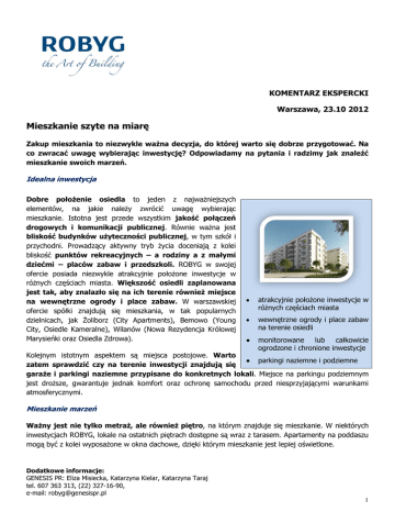 KOMENTARZ EKSPERCKI Warszawa, 23.10 2012 Mieszkanie szyte na miarę Zakup mieszkania to niezwykle ważna decyzja, do której warto się dobrze przygotować. Na co zwracać uwagę wybierając inwestycję? Odpowiadamy na pytania i radzimy jak znaleźć mieszkanie swoich marzeń. Idealna inwestycja Dobre położenie osiedla to jeden z najważniejszych elementów, na jakie należy zwrócić uwagę wybierając mieszkanie. Istotna jest przede wszystkim jakość połączeń drogowych i komunikacji publicznej. Równie ważna jest bliskość budynków użyteczności publicznej, w tym szkół i przychodni. Prowadzący aktywny tryb życia doceniają z kolei bliskość punktów rekreacyjnych – a rodziny a z małymi dziećmi – placów zabaw i przedszkoli. ROBYG w swojej ofercie posiada niezwykle atrakcyjnie położone inwestycje w różnych częściach miasta. Większość osiedli zaplanowana jest tak, aby znalazło się na ich terenie również miejsce na wewnętrzne ogrody i place zabaw. W warszawskiej ofercie spółki znajdują się mieszkania, w tak popularnych dzielnicach, jak Żoliborz (City Apartments), Bemowo (Young City, Osiedle Kameralne), Wilanów (Nowa Rezydencja Królowej Marysieńki oraz Osiedla Zdrowa). atrakcyjnie położone inwestycje w różnych częściach miasta wewnętrzne ogrody i place zabaw na terenie osiedli monitorowane lub całkowicie ogrodzone i chronione inwestycje Kolejnym istotnym aspektem są miejsca postojowe. Warto parkingi naziemne i podziemne zatem sprawdzić czy na terenie inwestycji znajdują się garaże i parkingi naziemne przypisane do konkretnych lokali. Miejsce na parkingu podziemnym jest droższe, gwarantuje jednak komfort oraz ochronę samochodu przed niesprzyjającymi warunkami atmosferycznymi. Mieszkanie marzeń Ważny jest nie tylko metraż, ale również piętro, na którym znajduje się mieszkanie. W niektórych inwestycjach ROBYG, lokale na ostatnich piętrach dostępne są wraz z tarasem. Apartamenty na poddaszu mogą być z kolei wyposażone w okna dachowe, dzięki którym mieszkanie jest lepiej oświetlone. Dodatkowe informacje: GENESIS PR: Eliza Misiecka, Katarzyna Kielar, Katarzyna Taraj tel. 607 363 313, (22) 327-16-90, e-mail: [email protected] 1 Atrakcyjną ofertą są nieco tańsze mieszkania na parterze, które bardzo często posiadają ogródek. Jest to rozwiązanie najczęściej wybierane przez rodziny z małymi dziećmi oraz miłośników czworonogów. Leniwe popołudnie na leżaku na własnym trawniku może być równie relaksujące, jak wypad za miasto. Po wybraniu metrażu i piętra, czas na dobór lokalu. Mieszkania, których okna wychodzą na południe, będą bardziej nasłonecznione, niż te z oknami na północ. Apartamenty zorientowane na wschód będą doskonale oświetlone rano, natomiast te z oknami po stronie zachodniej – po południu. Inwestycje Grupy ROBYG: 5 inwestycji w Warszawie: Osiedle Kameralne to zespół nowoczesnych, 2 i 4-piętrowych budynków, położonych w historycznej części Bemowa – Jelonkach. Niewysoka zabudowa, kameralny charakter inwestycji oraz starannie zaprojektowana zieleń ogrodowa sprawia, że jest to miejsce przyjazne zarówno rodzinom z dziećmi, jak i singlom ceniącym sobie spokój i bliskość natury. Atutem osiedla Young City na warszawskim Bemowie jest niska, czteropiętrowa zabudowa, infrastruktura osiedlowa zakładająca sklepy i usługi oraz bardzo dobra lokalizacja. Inwestycja przewiduje wybudowanie w pierwszych 2 etapach kompleksu 280 lokali o łącznej powierzchni użytkowej wynoszącej około 16.700 mkw. Na kompleks apartamentowców Nowa Rezydencja Królowej Marysieńki w Wilanowie składają się nowoczesne, pięciokondygnacyjne budynki. Etapy osiedla są zamknięte oraz objęte ochroną i monitoringiem. Inwestycja zakłada wybudowanie w 10 etapach kompleksu 1.400 lokali o łącznej powierzchni użytkowej wynoszącej około 113.658 mkw. Osiedle Zdrowa w Wilanowie to pięć pięciokondygnacyjnych zespołów kamienic o podwyższonym standardzie, z dużymi balkonami i tarasami. Osiedle jest objęte ochroną i monitoringiem. Inwestycja składa się z 5 etapów, podczas których zostanie wybudowanych 860 lokali, o łącznej powierzchni użytkowej wynoszącej 63.708 mkw. City Apartments to inwestycja apartamentowa zlokalizowana na Żoliborzu Południowym. Wyróżnia się wysokim standardem wykończenia części wspólnych m.in. przestronnym holem wejściowym zawierającym recepcję. Projekt zakłada wybudowanie łącznie ok. 1200 lokali mieszkalnych i usługowych w 6 etapach. Grupa ROBYG należy do czołówki polskich deweloperów pod względem liczby sprzedanych mieszkań. W ciągu 12 lat działalności firma zrealizowała 7 wieloetapowych inwestycji, obejmujących łącznie około 2670 lokali (do czerwca 2012 roku). Dodatkowe informacje: GENESIS PR: Eliza Misiecka, Katarzyna Kielar, Katarzyna Taraj tel. 607 363 313, (22) 327-16-90, e-mail: [email protected] 2 W połowie 2012 roku ROBYG miał 9 aktywnych inwestycji w toku i około 1133 lokale w swojej ofercie. W Warszawie Grupa prowadzi 5 inwestycji mieszkaniowych: Nowa Rezydencja Królowej Marysieńki, Osiedle Zdrowa, City Apartments, Osiedle Kameralne i Young City oraz jeden projekt komercyjny, ROBYG Business Center w Wilanowie. Natomiast w Gdańsku spółka realizuje 3 inwestycje: Lawendowe Wzgórza, Słoneczna Morena i Albatross Towers. ROBYG SA jest notowana na głównym parkiecie Giełdy Papierów Wartościowych w Warszawie od listopada 2010 roku. Więcej informacji www.robyg.com Dodatkowe informacje: GENESIS PR: Eliza Misiecka, Katarzyna Kielar, Katarzyna Taraj tel. 607 363 313, (22) 327-16-90, e-mail: [email protected] 3