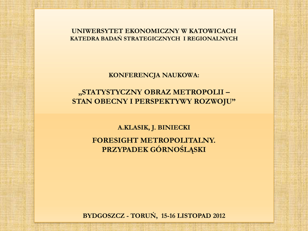 UNIWERSYTET EKONOMICZNY W KATOWICACH KATEDRA BADAŃ STRATEGICZNYCH I REGIONALNYCH KONFERENCJA NAUKOWA: „STATYSTYCZNY OBRAZ METROPOLII – STAN OBECNY I PERSPEKTYWY ROZWOJU” A.KLASIK, J. BINIECKI FORESIGHT METROPOLITALNY. PRZYPADEK GÓRNOŚLĄSKI BYDGOSZCZ - TORUŃ, 15-16 LISTOPAD 2012 SPIS TREŚCI: 1. FORESIGHT METROPOLITALNY. PUNKTY CIĘŻKOŚCI 2. FORESIGHT METROPOLITALNY. PODSTAWOWA IDEA 3. FORESIGHT METROPOLITALNY. GŁÓWNE PRODUKTY 4. FORESIGHT METROPOLITALNY. METODOLOGIA 4.1. LOGIKA STUDIÓW PROSPEKTYWNYCH I ANALIZY STRATEGICZNEJ 4.2. PROCES BUDOWY WIZJI ROZWOJU SEKTORA SZTUK PERFORMATYWNYCH W GÓRNOŚLĄSKIM OBSZARZE METROPOLITALNYM 4.3. PROCES BUDOWY SCENARIUSZY EWOLUCJI OTOCZENIA SEKTORA SZTUK PERFORMATYWNYCH W GÓRNOŚLĄSKIM OBSZARZE METROPOLITALNYM 4.4. PROCES BUDOWY STRATEGII KREACJI OFERTY KULTURALNEJ W GÓRNOŚLĄSKIM OBSZARZE METROPOLITALNYM 5. FORESIGHT METROPOLITALNY. WYNIKI 5.1. KLUCZOWE ZMIENNE JAKO TWORZYWO WIZJI ROZWOJU SEKTORA SZTUK PERFORMATYWNYCH W GÓRNOŚLĄSKIM OBSZARZE METROPOLITALNYM 5.2. STRUKTURA WIZJI ROZWOJU SEKTORA SZTUK PERFORMATYWNYCH W GÓRNOŚLĄSKIM OBSZARZE METROPOLITALNYM 2030 5.3. MAKROUWARUNKOWANIA ROZWOJU SEKTORA SZTUK PERFORMATYWNYCH W GÓRNOŚLĄSKIM OBSZARZE METROPOLITALNYM 5.4. SCENARIUSZE ZEWNĘTRZNYCH UWARUNKOWAŃ ROZWOJU SEKTORA SZTUK PERFORMATYWNYCH W GÓRNOŚLĄSKIM OBSZARZE METROPOLITALNYM DO ROKU 2030 5.5. STRATEGIA KREACJI OFERTY PRODUKTÓW KULTURALNYCH SEKTORA SZTUK PERFORMATYWNYCH W GÓRNOŚLĄSKIM OBSZARZE METROPOLITALNYM. PRIORYTETOWE KIERUNKI DZIAŁAŃ 6. FORESIGHT METROPOLITALNY. UCZESTNICY PANELU „KULTURA” FORESIGHT METROPOLITALNY. PUNKTY CIĘŻKOŚCI IDEA PRODUKTY FORESIGHT METROPOLITALNY WYNIKI METODA FORESIGHT METROPOLITALNY. PODSTAWOWA IDEA PROCESY INNOWACYJNE I PRZEMIANY STRUKTURALNE W WOJEWÓDZTWIE ŚLĄSKIM JAKO REGIONIE POSTINDUSTRIALNYM METROPOLIZACJA AGLOMERACJI GÓRNOŚLĄSKIEJ ROZWÓJ GOSPODARKI KREATYWNEJ ROZWÓJ SEKTORA USŁUG PUBLICZNYCH W GÓRNOŚLĄSKIM OBSZARZE METROPOLITALNYM PRIORYTETOWE TECHNOLOGIE ZRÓWNOWAŻONEGO ROZWOJU WOJEWÓDZTWA ŚLĄSKIEGO FUNKCJE METROPOLITALNE INFORMACJA I KOMUNIKACJA SPOŁECZNA SPECJALISTYCZNA OCHRONA ZDROWIA DZIEDZICTWO I KULTURA WYSOKA NAUKA, BADANIA I DORADZTWO SZKOLNICTWO WYŻSZE TURYSTYKA MIEJSKA I POPRZEMYSŁOWA TRANSPORT I LOGISTYKA ZARZĄDZANIE KORPORACJAMI FINANSE I UBEZPIECZENIA OBSZARY TEMATYCZNE GÓRNOŚLĄSKIEGO FORESIGHTU METROPOLITALNEGO KULTURA ZDROWIE TRANSPORT ŚRODOWISKO DELIMITACJA GÓRNOŚLĄSKIEGO OBSZARU METROPOLITALNEGO FORESIGHT METROPOLITALNY. GŁÓWNE PRODUKTY WIZJE SCENARIUSZE ASPEKT AKSJOLOGICZNY ASPEKT SYTUACYJNY FORESIGHT METROPOLITALNY ASPEKT KREACYJNY STRATEGIE FORESIGHT METROPOLITALNY. LOGIKA STUDIÓW PROSPEKTYWNYCH I ANALIZY STRATEGICZNEJ POTENCJAŁ WEWNĘTRZNY TENDENCJE W OTOCZENIU KLUCZOWE ZMIENNE SIŁY NAPĘDOWE WIZJA SCENARIUSZE ATUTY I DEFICYTY SZANSE I WYZWANIA STRATEGIA OPCJE KIERUNKI PROJEKTY PROCES BUDOWY WIZJI ROZWOJU SEKTORA SZTUK PERFORMATYWNYCH W GÓRNOŚLĄSKIM OBSZARZE METROPOLITALNYM WIZJA ROZWOJU SEKTORA SZTUK PERFORMATYWNYCH W GÓRNOŚLĄSKIM OBSZARZE METROPOLITALNYM ATUTY I DEFICYTY SEKTORA TOMT W GOM MODEL ROZWOJU SEKTORA TOMT W GOM (KRZYŻOWA ANALIZA KLUCZOWYCH ZMIENNYCH) IDENTYFIKACJA OCZEKIWAŃ GŁÓWNYCH UCZESTNIKÓW ROZWOJU SEKTORA TOMT W GOM WIZJE I CELE ROZWOJU SEKTORA TOMT W GOM TESTOWANIE WIZJI I CELÓW Z WYKORZYSTANIEM SCENARIUSZY UWARUNKOWAŃ PROCES BUDOWY SCENARIUSZY EWOLUCJI OTOCZENIA SEKTORA SZTUK PERFORMATYWNYCH W GÓRNOŚLĄSKIM OBSZARZE METROPOLITALNYM SCENARIUSZE ZEWNĘTRZNYCH UWARUNKOWAŃ ROZWOJU KULTURALNEGO GOM ANALIZA STEEP MODEL DYNAMIKI UWARUNKOWAŃ ZEWNĘTRZNYCH (KRZYŻOWA ANALIZA CZYNNIKÓW NAPĘDOWYCH) FORMUŁOWANIE HIPOTEZ EKSPERCKA OCENA HIPOTEZ (DELPHI) MOŻLIWE SCENARIUSZE IDENTYFIKACJA SZANS I WYZWAŃ STOJĄCYCH PRZED SEKTOREM TOMT W GOM PROCES BUDOWY STRATEGII KREACJI OFERTY KULTURALNEJ W GÓRNOŚLĄSKIM OBSZARZE METROPOLITALNYM SKŁADOWE ANALIZY ATUTY WYRÓŻNIAJĄCE X WYZWANIA STRATEGICZNE ELEMENTY STRATEGII OPCJA PUSH PROJEKTY INNOWACYJNE KIERUNKI DZIAŁAŃ SZANSE X DEFICYTY OPCJA PULL INNOWACJE TECHNOLOGICZNE KLUCZOWE ZMIENNE JAKO TWORZYWO WIZJI ROZWOJU SEKTORA SZTUK PERFORMATYWNYCH W GÓRNOŚLĄSKIM OBSZARZE METROPOLITALNYM Z1: Stan istniejących obiektów TOMT wraz z ich otoczeniem Z2: Skala kreacji nowych obiektów sektora TOMT Z3: Poziom zróżnicowania środowisk twórczych GOM i produktów ich działalności Z4: Preferencje władz samorządowych GOM w zakresie wspierania TOMT Z5: Liczba znaczących wydarzeń sektora TOMT organizowanych w GOM z użyciem multimediów Z6: Poziom rozwoju podsektora festiwali w sektorze TOMT w GOM Z7: Ubieganie się Katowic i metropolii Silesia o przyznanie tytułu Europejskiej Stolicy Kultury 2016 Z8: Poziom atrakcyjności oferty kulturalnej TOMT w GOM dla mieszkańców i środowisk biznesowych Z9: Poziom atrakcyjności społeczno - kulturowej GOM STRUKTURA WIZJI ROZWOJU SEKTORA SZTUK PERFORMATYWNYCH W GÓRNOŚLĄSKIM OBSZARZE METROPOLITALNYM 2030 METROPOLITALNA OFERTA KULTURALNA TOŻSAMOŚĆ METROPOLITALNA SPOŁECZNOŚCI LOKALNYCH MIAST GOM ATRAKCYJNOŚĆ SPOŁECZNO – KULTUROWA GOM KREATYWNA GOSPODARKA W MIASTACH GOM OPARTA NA KULTURZE KULTUROWA TRANSFORMACJA PRZESTRZENI MIAST GOM KREACJA DZIEŁ ARTYSTYCZNYCH PRODUKCJA WIELKICH WYDARZEŃ KULTURALNYCH INTEGRACJA SEKTORA TOMT DYSTRYBUCJA I SPRZEDAŻ PRODUKTÓW KULTURALNYCH AKTYWNOŚĆ SEKTORA TOMT FORMY UCZESTNICTWA W KULTURZE ROZWÓJ PRZEMYSŁÓW KULTURY POLITYKA KULTURALNA WŁADZ SAMORZĄDOWYCH REGIONU I MIAST GOM INFRASTRUKTURA MATERIALNA I TECHNOLOGICZNA SEKTORA TOMT FUNDAMENTY ROZWOJU TOMT W GOM KAPITAŁ ŚRODOWISK TWÓRCZYCH SEKTORA TOMT KOMPETENCJE KULTUROWE ODBIORCÓW WYDARZEŃ I PRODUKTÓW SEKTORA TOMT UJĘCIE PRZESTRZENNE WIZJI GÓRNOŚLĄSKIEGO OBSZARU METROPOLITALNEGO Modele organizacji przestrzeni publicznej Model policentryczny organizacji przestrzennej Model bipolarny organizacji przestrzennej Model monocentryczny organizacji przestrzennej Lokalizacja funkcji i usług metropoli