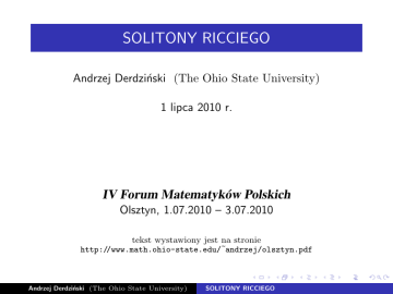 SOLITONY RICCIEGO Andrzej Derdziński (The Ohio State University) 1 lipca 2010 r. IV Forum Matematyków Polskich Olsztyn, 1.07.2010 – 3.07.2010 tekst wystawiony jest na stronie http://www.math.ohio-state.edu/˜andrzej/olsztyn.pdf Andrzej Derdziński (The Ohio State University) SOLITONY RICCIEGO POTOK RICCIEGO W 1981 r. Richard Hamilton wprowadzil potok Ricciego: d g (t) = −2 Ric g (t) , dt którego próbowal użyć do udowodnienia trójwymiarowej hipotezy Poincarégo. ,, Zarys takiego dowodu (,,program Hamiltona ) skladal sieι z calkiem konkretnej serii kroków dowodowych. Przeprowadzić te kroki do samego końca zdolal dopiero Grigorij Perelman (2002). Perelman udowodnil też przy okazji znacznie ogólniejszaι hipotezeι Thurstona o geometryzacji rozmaitości trójwymiarowych. http://www.math.ohio-state.edu/˜andrzej/olsztyn.pdf Andrzej Derdziński (The Ohio State University) SOLITONY RICCIEGO str.1 ROZWIAιZANIA (TRAJEKTORIE) Rozwiaιzania (trajektorie) potoku Ricciego to krzywe t 7→ g (t) zlożone z metryk Riemanna na ustalonej rozmaitości M, wychodzaιce z zadanej metyki poczaιtkowej g (0), i określone na ,, maksymalnym przedziale [0, T ) zmiennej (,,czasu ) t, przy czym 0 < T ≤ ∞. Potok Ricciego deformuje wyjściowa metrykeι Riemanna g (0) w sposób ciaιgly, a w niskich wymiarach czeιsto poprawia przy tym jej wlasności. Kluczowaι czeιściaι argumentu Perelmana byly chirurgie, które trzeba wykonać gdy potok Ricciego napotyka osobliwość w skończonym czasie (T < ∞). Po chirurgii potok Ricciego użyty jest ponownie, w nieco uproszczonej sytuacji topologicznej. http://www.math.ohio-state.edu/˜andrzej/olsztyn.pdf Andrzej Derdziński (The Ohio State University) SOLITONY RICCIEGO str.2 SOLITONY RICCIEGO Soliton Ricciego to metryka Riemanna g , ktoraι potok Ricciego deformuje w sposob nieistotny (wszystkie stadia saι metrykami identycznymi z wyjściowaι z dokladnościaι do dyfeomorfizmu i przeskalowania, tzn. pomnożenia przez stalaι dodatniaι). Równoważnie: Dla jakiegoś pola wektorowego w i stalej λ, ILw g + Ric = λg . (1) ,, Terminu ,,soliton Ricciego uzywa sieι też mówiaιc baιdź o rozmaitości Riemanna (M, g ) spelniajaιcej warunek (1), baιdź o trajektorii t 7→ g (t) potoku Ricciego, której wyjściowe stadium g (0) (lub, rownoważnie, każde stadium g (t)) spelnia warunek (1). http://www.math.ohio-state.edu/˜andrzej/olsztyn.pdf Andrzej Derdziński (The Ohio State University) SOLITONY RICCIEGO str.3 METRYKI EINSTEINA Zupelne niezwarte solitony Ricciego pojawiajaι sieι bardzo czesto ,, jako ,,granice typu homotetii (blow-up limits, rescaling limits) metryk g (t) obcieιtych do odpowiedniego zbioru otwartego, gdy t < T daιży do T, przy czym T < ∞. Istniejaι też ciekawe przyklady solitonów Ricciego na rozmaitościach zwartych, poczynajaιc od metryk Einsteina, zdefiniowanych żaιdaniem by, dla jakiejś stalej λ, Ric = λg . (2) W wymiarach n < 4, każdy zwarty soliton Ricciego jest einsteinowski, a wieιc ma stalaι krzywizneι sekcyjnaι (Hamilton, 1986; Ivey, 1993). http://www.math.ohio-state.edu/˜andrzej/olsztyn.pdf str.4 Andrzej Derdziński (The Ohio State University) SOLITONY RICCIEGO KONSTRUKCJA KOISO-CAO Koiso (1990) i, niezależnie, Cao (1996) skonstuowali pierwsze przyklady nie-einsteinowskich zwartych solitonów Ricciego, reprezentujaιcych wszystkie parzyste wymiary n ≥ 4. Przyklady ich stanowiaι solitony Kählera-Ricciego, tzn. saι jednocześnie solitonami Ricciego i rozmaitościami Kählera. Iloczyn kartezjański dwóch solitonów Ricciego o tej samej stalej λ jest znowu solitonem Ricciego. Powstajaι w ten sposób przyklady ,, zwarte, nie-einsteinowskie i ,,wlaściwie nie-kählerowskie, we wszystkich wymiarach n ≥ 7. http://www.math.ohio-state.edu/˜andrzej/olsztyn.pdf Andrzej Derdziński (The Ohio State University) SOLITONY RICCIEGO str.5 PROBLEM OTWARTY (TIAN, CAO) Czy istnieje zwarty soliton Ricciego, ktory nie jest ani einsteinowski, ani lokalnie kählerowski, i nie jest lokalnie rozkladalny w iloczyn kartezjański rozmaitości niższych wymiarów? Przyklad o tych wlasnościach, jeśli istnieje, musi mieć dodatniaι stalaι λ i niestalaι, wszeιdzie dodatniaι, krzywizneι skalarnaι. Powód: zwarte solitony Ricciego nie spelniajaιce któregoś z tych warunków saι automatycznie einsteinowskie (Bourguignon, 1974; Friedan, 1985; Ivey, 1993). Z tego samego powodu, przyklad taki musialby też mieć wymiar n ≥ 4 (Hamilton, 1986; Ivey, 1993). http://www.math.ohio-state.edu/˜andrzej/olsztyn.pdf Andrzej Derdziński (The Ohio State University) SOLITONY RICCIEGO str.6 THE NO-BREATHERS THEOREM (PERELMAN, 2002) Jeśli w trajektorii t 7→ g (t) potoku Ricciego, na rozmaitości zwartej, istniejaι choćby dwie różne wartości czasu t, takie że odpowiadajaιce im stadia saι ze sobaι identyczne modulo dyfeomorfizm i przeskalowanie, to trajektoria jest solitonem Ricciego. W wymiarze 3 twierdzenie to udowodnil Ivey (1993). http://www.math.ohio-state.edu/˜andrzej/olsztyn.pdf Andrzej Derdziński (The Ohio State University) SOLITONY RICCIEGO str.7 KANONICZNE METRYKI KÄHLERA Na zwartych powierzchniach zespolonych o dodatniej baιdź ujemnej pierwszej klasie Cherna c1 , solitony Kählera-Ricciego stanowiaι ,, ,, naturalny wybór metryki ,,wyróżnionej czy też ,,kanonicznej . Ściślej mówiaιc, na powierzchni takiej istnieje soliton Kählera-Ricciego, i jest on jedyny z dokladnościaι do dzialania skladowej jedności grupy automorfizmów zespolonych oraz przeskalowań. http://www.math.ohio-state.edu/˜andrzej/olsztyn.pdf Andrzej Derdziński (The Ohio State University) SOLITONY RICCIEGO str.8 Powyższe stwierdzenie jest podsumowaniem szeregu wyników, niektórych już klasycznych, niektórych nowszych, do ktorych należaι: • dowody hipotezy Calabiego o istnieniu metryki Kählera-Einsteina jeśli c1 < 0 (Aubin 1978; Yau 1978), • twierdzenia o jedyności metryk Kählera-Einsteina (Calabi 1957, dla c1 <