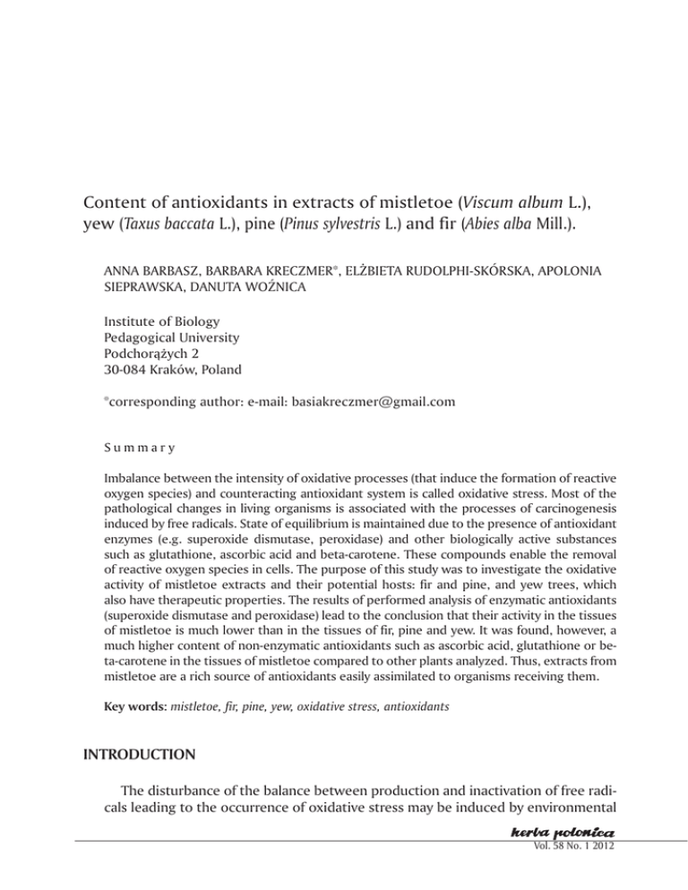Content of antioxidants in extracts of mistletoe (Viscum album L.), yew (Taxus baccata L.), pine (Pinus sylvestris L.) and fir (Abies alba Mill.). ANNA BARBASZ, BARBARA KRECZMER*, ELŻBIETA RUDOLPHI-SKÓRSKA, APOLONIA SIEPRAWSKA, DANUTA WOŹNICA Institute of Biology Pedagogical University Podchorążych 2 30-084 Kraków, Poland *corresponding author: e-mail: [email protected] Summary Imbalance between the intensity of oxidative processes (that induce the formation of reactive oxygen species) and counteracting antioxidant system is called oxidative stress. Most of the pathological changes in living organisms is associated with the processes of carcinogenesis induced by free radicals. State of equilibrium is maintained due to the presence of antioxidant enzymes (e.g. superoxide dismutase, peroxidase) and other biologically active substances such as glutathione, ascorbic acid and beta-carotene. These compounds enable the removal of reactive oxygen species in cells. The purpose of this study was to investigate the oxidative activity of mistletoe extracts and their potential hosts: fir and pine, and yew trees, which also have therapeutic properties. The results of performed analysis of enzymatic antioxidants (superoxide dismutase and peroxidase) lead to the conclusion that their activity in the tissues of mistletoe is much lower than in the tissues of fir, pine and yew. It was found, however, a much higher content of non-enzymatic antioxidants such as ascorbic acid, glutathione or beta-carotene in the tissues of mistletoe compared to other plants analyzed. Thus, extracts from mistletoe are a rich source of antioxidants easily assimilated to organisms receiving them. Key words: mistletoe, fir, pine, yew, oxidative stress, antioxidants INTRODUCTION The disturbance of the balance between production and inactivation of free radicals leading to the occurrence of oxidative stress may be induced by environmental Vol. 58 No. 1 2012 A. Barbasz, B.Kreczmer, E.Rudolphi-Skórska et al. 28 factors such as pollution, extreme temperatures and shortages of water [1] but also by natural metabolic processes occurring in cells. Cancers, like many other human diseases are associated with the formation of reactive oxygen species (ROS) in the cells, which react with components of cells (nucleic acids, lipids, proteins) causing their serious damage [2]. To scavenge ROS and alleviate their deleterious organism in the course of the evolution effects have evolved various defense mechanisms involving enzymatic and non-enzimatic antioxidant systems [3]. Enzimatic antioxidants include superoxide dismutase (SOD, EC 1.15.1.1), catalase (CAT, EC 1.11.16), peroxidase (POD, EC 1.11.1.7) as well as non-enzimatic antioxidants including glutathione, ascorbic acid and carotenoids. Among ROS-scavenging enzymes, SOD rapidly catalyzes the dismutation of O2·_ to H2O2 and O2· H2O2 is scavenged by peroxidase and by the ascorbate-glutathione cycle. Glutathione (GSH) is a major antioxidant involved in the protection of cellular structures through the direct binding of free radicals, and by maintaining an appropriate redox status of cells. Glutathione is also involved in the regeneration of reduced forms of ascorbic acid and tocopherol in the cells. The reduction in the glutathione content results in simultaneous lowering of ascorbic acid level which indicates a close associatd of the effects of glutathione, ascorbic acid and tocopherol [4]. Therefore, natural sources of antioxidants which could be used for medical purposes are sought [5]. Extracts of mistletoe (Viscum album) are used for treatment of many diseases such as cancer, hypertension, and diabetes. They have also immunomodulatory [6] and antibacterial [7] properties. Therefore, it seemed interesting to examine the oxidative activity of extracts of mistletoe (Viscum album) as well as of the tissues of its potential hosts i.e. firs and pines. Due to similar therapeutic effects observed for extract from the needles of yew trees (Taxus baccata L.), this material was also tested for comparison. MATERIALS AND METHODS Leaves of white mistletoe (Viscum album L.), and the needles of fir (Abies alba Mill.), yew (Taxus baccata L. Fastigiata) and Scots pine (Pinus sylvestris L.) were used in the study. Mistletoe, fir and pine were collected in Czasław ( Racichowice community near Kraków). Habitat was a mixed forest with a predominance of coniferous trees. Yew were collected within a private estate in Łapanów (Łapanów community near Kraków). Leaves of mistletoe were collected in spring (April), summer (August), autumn (October) and winter (December-January), each time from the same fir tree. Fir, yew and pine needles from spring growth were collected during the period April-May. Plant material was frozen with liquid nitrogen and kept at –80° C for biochemical analysis. Activity of antioxidant enzymes Approximately 0.1 g of tissue was homogenized at 4°C in a solution containing 0.1% bovine serum albumin (BSA). For removing low-molecular substances Content of antioxidants in extracts of mistletoe, yew, pine and fir 29 homogenate was centrifuged for 10 minutes at 14 000 x g. The obtained supernatant was dialyzed for 8–12 hours in dialysis sacks (SIGMA) immersed in phosphate buffer (0.05 M, pH 7.0) at 4°C. After cleaning, the activity of superoxide dismutases, peroxidases, and the protein content was measured in the supernatant. Superoxide dismutases (SOD) SOD activity was determined spectrophotometrically using cytochrome [8] as a substance undergoing oxidation. The reaction mixture contained 0.1 mM EDTA, 1 mM cytochrome c, 1 mM xanthine, and phosphate buffer pH 7.8. The mixture was aerated by stirring on a magnetic stirrer for 2.5 hours. Then, 8–10 × 10-3 cm3 oxidase (activity 50U, Grade I, Sigma) was introduced to the reaction mixture. Reaction kinetics was studied spectrophotometrically at 550 nm for 2 minutes. The amount of enzyme which causes 50% decrease of rate of cyto