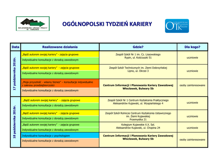 OGÓLNOPOLSKI TYDZIEŃ KARIERY D at a Realizowane działania 17 października 2016r. „Bądź autorem swojej kariery” - zajęcia grupowe Indywidualne konsultacje z doradcą zawodowym „Bądź autorem swojej kariery” - zajęcia grupowe Indywidualne konsultacje z doradcą zawodowym „Moja przyszłość - własny biznes” – konsultacje indywidualne z zakresu przedsiębiorczości Indywidualne konsultacje z doradcą zawodowym 18 października 2016r. „Bądź autorem swojej kariery” - zajęcia grupowe Indywidualne konsultacje z doradcą zawodowym „Bądź autorem swojej kariery” - zajęcia grupowe Indywidualne konsultacje z doradcą zawodowym „Bądź autorem swojej kariery” - zajęcia grupowe Indywidualne konsultacje z doradcą zawodowym Indywidualne konsultacje z psychologiem Indywidualne konsultacje z doradcą zawodowym Gdzie? Dla kogo? Zespół Szkół Nr 1 im. Cz. Lissowskiego Rypin, ul. Kościuszki 51 uczniowie Zespół Szkół Technicznych im. Ziemi Dobrzyńskiej Lipno, ul. Okrzei 3 uczniowie Centrum Informacji i Planowania Kariery Zawodowej Włocławek, Bulwary 5b osoby zainteresowane Zespół Szkół Nr 1 Centrum Kształcenia Praktycznego Aleksandrów Kujawski, ul. Wyspiańskiego 4 uczniowie Zespół Szkół Rolnicze Centrum Kształcenia Ustawicznego im. Ziemi Kujawskiej Przemystka 21 uczniowie Kolegium Kujawskie X.X. Sal. Aleksandrów Kujawski, ul. Chopina 24 uczniowie Centrum Informacji i Planowania Kariery Zawodowej Włocławek, Bulwary 5b osoby zainteresowane 19 października 2016r. 20 października 2016r. „Bądź autorem swojej kariery” - zajęcia grupowe uczniowie Zespół Szkół Centrum Kształcenia Rolniczego im. J. Dziubińskiej Stary Brześć uczniowie Centrum Informacji i Planowania Kariery Zawodowej Włocławek, Bulwary 5b osoby zainteresowane Zespół Szkół Nr 4 im. Ziemi Dobrzyńskiej Nadróż uczniowie Zespół Szkół Centrum Kształcenia Rolniczego im. K. Wielkiego Kowal, ul. K. Wielkiego 9 uczniowie Centrum Informacji i Planowania Kariery Zawodowej Włocławek, Bulwary 5b osoby zainteresowane Zespół Szkół i Placówek im. Wł. Łokietka Radziejów, ul. Szkolna 12 uczniowie Zespół Szkół im. Zw. Młodzieży Wiejskiej Dobrzyń nad Wisłą, ul. Szkolna 5 uczniowie Centrum Informacji i Planowania Kariery Zawodowej Włocławek, Bulwary 5b osoby zainteresowane Indywidualne konsultacje z doradcą zawodowym „Bądź autorem swojej kariery” - zajęcia grupowe Indywidualne konsultacje z doradcą zawodowym „Bądź autorem swojej kariery” - zajęcia grupowe z młodzieżą* „Bądź autorem swojej kariery” - zajęcia grupowe Indywidualne konsultacje z doradcą zawodowym „Bądź autorem swojej kariery” - zajęcia grupowe Indywidualne konsultacje z doradcą zawodowym Indywidualne konsultacje z doradcą zawodowym „Bądź autorem swojej kariery” - zajęcia grupowe 21 października 2016r. Zespół Szkół im. W. Łukasińskiego Skępe, ul. Wymyślińska 2 Indywidualne konsultacje z doradcą zawodowym „Bądź autorem swojej kariery” - zajęcia grupowe Indywidualne konsultacje z doradcą zawodowym „Moja przyszłość - własny biznes” – konsultacje indywidualne z zakresu przedsiębiorczości Indywidualne konsultacje z doradcą zawodowym *Osoby zainteresowane udziałem prosimy o zgłaszanie chęci udziału w zajęciach najpóźniej do 12 października 2016r. telefonicznie pod numerem 54 411 21 40, emaill: [email protected] lub osobiście w Centrum Informacji i Planowania Kariery Zawodowej we Włocławku, Bulwary 5B.