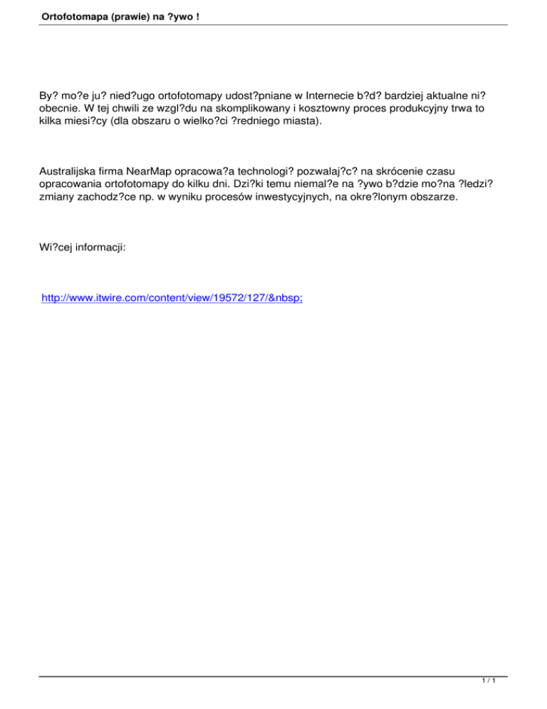 Ortofotomapa (prawie) na ?ywo ! By? mo?e ju? nied?ugo ortofotomapy udost?pniane w Internecie b?d? bardziej aktualne ni? obecnie. W tej chwili ze wzgl?du na skomplikowany i kosztowny proces produkcyjny trwa to kilka miesi?cy (dla obszaru o wielko?ci ?redniego miasta). Australijska firma NearMap opracowa?a technologi? pozwalaj?c? na skrócenie czasu opracowania ortofotomapy do kilku dni. Dzi?ki temu niemal?e na ?ywo b?dzie mo?na ?ledzi? zmiany zachodz?ce np. w wyniku procesów inwestycyjnych, na okre?lonym obszarze. Wi?cej informacji: http://www.itwire.com/content/view/19572/127/ 1/1