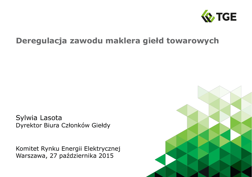 Deregulacja zawodu maklera giełd towarowych Sylwia Lasota Dyrektor Biura Członków Giełdy Komitet Rynku Energii Elektrycznej Warszawa, 27 października 2015 Strona Agenda Zmiany w Ustawie o giełdach towarowych 3 Wymagania dla osób uprawnionych do zawierania transakcji na RTG 5 Uzyskanie certyfikatu Maklera Giełdowego na RTG 9 Nowe wzory wniosków na RTG 10 Zmiany w Ustawie o giełdach towarowych W dniu 30 listopada 2015 r. wchodzi w życie Ustawa z dnia 5 sierpnia 2015 r. o zmianie ustaw regulujących warunki dostępu do wykonywania niektórych zawodów, która m. in. nowelizuje Ustawę z dnia 26 października 2000 r. o giełdach towarowych w obszarze maklerów giełd towarowych. Główne zmiany to:  deregulacja zawodu maklera giełd towarowych poprzez usunięcie przepisów regulujących status prawny i zasady wykonywania tego zawodu 3 Kto może reprezentować CG na RTG - od 30 listopada 2015 r.  osoba spełniająca wymogi określone w Ustawie o giełdach towarowych  osoba spełniająca wymogi określone przez TGE – zgłoszona przez Członka Giełdy do reprezentowania w transakcjach giełdowych na RTG  szkolenie egzamin na RTG Certyfikat Maklera Giełdowego na RTG 4 Wymogi dla Maklera Giełdowego na RTG – art. 41 a ust. 1 Ustawy o giełdach towarowych Członkowie Giełdy mogą być reprezentowani na RTG przez osoby, które spełniają następujące wymagania:  dają rękojmię należytego wykonywania obowiązków, w szczególności mają odpowiednią wiedzę, kwalifikacje, umiejętności i doświadczenie;  mają pełną zdolność do czynności prawnych;  korzystają z pełni praw publicznych  nie były uznane prawomocnym orzeczeniem za winne przestępstwa skarbowego, przestępstwa przeciwko wiarygodności dokumentów, mieniu, obrotowi gospodarczemu, obrotowi pieniędzmi i papierami wartościowymi, przestępstwa lub wykroczenia określonego w art. 305, art. 307 lub art. 308 ustawy z dnia 30 czerwca 2000 r. – Prawo własności przemysłowej (Dz. U. z 2013 r. poz. 1410 oraz z 2015 r. poz. 1266 i 1505), przestępstwa określonego w ustawie z dnia 29 lipca 2005 r. o ofercie publicznej i warunkach wprowadzania instrumentów finansowych do zorganizowanego systemu obrotu oraz o spółkach publicznych, przestępstwa określonego w ustawie z dnia 29 lipca 2005 r. o nadzorze nad rynkiem kapitałowym lub przestępstwa określonego w niniejszej ustawie Członkowie Giełdy mają obowiązek wprowadzić i stosować regulacje wewnętrzne określające sposób weryfikacji spełniania wymogów przez osoby, które będą zawierać transakcje na RTG. Członkowie Giełdy potwierdzają weryfikację spełniania ww. wymogów odpowiednim dokumentem. 5 Szkolenia dla kandydatów na Maklera Giełdowego na RTG  Regulacje - Szczegółowe zasady przeprowadzenia szkolenia przez Towarową Giełdę Energii S.A. na Rynku Towarów Giełdowych  Szkolenie obowiązkowe dla kandydatów na maklerów giełdowych na RTG - zakres tematyczny:  Regulamin obrotu Rynku Towarów Giełdowych Towarowej Giełdy Energii S.A.,  Regulamin Rejestru Świadectw Pochodzenia,  Regulamin Rejestru Gwarancji Pochodzenia,  pozostałe przepisy regulujące działanie Członka Giełdy na RTG,  zagadnienia z zakresu funkcjonowania rynków towarowych na świecie,  zagadnienia z zakresu praktycznej obsługi systemów informatycznych TGE  Szkolenie fakultatywne z zakresu praktycznej obsługi systemów informatycznych giełdy – zakres tematyczny:  przekazywanie, modyfikowanie i anulowanie zleceń  otrzymywanie informacji o zleceniach i zawartych transakcjach  personalizacja ustawień aplikacji maklerskiej a w szczególności mających na celu przeciwdziałanie manipulacji  zagadnienia istotne dla bezpieczeństwa uczestnictwa w sesjach giełdowych 6 Egzamin dla kandydatów na maklerów giełdowych na RTG  Egzamin dla osób, które odbyły obowiązkowe szkolenie teoretyczne w formie testu:  Trwa 45 min  Formularz egzaminacyjny składa się z 30 pytań testowych  Za każdą poprawną odpowiedź przyznawany jest 1 punkt  Pozytywny wynik to przynajmniej 20 punktów  Egzamin nadzorowany przez Komisję egzaminacyjną  Wynik egzaminu podawany w przeciągu 3 dni od daty egzaminu  Od wyniku egzaminu można się odwołać do Komisji odwoławczej  Pozytywny wynik egzaminu poświadczony Certyfikatem Maklera Giełdowego, upoważniającym do reprezentowania Członka Giełdy na RTG w transakcjach giełdowych na Rynku Towarów Giełdowych oraz korzystania z systemów informatycznych giełdy 7 Harmonogram szkoleń i egzaminów na RTG  Szkolenia i egzaminy są organizowane we współpracy: TGE, IRGiT, ZMiD Listopad 2015 Pn Wt Śr C zw Pt So Nd 1 2 3 4 5 6 7 8 9 10 11 12 13 14 15 16 17 18 19 20 21 22 23 24 25 26 27 28 29 30 Grudzień 2015 Pn Wt Śr C zw Pt So Nd 1 2 3 4 5 6 7 8 9 10 11 12 13 14 15 16 17 18 19 20 szkolenie teoretyczne RTG (godz. 9.00 - 17.00) 21 22 23 24 25 26 27 egzamin RTG (godz. 11.00) 28 29 30 31  Legenda: szkolenie praktyczne z systemu notującego i rozliczeniowego Wnioski o przeprowadzenie szkolenia / egzaminu należy składać do Biura Członków Giełdy [email protected] 8 Certyfikowanie Maklerów Giełdowych na RTG – od 30 listopada 2015 r.  Certyfikat Maklera Giełdowego na RTG bez dodatkowych egzaminów otrzymają:  osoby wpisane na Listę maklerów upoważnionych do reprezentowania Członka Giełdy na RTG, które zostały przeszkolone przez TGE i zdały egzamin z zakresu praktycznej obsługi systemów informatycznych - osoby obecnie reprezentujące CG na RTG w transakcjach giełdowych;  osoby, które nie są wpisane na Listę maklerów upoważnionych do reprezentowania CG na RTG, a reprezentowały CG w ciągu ostatnich 12 miesięcy w transakcjach giełdowych, uzyskają certyfikat Maklera Giełdowego na Rynku Towarów Giełdowych po wpisaniu ich przez CG na Listę maklerów upoważnionych do reprezentowania Wnioskodawcy na TGE.  Certyfikat Maklera Giełdowego na RTG po odbyciu szkolenia i zdaniu egzaminu otrzymają:  osoby, które nie 