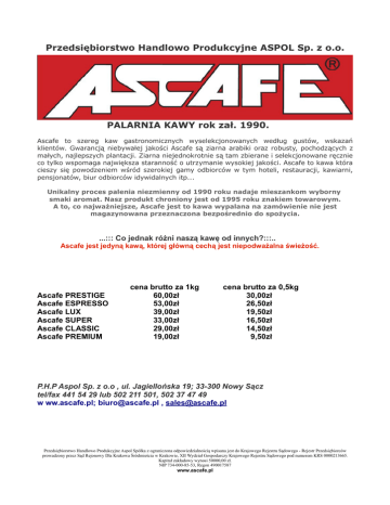 Przedsiębiorstwo Handlowo Produkcyjne ASPOL Sp. z o.o. PALARNIA KAWY rok zał. 1990. Ascafe to szereg kaw gastronomicznych wyselekcjonowanych według gustów, wskazań klientów. Gwarancją niebywałej jakości Ascafe są ziarna arabiki oraz robusty, pochodzących z małych, najlepszych plantacji. Ziarna niejednokrotnie są tam zbierane i selekcjonowane ręcznie co tylko wspomaga największa staranność o utrzymanie wysokiej jakości. Ascafe to kawa która cieszy się powodzeniem wśród szerokiej gamy odbiorców w tym hoteli, restauracji, kawiarni, pensjonatów, biur odbiorców idywidalnych itp... Unikalny proces palenia niezmienny od 1990 roku nadaje mieszankom wyborny smaki aromat. Nasz produkt chroniony jest od 1995 roku znakiem towarowym. A to, co najważniejsze, Ascafe jest to kawa wypalana na zamówienie nie jest magazynowana przeznaczona bezpośrednio do spożycia. ...::: Co jednak różni naszą kawę od innych?:::.. Ascafe jest jedyną kawą, której główną cechą jest niepodważalna świeżość. Ascafe PRESTIGE Ascafe ESPRESSO Ascafe LUX Ascafe SUPER Ascafe CLASSIC Ascafe PREMIUM cena brutto za 1kg 60,00zł 53,00zł 39,00zł 33,00zł 29,00zł 19,00zł cena brutto za 0,5kg 30,00zł 26,50zł 19,50zł 16,50zł 14,50zł 9,50zł P.H.P Aspol Sp. z o.o , ul. Jagiellońska 19; 33-300 Nowy Sącz tel/fax 441 54 29 lub 502 211 501, 502 37 47 49 w ww.ascafe.pl; [email protected] , [email protected] Przedsiębiorstwo Handlowo Produkcyjne Aspol Spółka z ograniczona odpowiedzialnością wpisana jest do Krajowego Rejestru Sądowego - Rejestr Przedsiębiorców prowadzony przez Sąd Rejonowy Dla Krakowa Śródmieścia w Krakowie, XII Wydział Gospodarczy Krajowego Rejestru Sądowego pod numerem KRS 0000213665. Kapitał zakładowy wynosi 50000,00 zł. NIP 734-000-85-53, Regon 490017587 www.ascafe.pl Ascafe Prestige 100% Arabica Lata doświadczenia pozwoliły nam wydobyć z kawy to co najlepsze stworzona by cieszyć koneserów. Mieszanka dobrana z największa starannością gwarantuje doskonały smak o bogatym niepwtarzalnym charakterze. Mieszanka arabik z Ameryki Środkowej, Aperyki połudnowej oraz Afryki z lekką nutą kawy indyjskiej.Miesznka kawa doskonale nadająca się do przygotowania w ekspresach ciśnieniowych, automatycznych. Sposób palenia: Bardzo jasny cynamonowy kolor palenia nadaje kawie charakterystyczny smak bez cienia goryczki, z lekką nuta kwaskowości. Ascafe Espresso 100% Arabica Gatunki kaw z plantacji o najwyższej jakości nadają naparowi doskonałe walory smakowe. Kawa przygotowana w stylu włoskim nadaje mieszance dziki charakter. Mieszanka pięciu gatunków kaw z obu Ameryk oraz Afryki.Doskonała do ekspresów ciśnieniowych automatycznych, ekspresów przelawowych, jak i do tradycyjnego zalewania. Sposób palenia: Mocniejszy sposób palenia z błyszcząca powłoka nadają kawie specyficzny chararakter. Ascafe Lux 100% Arabica Mieszana kaw, która otrzymała uznanie i dyplom wyróżniający za jej nieprzeciętny smak oraz atrakcyjna cenę. Jedna z pierwszych mieszanek produkowanych przez naszą palarnię. Niezmienny od lat skład gwarantują najwyższą jakość produktu. Mieszanka kaw z obu Ameryk oraz kawy indyjskiej monsoon malabar. Kawa doskonała do przyrządznia w ekspresach ciśnieniowych, podawania cappucino, jak i tradycyjnego parzenia. Najlepiej smakuje przygotowana w włoskim zaaparzaczu lub tyglu. Sposób palenia Palenie w kolorze kasztanowym nadaje mieszance łagodny i delikatny smak, kawa malabar dodaje niespotykanego pikantnego smaku chrakterystycznego dla kawy monsunowanej. Ascafe Super Specjalnie dobrane ziarna arabik i robusty nadają mieszance wyraźny i mocny charakter. Napar dzięki odrobinie robusty daje długotrwały efekt smaku. Mieszanka kaw z Afryki ioraz Ameryki. Sposób palenia Niezmienny od lat sposób palenia powoduje, iż kawa w pełni oddaje swoje walory smakowe. Świeżo palone ziarna kaw gwarantują doskonały smak i aromat napoju. Ascafe Classic Mieszanka arabiki i robusty o mocnym wyrafinowany smaku.Pełny i bogaty smak kawy o zdecydowany charakterze. Mieszanka kaw z Afryki oraz Azji. Sposób palenia Lekko błyszczący styl palenia nadaje kawie zdecydowany mocny smak lecz bez wyraźnej goryczy charakterystycznej dla kaw ciemnych. Ascafe Premium Mieszanka robust o zdecydowanym smaku. Filiżanka kawy daje bardzo mocny bogaty i silny napar, bardzo duża zawartość kofeiny. Sposób palenia Jasny styl palenia kawy powoduje, iż kawa nie nabiera goryczy a zamiast tego mieni się lekko orzechowym akcentem. P.H.P Aspol Sp. z o.o , ul. Jagiellońska 19; 33-300 Nowy Sącz tel/fax 441 54 29 lub 502 211 501, 502 37 47 49 www.ascafe.pl; [email protected] , [email protected] Przy zamówieniu powyżej 300zł oraz wpłacie na konto lub pobranie dostawa gratis. Możliwość zamówienia kawy mielonej lub ziarnistej. Przedsiębiorstwo Handlowo Produkcyjne Aspol Spółka z ograniczona odpowiedzialnością wpisana jest do Krajowego Rejestru Sądowego - Rejestr Przedsiębiorców prowadzony przez Sąd Rejonowy Dla Krakowa Śródmieścia w Krakowie, XII Wydział Gospodarczy Krajowego Rejestru Sądowego pod numerem KRS 0000213665. Kapitał zakładowy wynosi 50000,00 zł. NIP 734-000-85-53, Regon 490017587 www.ascafe.pl