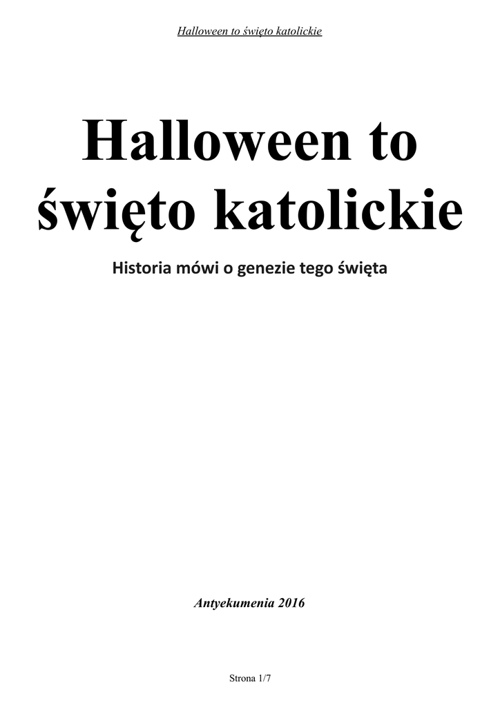 Halloween to święto katolickie Halloween to święto katolickie Historia mówi o genezie tego święta Antyekumenia 2016 Strona 1/7 Halloween to święto katolickie Sama nazwa Halloween przyprawia niejednego Polaka o gęsia skórę. Kiedy jednak przyjrzymy się bliżej genezie tego święta i etymologii słowa Halloween, szybko uświadomimy sobie, ze jest ona powiązana z katolicyzmem. Jak zrozumieć święto Halloween? W historii Europy istniały liczne plemiona pogańskie, które świętowały swoje święta i czciły swoich bożków. Przyjrzyjmy się dwóm z nich- Celtom oraz Słowianom. Celtowie. Źródło: Wikipedia Mapka pokazuje maksymalny zasięg plemion Celtyckich. Później Celtów zepchnięto na wyspy Brytyjskie oraz do Irlandii. Wraz z przemieszczaniem się po Europie zostawili oni tam piętno swoich wierzeń oraz świąt. Na czele plemion stali kapłani zwani Druidami. Ich obrzędy przeprowadzano w świętych gajach a ich najświętszym drzewem był dąb. Druidzi praktykowali rożne rytuały jak „rytuał dębu i jemioły” oraz czynili ofiary z ludzi dla demonów. Ofiary były wieszane dla bożka Esusa, podpalane dla Taranisa oraz topione dla Toutatisa. Według historii- osoby zostały umieszczane w „wiklinowym człowieku” i spalane żywcem na ofiarę. W Irlandii miesiąc Listopad nazywa się Samhain i jednocześnie oznacza nazwę na święto. W Irlandii nazywają Halloween, Oíche Shamhna, co oznacza Wigilie Samhain. Samhain jest jednym z czterech festiwali obok Imbolc, Beltane oraz Lughnasadh. Samhain to tez ostatnie żniwa. Strona 1/7 Halloween to święto katolickie Każde z obrzędów i „zabaw”, które widzisz dziś w Halloween pochodzi od Druidów. Samhain był Nowym Rokiem dla Celtów i charakteryzował się momentem, gdy portal do świata zmarłych miał być otwierany na oścież i zwykły śmiertelnik mógł nawiązać z nimi kontakt. W rożnych plemionach celtyckich czcili władce zmarłych zwanego różnie- Donn, Arawn, Samhain czy Gwyn ap Nudd Świat zmarłych u Celtów nazywa się Mag Mell czy Annwn. Słowianie. Źródło: Wikipedia Słowianie graniczyli swego czasu z Celtami. Słowianie mieli bardzo podobna religie. U Słowian Samhain nazywał się Dziady. Istnieje również wiele podobieństw między świętem Samhain a Świętami Bożego Narodzenia (jak np. kolędowanie). U plemion Słowian znajdowali się kapłani, zwani tam Żercy oraz Wołchwowie. Pierwszy typ zajmował się ofiarami, świętami, wróżeniem i małżeństwami. Wołchwowie to szamani. Strona 1/7 Halloween to święto katolickie Żercy związani byli z demonem śmierci, Welesem, który jest centrum święta, odpowiednika Halloween, zwanego Dziady. Podczas Dziadów odbywa się dokładnie to samo co podczas Halloween- otwiera się portal między „zmarłymi” a żywymi i oni maja nawiedzać domostwa. Dla porównania, u Słowian to Weles ma zarządzać „zmarłymi” w miejscu zwanym Nawia. Inne kultury Podobne święta to Dzień Zmarłych w Meksyku (który poświęcony był Mictecacihuatldemonowi Azteckiego świata umarłych, zwanego Mictlan), Pitru Paksha (Hinduski Halloween ku czci bożka śmierci- Jamy. „Zmarli” maja opuszczać miejsce zwane Pitru–loka, Hinduski czyściec i przebywać z żywymi przez cały miesiąc. Pitru-loka ma otwierać się gdy słonce wchodzi w znak zodiaku Wagi, a powracać do tego miejsca, gdy słonce wchodzi w Skorpiona) czy chociażby Festiwal Duchów w Chinach. Etymologia słowa Halloween: Czym jest owy tajemniczy Halloween? Aby to zrozumieć przyjrzyjmy się co oznacza w języku angielskim. Halloween to jedno z trzech świąt ustanowionych przez papiestwo. Jest to jeden dzień z tzw. triduum zwanego po angielsku Allhallowtide. W skład Allhallowtide wchodzą: • Halloween (All Hallows' Eve)- dosłownie Wigilia bądź Wieczór Wszystkich „Świętych” • All Hallows'/ Hallowmass(dosłownie msza za „świętych”) czyli w Polsce znane jako Wszystkich Świętych • All Souls' Day to Zaduszki Hallow nie jest żadnym strasznym słowem, ale nieco już archaicznym na „świętego”. W Biblii Króla Jakuba to słówko użyte jest w Modlitwie: „Ojcze nasz...Święć się imię twoje”. Po angielsku to brzmi: „Our Father...Hallowed be thy name”. Współcześnie ludzie powiedzieli by raczej Saint. Oczywiście należy dodać, ze system katolicki wypaczył wszystko włączając to kto właściwie jest tym świętym! Według ich systemu, świętych jest niewiele i...zostają nimi po śmierci(czytaj o beatyfikacji i kanonizacji)...co oczywiście jest zaprzeczeniem Pisma. Strona 1/7 Halloween to święto katolickie Czemu Halloween różni się trochę od Dziadów? Jak już pisało wcześniej- wynika z to do jakiej grupy etnicznej i plemiona należeli ludzie. Gdy zaczęła się tzw. Chrystianizacja Europy, katolicyzm- gdy nakładał swoja religie na poszczególne plemiona i byli to akurat Słowianie- przejmowali na danej ziemi ich kulturę. Jeśli katolicyzm docierał do miejsc gdzie byli Celtowie- przyswajane zostały ich obrzędy i kultura i wcielone do katolickiej religii. Właściwie, obojętnie czy jako Słowianin mieszkający w Polsce, Rosji, na Ukrainie, Litwie itd. świętujesz Dziady czy jako mieszkaniec wysp Brytyjskich- Halloween pod jego rożnymi nazwami. Zasada jest ta sama, pomimo,ze tradycje nieznacznie się różnią! Jest to święto związane z fałszywymi wierzeniami, ze człowiek może kontaktować się ze zmarłymi. To błędne założenie prowadziło Słowian do kontaktów „poza grobowych”, seansów podobnie jak i Celtów. Katolicyzm zaadoptował to na swój użytek wymyślając czyściec, odpusty, które mogą zmarłych katolików wyciągnąć z owego „czyśćca” oraz msze za zmarłych. Ten system wygenerował pokaźne kwoty pieniężny obiecując ludziom to, czego Jezus nigdy nie obiecał. Biblia mówi o albo niebie albo piekle. Gdy narodził się Charyzmatyczny Kościół w Dziejach Apostolskich nikt nie pro