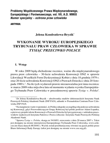 Problemy Współczesnego Prawa Międzynarodowego, Europejskiego i Porównawczego, vol. VII, A.D. MMIX Numer specjalny – ochrona praw człowieka ArtykuŁ Jelena Kondratiewa-Bryzik* WYKONANIE WYROKU EUROPEJSKIEGO TRYBUNAŁU PRAW CZŁOWIEKA W SPRAWIE TYSIĄC PRZECIWKO POLSCE I. Wstęp W roku 2009 będą obchodzone rocznice, ważne dla międzynarodowego prawa praw człowieka – 30-lecie uchwalenia Konwencji ONZ w sprawie Likwidacji Wszelkich Form Dyskryminacji Kobiet z dnia 18 grudnia 1979 r. oraz 20-lecie uchwalenia Konwencji ONZ o Prawach Dziecka z dnia 20 listopada 1989 r.. Na tle tych wydarzeń prawie niezauważalna jest inna rocznica: w marcu 2009 roku mija dwa lata od momentu wydania wyroku Europejskiego Trybunału Praw Człowieka w precedensowej sprawie Tysiąc v. Polska. * Dr Jelena Kondratiewa-Bryzik – absolwentka studiów doktoranckich Instytutu Nauk Prawnych Polskiej Akademii Nauk (INP PAN), adiunkt w Poznańskim Centrum Praw Człowieka INP PAN. Na marginesie warto wspomnieć, że Polska odegrała szczególną rolę podczas uchwalenia tej Konwencji, gdyż Przewodniczącym Grupy Roboczej był polski profesor Adam Łopatka, a pierwszy projekt tekstu Konwencji o Prawach Dziecka był przygotowany z udziałem pracowników naukowych Instytutu Państwa i Prawa (obecnie: Instytutu Nauk Prawnych) Polskiej Akademii Nauk. Sprawa Tysiąc v. Polska, skarga nr 5410/03, orzeczenie z dnia 20 marca 2007 r. Tekst jest dostępny na stronie internetowej Europejskiego Trybunału Praw Człowieka, www.echr. coe.int (baza danych HUDOC). Wyrok został przetłumaczony również na język polski przez Biuro Informacji Rady Europy (tekst jest dostępny na stronie www.coe.org.pl). 101 Po raz pierwszy Trybunał wydał orzeczenie w sprawie, w której państwo odmówiło kobiecie przeprowadzenia zabiegu przerywania ciąży, bez możliwości skorzystania z przysługujących jej zgodnie z obowiązującą ustawą uprawnień. Sprawa zyskała wielki rozgłos medialny. Głos na ten temat zabierali nie tylko prawnicy, lecz również politycy, dziennikarze oraz działacze organizacji pozarządowych. Trybunał uznał bowiem w swoim wyroku, że doszło do naruszenia praw skarżącej na tle art. 8 Europejskiej Konwencji o Ochronie Praw Człowieka i Podstawowych Wolności (dalej: Konwencji). Polska nie wypełniła czynnego obowiązku, dotyczącego efektywnego poszanowania życia prywatnego skarżącej. Trybunał orzekł, że w związku z powyższym władze polskie powinny podjąć odpowiednie kroki zarówno w celu wypłaty odszkodowania skarżącej (tzw. kroki indywidualne – ang. individual measures), jak i dokonania odpowiednich zmian w ustawodawstwie (tzw. kroki ogólne – ang. general measures). Istniejące w Polsce procedury dotyczące uzyskania zgody na dokonanie zabiegu przerywania ciąży ze względów terapeutycznych nie uwzględniają bowiem sytuacji, w której istnieje spór między kobietą ciężarną a jej lekarzami lub pomiędzy samymi lekarzami. Polskie przepisy nie przewidują żadnych środków Por. np. T. Terlikowski, Dziecko to nie człowiek, „Rzeczpospolita” z 21 marca 2007 r.; J. Pospieszalski, Alicja Tysiąc – zakładniczka feministek, „Rzeczpospolita” z 22 marca 2007 r.; W. Nowicka, Pogarda antyaborcyjnych fanatyków, „Rzeczpospolita” z 23 marca 2007 r.; eadem, Prawa człowieka – kłopot dla prawicy, „Rzeczpospolita” z 17 kwietnia 2007 r.; M. A. Nowicki, Sprawa Alicji Tysiąc: Co powiedział strasburski Trybunał i czego nie powiedział, „Rzeczpospolita” z 24-25 marca 2007 r.; A. Bodnar, D. Pudzianowska, Matka Pospieszalskiego nie zostałaby milionerką, „Rzeczpospolita” z 27 marca 2007 r.; R. Bugaj, Obrona życia czy doktryny, „Rzeczpospolita” z 3 kwietnia 2007 r.; M. Królikowski, Glosa do wyroku Europejskiego Trybunału Praw Człowieka z 20 marca 2007 r. w sprawie Alicja Tysiąc przeciwko Polsce (nr skargi 5410/03), „Przegląd Sejmowy” 2007, nr 3, s. 200-211; M. Gałązka, K. Wiak, Glosa do wyroku Europejskiego Trybunału Praw Człowieka z 20 marca 2007 r. w sprawie Alicja Tysiąc przeciwko Polsce, nr skargi 5410/03, „Przegląd Sejmowy” 2007, nr 3, s. 211224; K. Sękowska-Kozłowska, Glosa do wyroku Europejskiego Trybunału Praw Człowieka z dn. 20.03.2007 w sprawie Tysiąc p. Polsce, skarga nr 5410/03, „Państwo i Prawo” 2007, nr 10, s. 132-138; J. Kondratiewa-Bryzik, Orzeczenie Europejskiego Trybunału Praw Człowieka z dnia 20 marca 2007 r. w sprawie Tysiąc v. Polska, www.prawoimedycyna.pl (dwumiesięcznik internetowy, 2007, nr 1); N. Priaulx, Testing the Margin of Appreciation: Therapeutic Abortion, Reproductive ‚Rights‘ and the Intriguing Case of Tysiąc v. Poland, „European Journal of Health Law” 2008, nr 4 (t. 15), s. 361-379. Do powyższych prac nawiązuję również w mojej książce pt. Początek prawnej ochrony życia ludzkiego w świetle standardów międzynarodowych, Warszawa 2009, s. 154. 102 prawnych pozwalających na rozstrzygnięcie takich sporów i w związku z tym nie mogą być uznane za efektywne w rozumieniu wymogów Konwencji. Wyrok w sprawie Tysiąc v. Polska nie został dotychczas wykonany. W czerwcu 2007 r. rząd polski zwrócił się z oficjalnym wnioskiem do panelu pięciu sędziów o wyrażenie zgody na przedstawienie tej sprawy Wielkiej Izbie Europejskiego Trybunału Praw Człowieka. Argumentacja rządu polskiego w odwołaniu opierała się głównie na trzech tezach: • skarżąca nie wykorzystała wszystkich dostępnych środków krajowych; • art. 8 Konwencji nie ma zastosowania w tej sprawie; • nawet w przypadku, gdyby art. 8 Konwencji miał w tej sprawie zastosowanie, nie doszło do jego naruszenia. W dniu 24 września 2007 r. panel pięciu sędziów Trybunału odrzucił wniosek polskiego rządu, przez co wyrok stał się ostateczny. II. Wykonywanie wyroków Europejskiego Trybunału Praw Człowieka Zgodnie z art. 46 Konwencji, państwa zobowiązują się do przestrzegania ostatecznego wyroku Trybuna
