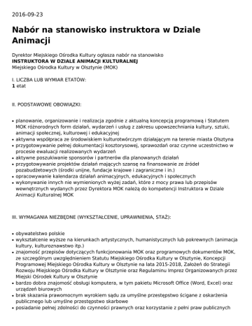 2016-09-23 Nabór na stanowisko instruktora w Dziale Animacji Dyrektor Miejskiego Ośrodka Kultury ogłasza nabór na stanowisko INSTRUKTORA W DZIALE ANIMACJI KULTURALNEJ Miejskiego Ośrodka Kultury w Olsztynie (MOK) I. LICZBA LUB WYMIAR ETATÓW: 1 etat II. PODSTAWOWE OBOWIĄZKI: ● ● ● ● ● ● ● planowanie, organizowanie i realizacja zgodnie z aktualną koncepcją programową i Statutem MOK różnorodnych form działań, wydarzeń i usług z zakresu upowszechniania kultury, sztuki, animacji społecznej, kulturowej i edukacyjnej aktywna współpraca ze środowiskiem kulturotwórczym działającym na terenie miasta Olsztyna przygotowywanie pełnej dokumentacji kosztorysowej, sprawozdań oraz czynne uczestnictwo w procesie ewaluacji realizowanych wydarzeń aktywne poszukiwanie sponsorów i partnerów dla planowanych działań przygotowywanie projektów działań mających szansę na finansowanie ze źródeł pozabudżetowych (środki unijne, fundacje krajowe i zagraniczne i in.) opracowywanie kalendarza działań animacyjnych, edukacyjnych i społecznych wykonywanie innych nie wymienionych wyżej zadań, które z mocy prawa lub przepisów wewnętrznych wydanych przez Dyrektora MOK należą do kompetencji Instruktora w Dziale Animacji Kulturalnej MOK III. WYMAGANIA NIEZBĘDNE (WYKSZTAŁCENIE, UPRAWNIENIA, STAŻ): ● ● ● ● ● ● obywatelstwo polskie wykształcenie wyższe na kierunkach artystycznych, humanistycznych lub pokrewnych (animacja kultury, kulturoznawstwo itp.) znajomość przepisów dotyczących funkcjonowania MOK oraz programowych dokumentów MOK, ze szczególnym uwzględnieniem Statutu Miejskiego Ośrodka Kultury w Olsztynie, Koncepcji Programowej Miejskiego Ośrodka Kultury w Olsztynie na lata 2015-2018, Założeń do Strategii Rozwoju Miejskiego Ośrodka Kultury w Olsztynie oraz Regulaminu Imprez Organizowanych przez Miejski Ośrodek Kultury w Olsztynie bardzo dobra znajomość obsługi komputera, w tym pakietu Microsoft Office (Word, Excel) oraz urządzeń biurowych brak skazania prawomocnym wyrokiem sądu za umyślne przestępstwo ścigane z oskarżenia publicznego lub umyślne przestępstwo skarbowe posiadanie pełnej zdolności do czynności prawnych oraz korzystanie z pełni praw publicznych ● ● ● stan zdrowia pozwalający na zatrudnienie na wskazanym stanowisku dyspozycyjność doświadczenie zawodowe w branży kulturalnej i/lub eventowej będzie dodatkowym atutem IV. UMIEJĘTNOŚCI: ● ● ● ● ● ● dokładność i terminowość komunikatywność, kreatywność umiejętność pracy w zespole umiejętność organizacji pracy na stanowisku odporność na stres (umiejętność pracy pod presją czasu) wysoka kultura osobista V. WYMAGANE DOKUMENTY I OŚWIADCZENIA: ● ● ● ● ● ● ● ● ● życiorys zawodowy (CV) z adresem mailowym i numerem telefonu list motywacyjny kserokopie dyplomów lub świadectw potwierdzających wykształcenie kserokopie referencji lub opinii oświadczenie o wyrażeniu zgody na przetwarzanie danych osobowych do celów rekrutacji oświadczenie o braku prawomocnego skazania za umyślne przestępstwo ścigane z oskarżenia publicznego lub umyślne przestępstwo skarbowe oświadczenie o posiadaniu pełnej zdolności do czynności prawnych i korzystaniu z pełni praw publicznych oświadczenie o stanie zdrowia umożliwiającym wykonywanie obowiązków na wskazanym stanowisku kwestionariusz osobowy dla osoby ubiegającej się o zatrudnienie VI. TERMIN I MIEJSCE SKŁADANIA DOKUMENTÓW: Dokumenty należy składać osobiście w zamkniętej kopercie z dopiskiem „Nabór na stanowisko Instruktora w Dziale Animacji Kulturalnej MOK w Olsztynie” lub przesyłać pocztą do 11 października 2016 r., na adres: Miejski Ośrodek Kultury, 10-538 Olsztyn, ul. Dąbrowszczaków 3. Dokumenty, które wpłyną po tym terminie, nie będą rozpatrywane. VII. INNE INFORMACJE: Dodatkowe informacje można uzyskać w sekretariacie Miejskiego Ośrodka Kultury, ul. Dąbrowszczaków 3, II piętro, tel. 89 522 13 50. Kandydaci, którzy spełnią wymagania formalne, będą informowani drogą mailową lub telefonicznie o terminie i miejscu przeprowadzenia kolejnych etapów naboru. Informacja o rozstrzygnięciu naboru będzie podana do publicznej wiadomości na stronie BIP Urzędu Miasta Olsztyna i MOK w Olsztynie. Dopuszcza się zatrudnienie na czas określony. W terminie 2 tygodni po ogłoszeniu wyniku naboru należy odebrać złożone dokumenty. Po upływie tego terminu dokumenty, które nie będą odebrane, zostaną zniszczone komisyjnie. Dyrektor Miejskiego Ośrodka Kultury w Olsztynie Agnieszka Kołodyńska