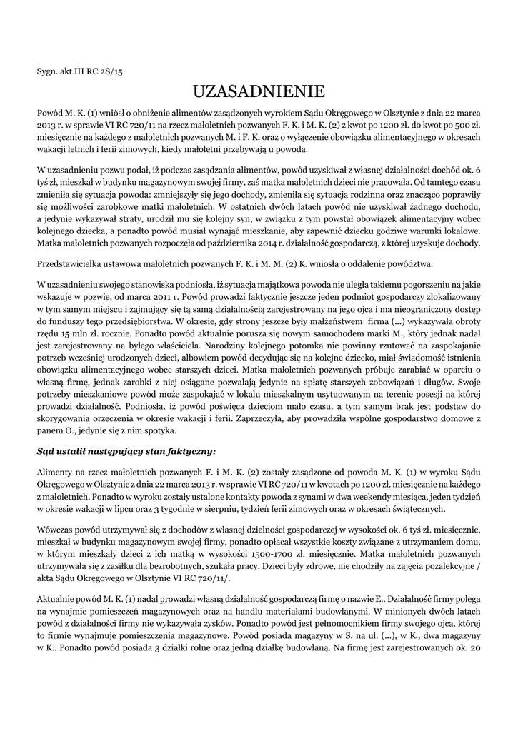 Sygn. akt III RC 28/15 UZASADNIENIE Powód M. K. (1) wniósł o obniżenie alimentów zasądzonych wyrokiem Sądu Okręgowego w Olsztynie z dnia 22 marca 2013 r. w sprawie VI RC 720/11 na rzecz małoletnich pozwanych F. K. i M. K. (2) z kwot po 1200 zł. do kwot po 500 zł. miesięcznie na każdego z małoletnich pozwanych M. i F. K. oraz o wyłączenie obowiązku alimentacyjnego w okresach wakacji letnich i ferii zimowych, kiedy małoletni przebywają u powoda. W uzasadnieniu pozwu podał, iż podczas zasądzania alimentów, powód uzyskiwał z własnej działalności dochód ok. 6 tyś zł, mieszkał w budynku magazynowym swojej firmy, zaś matka małoletnich dzieci nie pracowała. Od tamtego czasu zmieniła się sytuacja powoda: zmniejszyły się jego dochody, zmieniła się sytuacja rodzinna oraz znacząco poprawiły się możliwości zarobkowe matki małoletnich. W ostatnich dwóch latach powód nie uzyskiwał żadnego dochodu, a jedynie wykazywał straty, urodził mu się kolejny syn, w związku z tym powstał obowiązek alimentacyjny wobec kolejnego dziecka, a ponadto powód musiał wynająć mieszkanie, aby zapewnić dziecku godziwe warunki lokalowe. Matka małoletnich pozwanych rozpoczęła od października 2014 r. działalność gospodarczą, z której uzyskuje dochody. Przedstawicielka ustawowa małoletnich pozwanych F. K. i M. M. (2) K. wniosła o oddalenie powództwa. W uzasadnieniu swojego stanowiska podniosła, iż sytuacja majątkowa powoda nie uległa takiemu pogorszeniu na jakie wskazuje w pozwie, od marca 2011 r. Powód prowadzi faktycznie jeszcze jeden podmiot gospodarczy zlokalizowany w tym samym miejscu i zajmujący się tą samą działalnością zarejestrowany na jego ojca i ma nieograniczony dostęp do funduszy tego przedsiębiorstwa. W okresie, gdy strony jeszcze były małżeństwem firma (...) wykazywała obroty rzędu 15 mln zł. rocznie. Ponadto powód aktualnie porusza się nowym samochodem marki M., który jednak nadal jest zarejestrowany na byłego właściciela. Narodziny kolejnego potomka nie powinny rzutować na zaspokajanie potrzeb wcześniej urodzonych dzieci, albowiem powód decydując się na kolejne dziecko, miał świadomość istnienia obowiązku alimentacyjnego wobec starszych dzieci. Matka małoletnich pozwanych próbuje zarabiać w oparciu o własną firmę, jednak zarobki z niej osiągane pozwalają jedynie na spłatę starszych zobowiązań i długów. Swoje potrzeby mieszkaniowe powód może zaspokajać w lokalu mieszkalnym usytuowanym na terenie posesji na której prowadzi działalność. Podniosła, iż powód poświęca dzieciom mało czasu, a tym samym brak jest podstaw do skorygowania orzeczenia w okresie wakacji i ferii. Zaprzeczyła, aby prowadziła wspólne gospodarstwo domowe z panem O., jedynie się z nim spotyka. Sąd ustalił następujący stan faktyczny: Alimenty na rzecz małoletnich pozwanych F. i M. K. (2) zostały zasądzone od powoda M. K. (1) w wyroku Sądu Okręgowego w Olsztynie z dnia 22 marca 2013 r. w sprawie VI RC 720/11 w kwotach po 1200 zł. miesięcznie na każdego z małoletnich. Ponadto w wyroku zostały ustalone kontakty powoda z synami w dwa weekendy miesiąca, jeden tydzień w okresie wakacji w lipcu oraz 3 tygodnie w sierpniu, tydzień ferii zimowych oraz w okresach świątecznych. Wówczas powód utrzymywał się z dochodów z własnej dzielności gospodarczej w wysokości ok. 6 tyś zł. miesięcznie, mieszkał w budynku magazynowym swojej firmy, ponadto opłacał wszystkie koszty związane z utrzymaniem domu, w którym mieszkały dzieci z ich matką w wysokości 1500-1700 zł. miesięcznie. Matka małoletnich pozwanych utrzymywała się z zasiłku dla bezrobotnych, szukała pracy. Dzieci były zdrowe, nie chodziły na zajęcia pozalekcyjne / akta Sądu Okręgowego w Olsztynie VI RC 720/11/. Aktualnie powód M. K. (1) nadal prowadzi własną działalność gospodarczą firmę o nazwie E.. Działalność firmy polega na wynajmie pomieszczeń magazynowych oraz na handlu materiałami budowlanymi. W minionych dwóch latach powód z działalności firmy nie wykazywała zysków. Ponadto powód jest pełnomocnikiem firmy swojego ojca, której to firmie wynajmuje pomieszczenia magazynowe. Powód posiada magazyny w S. na ul. (...), w K., dwa magazyny w K.. Ponadto powód posiada 3 działki rolne oraz jedną działkę budowlaną. Na firmę jest zarejestrowanych ok. 20 samochodów, ponadto powód ma 2 samochody prywatne C. (...) z 2003r. i T. z 1999 r. oraz korzysta z M., na który zamienił się z kolegą za jeden z samochodów dostawczych. Powód posiada mieszkanie w S., które wynajmuje za 500 zł. Aktualnie powód posiada dwa rachunki bankowe, jeden firmowy, drugi osobisty, trzeci rachunek, który posiadał związany był z kredytem zaciągniętym w Banku Spółdzielczym i został zamknięty po spłaceniu kredytu. Kredyt został spłacony wcześniej niż to wynikało z umowy, albowiem powód uznał, że posiadając odpowiednie środki woli je przeznaczyć na spłatę kredytu niż opłacać odsetki. Obecnie, po narodzinach kolejnego dziecka, powód wraz z konkubiną i dzieckiem zamieszkali w wynajętym mieszkaniu, za które łączne opłaty wynoszą ok. 2000 zł. miesięcznie. Jest to połowa domu jednorodzinnego o powierzchni 70 m2. Konkubina powoda otrzymuje zasiłek wychowawczy. W ubiegłe wakacje powód nie zabrał synów na wakacje za granicę, byli na K., w bieżącym roku również spędzili tydzień w R. na K.. Ponadto synowie spędzają czas z ojcem w różnych terminach, nie zawsze zgodnie z orzeczeniem Sądu, nie na wszystkie weekendy ojciec zabiera chłopców, jednak czasem powód zawozi synów na różne zajęcia w ciągu tygodnia. W czasie pobytów u ojca czasem jeżdżą do kina lub za basen. Powód nadal ponosi koszty opłat za media w domu w którym mieszka strona pozwana, w wysokości 1500-1700 zł. miesięcznie /wyjaśnienia powoda M. K. (1) k. 345v-346, rachunki za dom matki pozwanych ponoszo