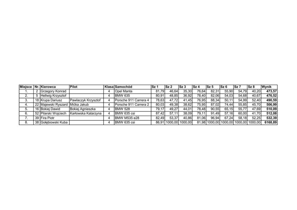 Miejsce 1. 2. 3. 4. 5. 6. 7. 8. Nr. 2 5 18 22 16 52 39 38 Kierowca Grzegory Konrad Hellwig Krzysztof Krupa Dariusz Majewski Ryszard Bokiej Dawid Pilarski Wojciech Fira Piotr Gołębiowski Kuba Pilot Klasa 4 4 Pawlaczyk Krzysztof 4 Mićka Jakub 4 Bokiej Agnieszka 4 Karłowska Katarzyna 4 4 4 Samochód Sz 1 Sz 2 Sz 3 Sz 4 Sz 5 Sz 6 Sz 7 Sz 8 Wynik Opel Manta 81,79 46,64 35,30 76,64 82,31 55,90 54,79 40,20 473,57 BMW 635 80,91 48,85 36,92 78,40 82,06 54,03 54,68 40,67 476,52 Porsche 911 Carrera 4 78,63 47,72 41,45 76,95 88,34 50,11 54,99 52,40 490,59 Porsche 911 Carrera 2 80,03 49,38 38,62 75,95 87,02 74,44 55,85 45,70 506,99 BMW 528 79,17 49,27 44,01 78,48 90,55 65,15 55,77 47,69 510,09 BMW 635 csi 87,42 57,11 38,09 79,11 91,49 57,16 60,00 41,70 512,08 BMW M535 e28 82,49 53,37 40,86 81,06 96,94 67,24 58,18 52,25 532,39 BMW 635 csi 86,91 1000,00 1000,00 81,98 1000,00 1000,00 1000,00 1000,00 6168,89