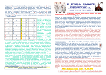 Uzupełnij: 1. Za wszystko dziękujcie Bogu, taka jest bowiem wola Boża … was 2. Jezus zmierzał do …. 3. „Gdy wchodzili do pewnej wsi, wyszło naprzeciw Niego … trędowatych”. 4. Jeden z trędowatych wrócił chwaląc Boga i … Jezusowi. 5. Na ich widok rzekł do nich: „Idźcie, … się kapłanom”. 6. Ten który powrócił do Jezusa … na twarz do nóg Jezusa. 7. Trędowaci z daleka wołali: „Jezusie, Mistrzu, … się nad nami” 8. Znany jest nam też uzdrowiony z trądu - Syryjczyk … 9. Cudzoziemcem, który wrócił podziękować był …10. Trędowaci zostali uwolnieni od swojej … 11. „Wstań, idź, twoja wiara cię …” 12. Trąd duszy to … niewiary, że Bóg kocha, że może oczyścić. 13. Uwierz, …, powierz się Bogu. Zwróćmy uwagę na to, że uleczony wdzięczny J R Y 2 trędowaty, wielbiąc D I U x 3 Boga, upadł do stóp x x D Ł 4 Jezusowych. Przecież x x x P E 5 nie wiedział, że Jezus x x x x x Ł x 6 jest Bogiem, wydawało x x x x x U I 7 mu się, że jest On co x x x x x N N prawda niezwykłym 8 lekarzem, ale S M A N 9 człowiekiem. Dziwne x x x x C O Y 10 wobec tego jest to, że x U D I A x 11 wielbiąc Boga, x x x x x E H 12 obejmował za nogi x x x x x Z J 13 człowieka. – Co się działo z pozostałymi? Myślę, że także wielbili Boga na wysokiej świętej górze w świątyni Pańskiej. Nagłe objawienie się mocy Bożej zachwyciło ich Bogiem. Wszyscy ludzie mogli im się wydać nieważni, mogli nawet zapomnieć o spotkanym niezwykłym lekarzu. Mogli z góry patrzeć na kapłanów, jak na gryzipiórków z kancelarii jerozolimskiej, którzy wypisywali zaświadczenia: „Zaświadczam, że ten i ten już nie jest robaczywy, ale zdrowy”. – Ktoś powie: ogołoceni, oderwani od wszystkich ziemskich przywiązań, a jednak Pan Jezus nie pochwalił ich. Pochwalił tego, który najgłębiej zrozumiał, że wielbiąc Boga, nie można zapominać o ludziach. [x J. Twardowski, W świetle Ewangelii, 2005,s.265]. * Bóg działa poprzez ludzi, którzy są naokoło nas, dlatego oni rzucają na nas urok, dlatego ich kochamy, tęsknimy za drugim człowiekiem, bez którego jest nam źle. – Wydaje się, że ten, kto naprawdę wielbi Boga, nigdy nie powinien obawiać się serdecznych uczuć w stosunku do człowieka. Ale chociaż 1 W G x D Z I Ę K U J M Y B O G U M L C O Ż A x x x * Jezus jako człowiek nie dopomina się wdzięczności dla siebie, z Jego słów wynika, że trzeba Bogu dziękować za wszystko. Kiedy dziękujemy ludziom, nie zapominajmy oddać chwały Bogu. Bez Niego nie przyszłaby do nas pomoc. . – Kiedy myślimy z wdzięcznością o zmarłych, dziękujmy Bogu, że przez tych co odeszli, tyle nieraz otrzymaliśmy dobrego. [x J. Twardowski, W świetle Ewangelii, 2005,s.266]. MOJE POSTANOWIENIE: Pomodlę się o cnotę wdzięczności wobec Boga i ludzi … Kancelaria Parafialna e-mail : [email protected] http://www.stanislaw-bm.pl/ [gazetka do użytku wewnętrznego Parafii] Stanisława Biskupa na Woli; 01-244 Warszawa; ul. Bema 73/75, ‘ Kancelaria Parafialna czynna: poniedziałek - piątek godz. 9:00 - 10:00; 16:00 - 17:30 ; tel. 22 632 38 00 Za wszystko dziękujcie Bogu, taka jest bowiem wola Boża względem was w Jezusie Chrystusie. (1 Tes 5,18) Łk 17,11-19 Stało się, że Jezus zmierzając do Jerozolimy przechodził przez pogranicze Samarii i Galilei. Gdy wchodzili do pewnej wsi, wyszło naprzeciw Niego dziesięciu trędowatych. Zatrzymali się z daleka i głośno zawołali: Jezusie, Mistrzu, ulituj się nad nami. Na ich widok rzekł do nich: Idźcie, pokażcie się kapłanom. A gdy szli, zostali oczyszczeni. Wtedy jeden z nich widząc, że jest uzdrowiony, wrócił chwaląc Boga donośnym głosem, upadł na twarz do nóg Jego i dziękował Mu. A był to Samarytanin. Jezus zaś rzekł: Czy nie dziesięciu zostało oczyszczonych? Gdzie jest dziewięciu? żaden się nie znalazł, który by wrócił i oddał chwałę Bogu, tylko ten cudzoziemiec. Do niego zaś rzekł: Wstań, idź, twoja wiara cię uzdrowiła. Syryjczyk Naaman i dziesięciu trędowatych na pograniczu Samarii i Galilei – wszyscy oni zostali uwolnieni od swojej choroby, która czyniła ich nieczystymi w oczach ludzi. Trąd, którym byli zarażeni, dotknął nie tylko ich ciał, lecz także dusz. Człowiek jest całością, dlatego współcierpi w nim wszystko. Trąd duszy to grzech niewiary w to, że Bóg kocha, że może oczyścić…To danie wiary podszeptom złego, który zapewnia: Niechybnie umrzesz z powodu swej nieczystości. Jezus mówi co innego: „Twoja wiara cię ocaliła”. Uwierz, zaufaj, powierz się, aby wzrosło w tobie przekonanie, że jestem Bogiem, który nie zachowuje pamięci o grzechach i dochowuje wierności. [M. Konarska, „Oremus” X 2007, s. 61 Papież Franciszek – … Duch Święty jest „wielkim darem Ojca”. Jest On mocą, która dodaje odwagi Kościołowi, by mógł dotrzeć na krańce świata. To właśnie Duch inspiruje go i umacnia, by szedł cały czas do przodu. Bez Niego byłby on zamknięty … Są trzy postawy wobec Ducha Świętego, jakie można przyjąć. Pierwsza z nich to ta, którą św. Paweł gani u Galatów. Wierzą oni bowiem w usprawiedliwienie przez Prawo, a nie przez Jezusa, który Prawu nadaje sens. To właśnie ludzie o takiej postawie atakowali Jezusa, a On nazywał ich obłudnikami. … Druga postawa to zasmucanie Ducha Świętego. Ma miejsce wtedy, gdy nie pozwalamy Mu, by nas inspirował i prowadził w życiu chrześcijańskim … Stajemy się zatem oziębli i popadamy w chrześcijaństwo przeciętne, bo Duch Święty nie może w nas uczynić swego wielkiego dzieła… Trzecia postawa to pełne otwarcie się na Ducha Świętego i zgoda na to, by On nas prowadził. … Niech Pan da nam tę łaskę otwarcia się na Ducha Świętego, byśmy nie stali się ludźmi, którzy zasmucają Ducha”. [RADIO WATYKAŃSKIE, 06.10.2016]. Jan Paweł II - Różaniec to modlitwa, którą bardzo ukochałem [...] 