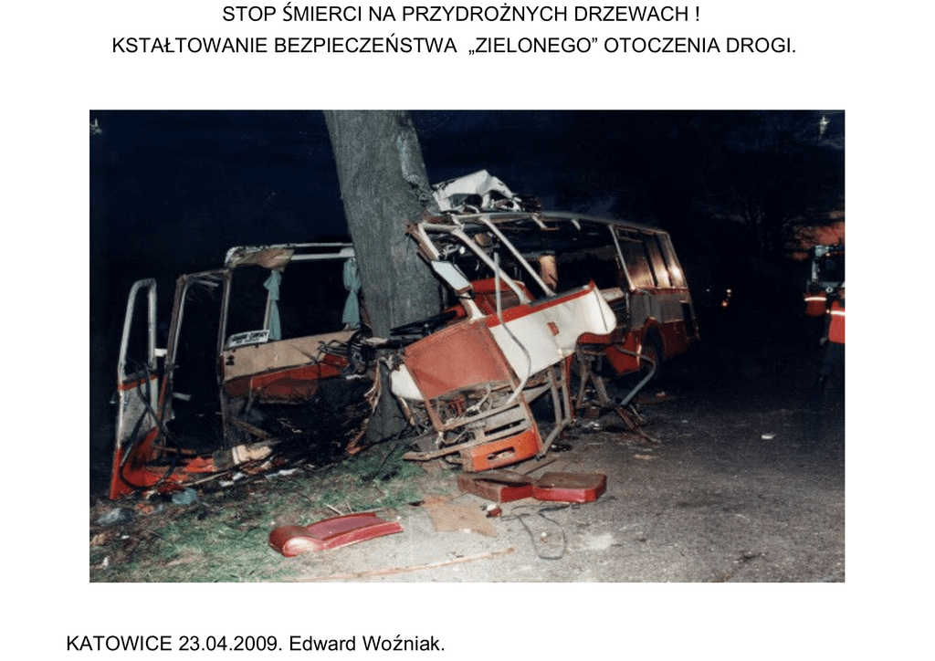 STOP ŚMIERCI NA PRZYDROśNYCH DRZEWACH ! KSTAŁTOWANIE BEZPIECZEŃSTWA „ZIELONEGO” OTOCZENIA DROGI. KATOWICE 23.04.2009. Edward Woźniak. STREFY ŚMIERCI STREFA BEZPIECZEŃSTWA BŁĘDY LUDZKIE STAN NAWIERZCHNI AWARIE TECHNICZNE „JEST RZECZĄ NIEWYOBRAśALNĄ , BY WE WSPÓŁCZESNY, HUMANITARNYM SPOŁECZEŃSTWIE, CZŁOWIEK, KTÓRY POPEŁNIŁ NIEZAMIERZONY BŁĄD W RUCHU DROGOWYM BYŁ KARANY WYROKIEM ŚMIERCI Z JEGO NATYCHMIASTOWYM WYKONANIEM !” Ofiary śmiertelne w wypadkach drogowych w latach 2000-2004 w Polsce w grupie najwaŜniejszych problemów.( http://www.krbrd.gov.pl/download/pdf/Gambit_2005_RM.pdf) „ZIELONE POBOCZA” Projekt zasad urządzania zieleni przydroŜnej DEFINICJE Uś śYTYCH OKREŚ ŚLEŃ Ń - zieleń ń niska – Rośliny o wysokości do 40 cm np. trawy, krzewy płoŜące, kwiaty. - zieleń ń krzewiasta – Roślinność składająca się z róŜnych gatunków krzewów oraz form krzewiastych drzew, osiągająca wysokość powyŜej 40 cm, której średnica pędów, mierzona na poziomie szyjki korzeniowej nie przekracza 7 cm, urządzona w odpowiednim do potrzeb układzie. Zieleń krzewiasta urządzona w formie pasma o szerokości do 3m, podzielonego na odcinki o długości od 3m do 12m, odstępy między odcinkami o długości ok. 3 m wypełnione zielenią niską. Poszczególne odcinki pasma mogą być urządzone: a) w formie Ŝywopłotu formowanego o szerokości do 1m, b) jako jeden rząd roślin osiągających średnicę ok. 1m, c) jako jeden rząd roślin osiągających średnicę do 3m, d) jako dwa rzędy roślin tworzące odcinek o łącznej szerokości do 3m. - poszerzone pasmo zieleni krzewiastej – Pasmo zieleni krzewiastej o szerokości powyŜej 3m, urządzone z odcinków o szerokości do 3m i długości powyŜej 3m. Odstępy między odcinkami długości ok. 3m wypełnione zielenią niską. Poszerzone pasmo zieleni krzewiastej moŜe być urządzone na kilka sposobów np: a) poszczególne odcinki urządzone prostopadle do krawędzi jezdni b) poszczególne odcinki urządzone ukośnie do krawędzi jezdni c) urządzone z dwóch równoległych do siebie pasm. Od strony jezdni pasmo urządzone z krótkich odcinków krzewów niskich, od strony granicy pasa drogowego z dłuŜszych odcinków krzewów wysokich. d) w sposób mieszany w dowolnym układzie, z zachowaniem 3m odstępów między poszczególnymi odcinkami. - zieleń ń wysoka – formy pienne drzew wysokich, których średnica pnia przekracza 7cm zlokalizowane poza strefą bezpieczeństwa, z wyłączeniem gatunków osiągających wysokość większą od odległości ich pnia do krawędzi jezdni, sadzone w formie rzędu lub kilku rzędów równolegle do jezdni. - strefa bezpieczeń ństwa – pas terenu przyległy do jezdni, wolny od niebezpiecznych przeszkód bocznych, za jakie są uznawane m.in. drzewa o średnicy pnia większej niŜ 7cm. I URZĄDZANIE ZIELENI PRZYDROśNEJ /warunki techniczne/ - zieleń ń niska – 1. W przyległej do jezdni części pasa drogowego o szerokości najmniej 3m, przy prostych odcinkach dróg oraz na zewnętrznych stronach zakrętów i łuków jezdni. (W wyjątkowych przypadkach, gdy wymiary pasa drogowego to uniemoŜliwiają, moŜna przy drogach powiatowych i gminnych o niskim natęŜeniu ruchu zmniejszyć tę szerokość do 1,5m) 2. W przyległej do jezdni części pasa drogowego o szerokości większej niŜ 3 m na: - wewnętrznych stronach łuków jezdni - na odcinkach dróg, gdzie przez jezdnię mogą przebiegać dzikie zwierzęta. 3. Od krawędzi jezdni do granicy pasa drogowego na wewnętrznych stronach zakrętów. 4. W polu widoczności przed skrzyŜowaniami i przejazdami kolejowymi. (Wymiary pola widoczności określono w przepisach Rozporządzenia Ministra Transportu i Gospodarki Morskiej z dnia 2 marca 1999 r. w sprawie warunków technicznych, jakim powinny odpowiadać drogi publiczne i ich usytuowanie. Dz. U. z dnia 14 maja 1999 r. ZAŁĄCZNIK Nr 2. WARUNKI WIDOCZNOŚCI NA SKRZYśOWANIACH I ZJAZDACH, , http://www.abc.com.pl/serwis/du/1999/0430.htm oraz w przepisach Rozporządzenia Ministra Transportu Gospodarki Morskiej z dnia 26 lutego 1996 r. w sprawie warunków technicznych, jakim powinny odpowiadać skrzyŜowania linii kolejowych z drogami publicznymi i ich usytuowanie. Dz. U. z dnia 20 marca 1996 r.) ZAŁĄCZNIK Nr 3WARUNKI WIDOCZNOŚCI NA WJAZDACH Z PASEM WŁĄCZANIA 5. Na wyspach kanalizujących ruch na skrzyŜowaniach. 6. Na bocznym pasie dzielącym rozdzielającym jezdnie o róŜnych funkcjach. - zieleń ń krzewiasta – 1. Do umacniania skarp wykopów. 2. Na środkowym pasie dzielącym - rozdzielającym jezdnie przeznaczone dla przeciwnych kierunków ruchu 3. Jako osłony przeciwolśnieniowe zlokalizowane w strefie bezpieczeństwa. – -W pozostałej części pasa drogowego, poza terenem przeznaczonym dla zieleni niskiej. - pasmo zieleni krzewiastej - poszerzone pasmo zieleni krzewiastej - 1. Na zewnętrznych stronach zakrętów i łuków jezdni 2.Do umacniania skarp nasypów. 2. W miejscach gdzie poza pasmem zieleni krzewiastej znajdują się drzewa o grubym pniu, słupy lub inne zagraŜające bezpieczeństwu obiekty. 3. Na odcinkach dróg gdzie zieleń niska i pasmo zieleni krzewiastej w sposób niedostateczny chronią teren przyległy do drogi przed hałasem i szkodliwymi substancjami emitowanymi - zieleń ń wysoka – 1. Jako osłony przeciwwietrzne na odcinkach dróg o dopuszczonej prędkości nie mniejszej niŜ 70km/h, naraŜonych na działanie silnych wiatrów bocznych, mogących zagraŜać bezpieczeństwu ruchu, a w szczególności na dojazdach do mostów, w okolicach nadmorskich, przy przekraczaniu dolin i wąwozów. 2. Przy drogach gdzie zieleń trawiasta i poszerzone pasmo zieleni krzewiastej w sposób niedostateczny chronią teren przyległy do drogi przed hałasem i szkodliwymi substancjami emitowanymi przez pojazdy. 3. Jako osłony przeciwolśnieniowe. 4. Dla urozmaicenia krajobrazu. PAS TERENU O SZEROKOŚCI 18M. 02. 05. 1994. GDAŃSK