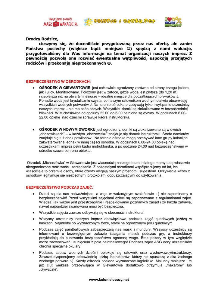 Drodzy Rodzice, cieszymy się, że doceniliście przygotowaną przez nas ofertę, ale zanim Państwa pociechy (większe bądź mniejsze ) spędzą z nami wakacje, przygotowaliśmy dla Was informacje na temat organizacji naszych imprez. Z pewnością pozwolą one rozwiać ewentualne wątpliwości, uspokoją przejętych rodziców i przekonają nieprzekonanych . BEZPIECZEŃSTWO W OŚRODKACH: OŚRODEK W GIEWARTOWIE jest całkowicie ogrodzony zarówno od strony brzegu jeziora, jak i ulicy. Monitorowany. Położony jest w zatoce, gdzie woda jest płytsza (do 1,20 m) i cieplejsza niż na otwartym jeziorze – idealne miejsce dla początkujących pływaków J. Ponadto woda jest krystalicznie czysta, co naszym ratownikom wodnym ułatwia obserwację wszystkich wodnych potworów J. Na terenie ośrodka przebywają tylko i wyłącznie uczestnicy naszych imprez – nie ma osób obcych. Wszystkie domki są zlokalizowane w bezpośredniej bliskości. W Michasiówce od godziny 22.00 do 6.00 pełnione są dyżury. W godzinach 6.0022.00 opiekę nad dziećmi sprawuje kadra instruktorska. OŚRODEK W NOWYM DWORKU jest ogrodzony, domki są zlokalizowane są w dwóch „obozowiskach” – w każdym „obozowisku” znajduje się domek instruktorski. Strefa namiotów znajduje się tuż obok pawilonów. Na terenie ośrodka mogą przebywać inne grupy kolonijne zakwaterowane jednak w innej części ośrodka. W godzinach 6.00-24.00 opiekę nad uczestnikami imprez pełni kadra instruktorska, a po godzinie 24.00 nad bezpieczeństwem w ośrodku czuwa ochrona obiektu. Ośrodek „Michasiówka” w Giewartowie jest własnością naszego biura i dlatego mamy tutaj właściwie nieograniczone możliwości zarządzania. Z pozostałymi ośrodkami współpracujemy od lat, ich właściciele to przemiłe osoby, które często ulegają naszym prośbom i sugestiom. Oczywiście każdy z ośrodków legitymuje się niezbędnymi protokołami dopuszczającymi do użytkowania. BEZPIECZEŃSTWO PODCZAS ZAJĘĆ: Dzieci są dla nas najważniejsze, a więc w wakacyjnym szaleństwie :-) nie zapominamy o bezpieczeństwie! Przed wszystkimi zajęciami dzieci są zapoznawane z regulaminami zajęć. Wiedzą, jak ważne jest przestrzeganie i respektowanie poznanych zasad i że każda zabawa, nawet najbardziej zwariowana musi być bezpieczna. Wszystkie zajęcia zawsze odbywają się w obecności instruktora! Wszyscy uczestnicy naszych imprez obowiązkowo podczas zajęć quadowych jeżdżą w kaskach. Najmłodsi po wyznaczonym torze, starsi na ogrodzonym polu quadowym. Podczas zajęć paintballowych zabezpieczają nas maski i mundury. Wszyscy uczestnicy są informowani o bezwzględnym zakazie ściągania masek podczas gry, a instruktorzy przykładają do pilnowania bezpieczeństwa ogromną wagę. Brak pokory w tym względzie może zaowocować usunięciem z pola paintballowego! Podczas zajęć ASG oczy uczestników chronią specjalne okulary. Podczas zabaw wodnych dziećmi opiekuje się ratownik oraz wychowawcy/instruktorzy. Zawsze dysponujemy odpowiednią liczbą instruktorów, którzy nie spuszczą z oka żadnego wodnego potwora :-). Każdy ośrodek posiada wyznaczone kąpielisko. Maluchy mniejsze i te już ciut większe przebywające w Giewartowie dodatkowo otrzymują „makarony” lub „pływaczki”. www.kolonieiobozy.net Wszyscy uczestnicy podzieleni są na grupy. Każda grupa ma swojego instruktorawychowawcę, który będzie do Państwa dyspozycji około jednej godziny w ciągu dnia i w tym czasie może udzielać wszelkich informacji, pozostały czas całkowicie poświęca Waszym Dzieciom! OPIEKA MEDYCZNA: Dbamy też o zdrowie i dobre samopoczucie naszych ulubieńców. Żaden sygnał nie jest przez nas lekceważony. Badamy każdą bolącą kostkę czy nadwyrężoną rękę, każde bolące gardełko i kichający nos. O zdrowie dzieci troszczyć się będą lekarze, lub pielęgniarki lub ratownicy medyczni. Zdarza się też, że podpisujemy umowę na sprawowanie opieki medycznej z najbliższym ośrodkiem zdrowia. Opieka medyczna dotyczy tylko i wyłącznie uczestników, którzy nie ukończyli 18 roku życia. OPIEKA NAD NAJMŁODSZYMI: Kochani Rodzice nie martwcie się o Wasze kilkuletnie pociechy! Naszym instruktorom i wychowawcom żadne problemy dzieci nie są obce. Będą sprawdzać koszulki, spodenki, skarpetki, czystość uszu, stópek, będą pleść dziewczynkom warkoczyki, będą czuwać i opiekować się każdym maluchem. Pomogą wnieść wielokilogramowe :-) walizy do pokoju. Dotyczy to oczywiście maluchów, nasi starsi podopieczni doskonale sobie oczywiście z takimi drobnostkami radzą :-). To czy wakacyjna eskapada będzie udana zależy nie tylko od intensywności zabaw, ale także od relacji z rówieśnikami. Zrobimy wszystko, aby te dni były wyjątkowo udane a rozłąka z rodzicami jak najmniej bolesna. Chcielibyśmy jednak także i Państwa prosić o pomoc i przeprowadzenie z dzieckiem rozmowy, tak aby miało pewność, że z każdym, nawet najmniejszym kłopotem może się zwrócić się do nas: z każdym bólem brzuszka, ząbka czy nieporozumieniem z kumplem lub koleżanką oczywiście. Gdyby jednak się zdarzyło, że pociecha dzwoni do państwa i muchy w nosku aż bzyczą, to proszę się nie martwić, spróbować wypytać o co tak naprawdę chodzi (często jest to po prostu tęsknota, czasem najzwyklejsze w świecie zmęczenie, a czasem kłótnia z koleżanką ) , a później bezzwłocznie skontaktować się z kierownikiem lub wychowawcą – nieraz krótka rozmowa i kilka chwil więcej poświęconych dziecku zdziałały cuda! OPIEKA NAD STARSZAKAMI: Dbamy o dobre samopoczucie i przyjacielskie kontakty między uczestnikami, integrację, nawiązywanie nowych, wartościowych przyjaźni. Rozwiązujemy problemy wieku „trudnego”, tak, aby każda buzia wróciła uśmiechnięta i zachwycona :-). Często młodzi ludzie bywają jeszcze bardziej skryci i zamknięci niż nieśmiałe maluchy, stąd jak zwykle prosimy państwa o ko