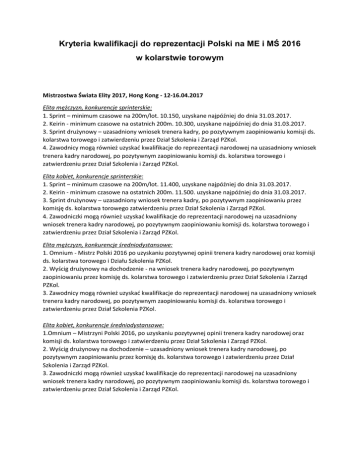 Kryteria kwalifikacji do reprezentacji Polski na ME i MŚ 2016 w kolarstwie torowym Mistrzostwa Świata Elity 2017, Hong Kong - 12-16.04.2017 Elita mężczyzn, konkurencje sprinterskie: 1. Sprint – minimum czasowe na 200m/lot. 10.150, uzyskane najpóźniej do dnia 31.03.2017. 2. Keirin - minimum czasowe na ostatnich 200m. 10.300, uzyskane najpóźniej do dnia 31.03.2017. 3. Sprint drużynowy – uzasadniony wniosek trenera kadry, po pozytywnym zaopiniowaniu komisji ds. kolarstwa torowego i zatwierdzeniu przez Dział Szkolenia i Zarząd PZKol. 4. Zawodnicy mogą również uzyskać kwalifikacje do reprezentacji narodowej na uzasadniony wniosek trenera kadry narodowej, po pozytywnym zaopiniowaniu komisji ds. kolarstwa torowego i zatwierdzeniu przez Dział Szkolenia i Zarząd PZKol. Elita kobiet, konkurencje sprinterskie: 1. Sprint – minimum czasowe na 200m/lot. 11.400, uzyskane najpóźniej do dnia 31.03.2017. 2. Keirin - minimum czasowe na ostatnich 200m. 11.500. uzyskane najpóźniej do dnia 31.03.2017. 3. Sprint drużynowy – uzasadniony wniosek trenera kadry, po pozytywnym zaopiniowaniu przez komisję ds. kolarstwa torowego zatwierdzeniu przez Dział Szkolenia i Zarząd PZKol. 4. Zawodniczki mogą również uzyskać kwalifikacje do reprezentacji narodowej na uzasadniony wniosek trenera kadry narodowej, po pozytywnym zaopiniowaniu komisji ds. kolarstwa torowego i zatwierdzeniu przez Dział Szkolenia i Zarząd PZKol. Elita mężczyzn, konkurencje średniodystansowe: 1. Omnium - Mistrz Polski 2016 po uzyskaniu pozytywnej opinii trenera kadry narodowej oraz komisji ds. kolarstwa torowego i Działu Szkolenia PZKol. 2. Wyścig drużynowy na dochodzenie - na wniosek trenera kadry narodowej, po pozytywnym zaopiniowaniu przez komisję ds. kolarstwa torowego i zatwierdzeniu przez Dział Szkolenia i Zarząd PZKol. 3. Zawodnicy mogą również uzyskać kwalifikacje do reprezentacji narodowej na uzasadniony wniosek trenera kadry narodowej, po pozytywnym zaopiniowaniu komisji ds. kolarstwa torowego i zatwierdzeniu przez Dział Szkolenia PZKol. Elita kobiet, konkurencje średniodystansowe: 1.Omnium – Mistrzyni Polski 2016, po uzyskaniu pozytywnej opinii trenera kadry narodowej oraz komisji ds. kolarstwa torowego i zatwierdzeniu przez Dział Szkolenia i Zarząd PZKol. 2. Wyścig drużynowy na dochodzenie – uzasadniony wniosek trenera kadry narodowej, po pozytywnym zaopiniowaniu przez komisję ds. kolarstwa torowego i zatwierdzeniu przez Dział Szkolenia i Zarząd PZKol. 3. Zawodniczki mogą również uzyskać kwalifikacje do reprezentacji narodowej na uzasadniony wniosek trenera kadry narodowej, po pozytywnym zaopiniowaniu komisji ds. kolarstwa torowego i zatwierdzeniu przez Dział Szkolenia i Zarząd PZKol. Mistrzostwa Świata Juniorów, Aigle/Szwajcaria 20-24.07.2016 Juniorzy, konkurencje sprinterskie: 1. Sprint – minimum czasowe na 200 m poniżej 10.70 s uzyskane do dnia 03.07.2016 podczas zawodów wpisanych do kalendarza PZKol lub UCI. Jeżeli minimum uzyska więcej niż dwóch zawodników, kwalifikację do startu otrzymają zawodnicy na wniosek trenera kadry nominowani spośród tych którzy wypełnili minimum, po pozytywnym zaopiniowaniu przez komisję ds. kolarstwa torowego i zatwierdzeniu przez Dział Szkolenia oraz Zarząd PZKol. 2. Keirin - minimum czasowe na 200 m poniżej 10.70 s uzyskane do dnia 03.07.2016 podczas zawodów wpisanych do kalendarza PZKol lub UCI. Jeżeli minimum uzyska więcej niż dwóch zawodników, kwalifikację do startu otrzymają zawodnicy na wniosek trenera kadry nominowani spośród tych którzy wypełnili minimum, po pozytywnym zaopiniowaniu przez komisję ds. kolarstwa torowego i zatwierdzeniu przez Dział Szkolenia oraz Zarząd PZKol. 3. Sprint drużynowy – uzasadniony wniosek trenera kadry, po pozytywnym zaopiniowaniu przez komisję ds. kolarstwa torowego i zatwierdzeniu przez Dział Szkolenia oraz Zarząd PZKol. 4. Zawodnicy mogą również uzyskać kwalifikacje do reprezentacji narodowej na uzasadniony wniosek trenera kadry narodowej, po pozytywnym zaopiniowaniu komisji ds. kolarstwa torowego i zatwierdzeniu przez Dział Szkolenia oraz Zarząd PZKol. Juniorki, konkurencje sprinterskie: 1. Sprint - minimum czasowe na 200 m poniżej 12.00 s uzyskane do dnia 03.07.2016 podczas zawodów wpisanych do kalendarza PZKol lub UCI. Jeżeli minimum uzyskają więcej niż dwie zawodniczki, kwalifikację do startu otrzymają zawodniczki na wniosek trenera kadry nominowane spośród tych które wypełniły minimum, po pozytywnym zaopiniowaniu przez komisję ds. kolarstwa torowego i zatwierdzeniu przez Dział Szkolenia oraz Zarząd PZKol. 3. Keirin - minimum czasowe na 200 m poniżej 12.00 s uzyskane do dnia 03.07.2016 podczas zawodów wpisanych do kalendarza PZKol lub UCI. Jeżeli minimum uzyskają więcej niż dwie zawodniczki, kwalifikację do startu otrzymają zawodniczki na wniosek trenera kadry nominowane spośród tych które wypełniły minimum, po pozytywnym zaopiniowaniu przez komisję ds. kolarstwa torowego i zatwierdzeniu przez Dział Szkolenia oraz Zarząd PZKol. 4. Sprint drużynowy – uzasadniony wniosek trenera kadry. 5. Zawodniczki mogą również uzyskać kwalifikacje do reprezentacji narodowej na uzasadniony wniosek trenera kadry narodowej, po pozytywnym zaopiniowaniu komisji ds. kolarstwa torowego i zatwierdzeniu przez Dział Szkolenia oraz Zarząd PZKol. Juniorzy, konkurencje średniodystansowe: 1. Omnium – miejsce 1-3 w ME 2016 oraz pozytywna opinia trenera kadry narodowej i zatwierdzenie przez Dział Szkolenia i Zarząd PZKol, 2. Wyścig drużynowy na dochodzenie – miejsce 1-3 w ME 2016 oraz pozytywna opinia trenera kadry narodowej i zatwierdzenie przez Dział Szkolenia i Zarząd PZKol, 3. Systematyczny udział w konsultacjach torowych Kadry Narodowej, 4. Zawodnicy mogą również uzyskać kwalifikacje do reprezentacji narodowej na uzasadniony wniosek trenera kadry narodowej, po pozytywnym zaopiniowaniu komisji ds. kolarstwa torowego, k