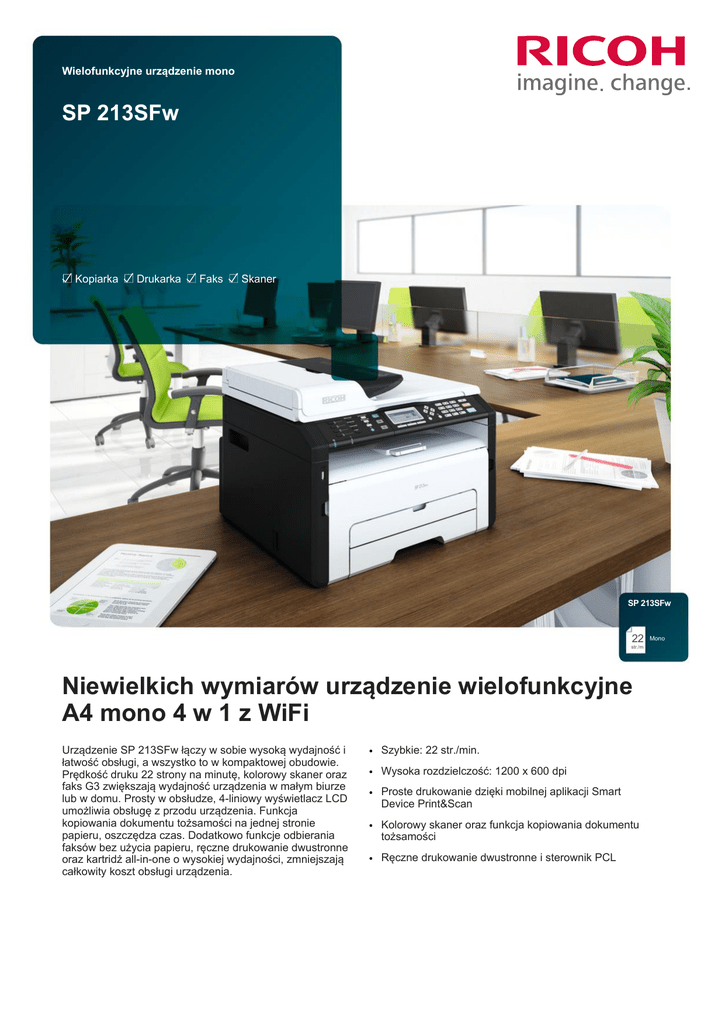 Wielofunkcyjne urządzenie mono SP 213SFw Kopiarka Drukarka Faks Skaner SP 213SFw 22 str./m Niewielkich wymiarów urządzenie wielofunkcyjne A4 mono 4 w 1 z WiFi Urządzenie SP 213SFw łączy w sobie wysoką wydajność i łatwość obsługi, a wszystko to w kompaktowej obudowie. Prędkość druku 22 strony na minutę, kolorowy skaner oraz faks G3 zwiększają wydajność urządzenia w małym biurze lub w domu. Prosty w obsłudze, 4-liniowy wyświetlacz LCD umożliwia obsługę z przodu urządzenia. Funkcja kopiowania dokumentu tożsamości na jednej stronie papieru, oszczędza czas. Dodatkowo funkcje odbierania faksów bez użycia papieru, ręczne drukowanie dwustronne oraz kartridż all-in-one o wysokiej wydajności, zmniejszają całkowity koszt obsługi urządzenia. Szybkie: 22 str./min. Wysoka rozdzielczość: 1200 x 600 dpi Proste drukowanie dzięki mobilnej aplikacji Smart Device Print&Scan Kolorowy skaner oraz funkcja kopiowania dokumentu tożsamości Ręczne drukowanie dwustronne i sterownik PCL Mono Specyfikacja techniczna SP 213SFw Kompatybilność: OGÓLNE Czas nagrzewania: 27 sekund Prędkość wykonania pierwszej kopii: Prędkość wydruku ciągłego: 10 sekundy 22 stron na minutę Pamięć: 128 MB Cykl duty: 20 000 wydruków miesięcznie Drukowanie dwustronne: Ręcznie Wymiary (szer. x gł. x wys.): 402 x 360 x 293 mm Waga: 11,1 kg Źródło zasilania: 220 - 240 V, 50/60 Hz KOPIARKA Kopiowanie wielokrotne: 300 dpi, 600 x 600 dpi Zoom: Od 25% do 400% co 1% DRUKARKA Język drukarki: Maksymalnie: 33,6 Kbps OBSŁUGIWANY PAPIER Zalecany rozmiar papieru: Pojemność wejściowa papieru: Maksymalnie: 151 arkuszy Maksymalnie: 50 arkuszy Gramatura papieru: Standardowa/e kaseta/y na papier: 60 - 105 g/m² Taca ręczna: 60 - 105 g/m² ADF: 52 - 105 g/m² EKOLOGIA Pobór mocy: Rozdzielczość drukowania: 600 x 600 dpi, 1 200 x 600 dpi PCL (80 czcionek) Interfejs: USB 2.0 Bezprzewodowa sieć LAN (IEEE 802.11b/g/n) Windows® XP Windows® Vista Windows® 7 Windows® 8 Windows® 8.1 Windows® Server 2003 Windows® Server 2003R2 Windows® Server 2008 Windows® Server 2008R2 Windows® Server 2012 Windows® Server 2012R2 A4 A5 A6 B5 B6 Pojemność wyjściowa papieru: PCL6 Czcionki: Środowiska Windows®: G3: 3 sek. Prędkość modemu: Do 99 kopii Rozdzielczość: G3 Prędkość transmisji: Maksymalnie: 400 W Tryb gotowości: 65 W Tryb uśpienia: 5 W MATERIAŁY EKSPLOATACYJNE All-in-one cartridge capacity (regular yield): All-in-one cartridge capacity (duża wydajność): Zestaw startowy: Black: 1 500 prints Czarny: 2 600 wydruków Czarny: 700 wydruków Prędkość kopiowania: Niemcy 14 kop./min., Belgia i Austria 9 kop./min. Metoda pomiaru wydajności ISO/IEC 19752. W celu potwierdzenia dostępności modeli, opcji i oprogramowania prosimy skontaktować się z lokalnym autoryzowanym dostawcą produktów Ricoh. SKANER Rozdzielczość: Maksymalnie: 300 dpi Rozmiar oryginału: A4 Sterowniki standardowe: Sieciowy TWAIN, WIA FAKS Certyfikaty ISO9001, ISO14001, ISO27001 Wszystkie marki i/lub produkty są nazwami handlowymi ich właścicieli. Specyfikacja i wygląd zewnętrzny mogą ulec zmianie bez uprzedniej informacji. Kolor produktu może różnić się od przedstawionego w broszurze. Zdjęcia w broszurze nie są prawdziwymi fotografiami i w wyglądzie mogą pojawić się niewielkie różnice. www.ricoh-europe.com Copyright © 2015 Ricoh Europe PLC. All rights reserved. Broszura, jej zawartość i/lub wygląd nie mogą być zmieniane, adoptowane, kopiowane w części i/lub całości ani używane w innych opracowaniach bez pisemnej zgody Ricoh Europe PLC.