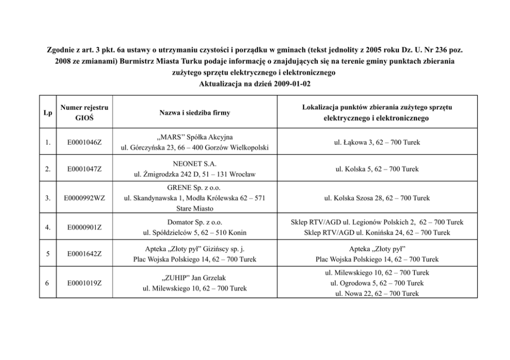 Zgodnie z art. 3 pkt. 6a ustawy o utrzymaniu czystości i porządku w gminach (tekst jednolity z 2005 roku Dz. U. Nr 236 poz. 2008 ze zmianami) Burmistrz Miasta Turku podaje informację o znajdujących się na terenie gminy punktach zbierania zużytego sprzętu elektrycznego i elektronicznego Aktualizacja na dzień 2009-01-02 Lokalizacja punktów zbierania zużytego sprzętu Lp Numer rejestru GIOŚ Nazwa i siedziba firmy 1. E0001046Z ,,MARS’’ Spółka Akcyjna ul. Górczyńska 23, 66 – 400 Gorzów Wielkopolski ul. Łąkowa 3, 62 – 700 Turek 2. E0001047Z NEONET S.A. ul. Żmigrodzka 242 D, 51 – 131 Wrocław ul. Kolska 5, 62 – 700 Turek 3. E0000992WZ GRENE Sp. z o.o. ul. Skandynawska 1, Modła Królewska 62 – 571 Stare Miasto ul. Kolska Szosa 28, 62 – 700 Turek 4. E0000901Z Domator Sp. z o.o. ul. Spółdzielców 5, 62 – 510 Konin Sklep RTV/AGD ul. Legionów Polskich 2, 62 – 700 Turek Sklep RTV/AGD ul. Konińska 24, 62 – 700 Turek 5 E0001642Z Apteka „Złoty pył” Gizińscy sp. j. Plac Wojska Polskiego 14, 62 – 700 Turek Apteka „Złoty pył” Plac Wojska Polskiego 14, 62 – 700 Turek E0001019Z „ZUHIP” Jan Grzelak ul. Milewskiego 10, 62 – 700 Turek ul. Milewskiego 10, 62 – 700 Turek ul. Ogrodowa 5, 62 – 700 Turek ul. Nowa 22, 62 – 700 Turek 6 elektrycznego i elektronicznego 7 E0002661WZ 8 E0003749Z 9 E0006390Z 10 E0007022Z LIDL Polska Sklepy Spożywcze Sp. z o.o. ul. Poznańska 48, Jankowice 62 – 080 Tarnowo Podgórne Przedsiębiorstwo Produkcyjno – Handlowe Sławomir Banasiak Boleszczyn 77, 62 – 731 Przykona Przedsiębiorstwo Wielobranżowe „FLORTECH” Andrzej Styczyński ul. Konińska 1, 62 – 700 Turek Hurtownia Elektrotechniczna Sławomir Banasiak ul. Kolska Szosa 6B, 62 – 700 Turek Przedsiębiorstwo Remontowe Pak Serwis Sp. z o.o. ul. Kazimierska 45, 62 -610 Konin Elektrownia Adamów ul. Przemysłowa 1, 62 – 700 Turek Apteka MEDICATA S.C. K.G. Koszela i P. Koszela ul. Armii Krajowej 1, 62 – 700 Turek BRICOMARCHE KIMI Sp. z o.o. ul. Kolska Szosa 1 B, 62 – 700 Turek Apteka MEDICATA S.C. K.G. Koszela i P. Koszela ul. Armii Krajowej 1, 62 – 700 Turek BRICOMARCHE KIMI Sp. z o.o. ul. Kolska Szosa 1 B, 62 – 700 Turek ul. Wyszyńskiego 1, 62 – 700 Turek Przedsiębiorstwo Wielobranżowe „FLORTECH” Andrzej Styczyński ul. Konińska 1, 62 – 700 Turek 11 E0006774Z 12 E0005653Z 13 E0001747WZ KAUFLAND Polska Markety Sp. z o.o. Sp. k. ul. Szybka 6 – 10, 50 – 421 Wrocław Market KAUFLAND ul. Kolska Szosa 9, 62 – 700 Turek 14 E0001047WZ NEONET S.A. ul. Nyska 48A, 50-505 Wrocław ul. Łąkowa 3, 62 – 700 Turek 15 E0000007S ElektroEko Organizacja Odzysku Sprzętu Elektrycznego i Elektronicznego S.A. ul. Polna 4, 62 – 700 Turek ul. Hrubieszowska 6A, 01-209 Warszawa 16 E0009243Z Przedsiębiorstwo Gospodarki Komunalnej i Mieszkaniowej Sp. z o.o. ul. Polna 4, 62 – 700 Turek ul. Polna 4, 62 – 700 Turek