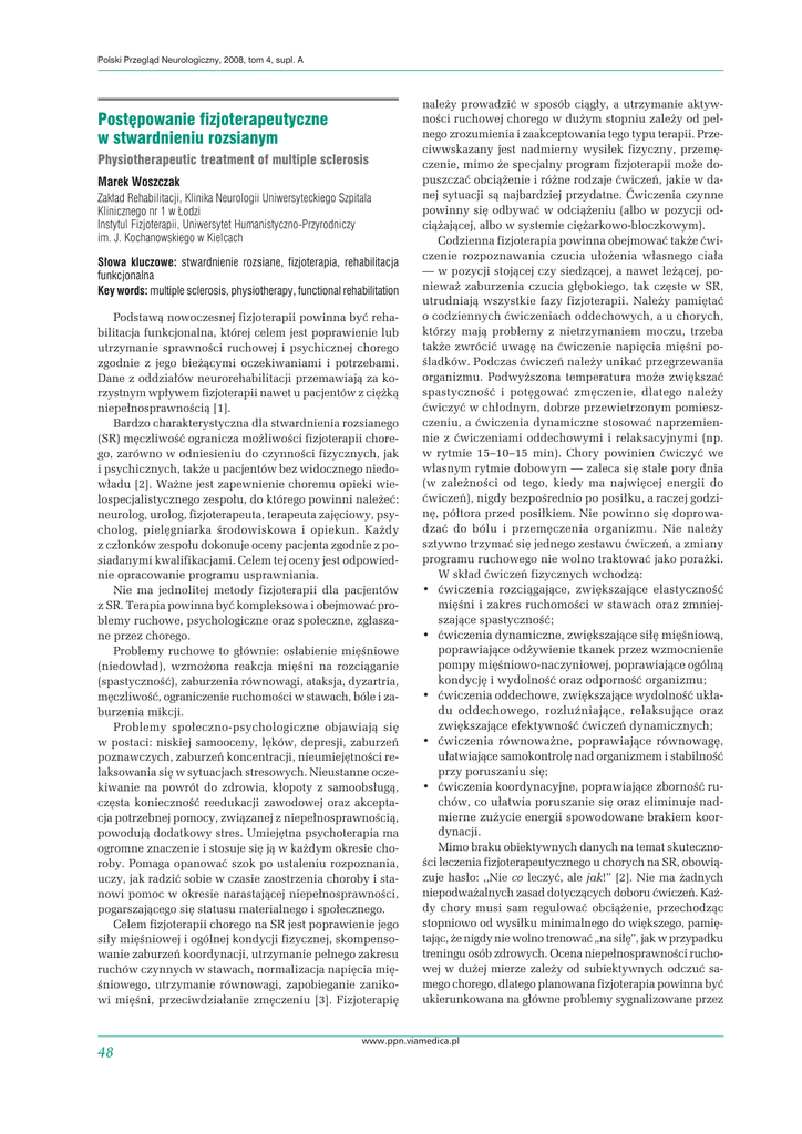 Polski Przegląd Neurologiczny, 2008, tom 4, supl. A Postępowanie fizjoterapeutyczne w stwardnieniu rozsianym Physiotherapeutic treatment of multiple sclerosis Marek Woszczak Zakład Rehabilitacji, Klinika Neurologii Uniwersyteckiego Szpitala Klinicznego nr 1 w Łodzi Instytul Fizjoterapii, Uniwersytet Humanistyczno-Przyrodniczy im. J. Kochanowskiego w Kielcach Słowa kluczowe: stwardnienie rozsiane, fizjoterapia, rehabilitacja funkcjonalna Key words: multiple sclerosis, physiotherapy, functional rehabilitation Podstawą nowoczesnej fizjoterapii powinna być rehabilitacja funkcjonalna, której celem jest poprawienie lub utrzymanie sprawności ruchowej i psychicznej chorego zgodnie z jego bieżącymi oczekiwaniami i potrzebami. Dane z oddziałów neurorehabilitacji przemawiają za korzystnym wpływem fizjoterapii nawet u pacjentów z ciężką niepełnosprawnością [1]. Bardzo charakterystyczna dla stwardnienia rozsianego (SR) męczliwość ogranicza możliwości fizjoterapii chorego, zarówno w odniesieniu do czynności fizycznych, jak i psychicznych, także u pacjentów bez widocznego niedowładu [2]. Ważne jest zapewnienie choremu opieki wielospecjalistycznego zespołu, do którego powinni należeć: neurolog, urolog, fizjoterapeuta, terapeuta zajęciowy, psycholog, pielęgniarka środowiskowa i opiekun. Każdy z członków zespołu dokonuje oceny pacjenta zgodnie z posiadanymi kwalifikacjami. Celem tej oceny jest odpowiednie opracowanie programu usprawniania. Nie ma jednolitej metody fizjoterapii dla pacjentów z SR. Terapia powinna być kompleksowa i obejmować problemy ruchowe, psychologiczne oraz społeczne, zgłaszane przez chorego. Problemy ruchowe to głównie: osłabienie mięśniowe (niedowład), wzmożona reakcja mięśni na rozciąganie (spastyczność), zaburzenia równowagi, ataksja, dyzartria, męczliwość, ograniczenie ruchomości w stawach, bóle i zaburzenia mikcji. Problemy społeczno-psychologiczne objawiają się w postaci: niskiej samooceny, lęków, depresji, zaburzeń poznawczych, zaburzeń koncentracji, nieumiejętności relaksowania się w sytuacjach stresowych. Nieustanne oczekiwanie na powrót do zdrowia, kłopoty z samoobsługą, częsta konieczność reedukacji zawodowej oraz akceptacja potrzebnej pomocy, związanej z niepełnosprawnością, powodują dodatkowy stres. Umiejętna psychoterapia ma ogromne znaczenie i stosuje się ją w każdym okresie choroby. Pomaga opanować szok po ustaleniu rozpoznania, uczy, jak radzić sobie w czasie zaostrzenia choroby i stanowi pomoc w okresie narastającej niepełnosprawności, pogarszającego się statusu materialnego i społecznego. Celem fizjoterapii chorego na SR jest poprawienie jego siły mięśniowej i ogólnej kondycji fizycznej, skompensowanie zaburzeń koordynacji, utrzymanie pełnego zakresu ruchów czynnych w stawach, normalizacja napięcia mięśniowego, utrzymanie równowagi, zapobieganie zanikowi mięśni, przeciwdziałanie zmęczeniu [3]. Fizjoterapię 48 należy prowadzić w sposób ciągły, a utrzymanie aktywności ruchowej chorego w dużym stopniu zależy od pełnego zrozumienia i zaakceptowania tego typu terapii. Przeciwwskazany jest nadmierny wysiłek fizyczny, przemęczenie, mimo że specjalny program fizjoterapii może dopuszczać obciążenie i różne rodzaje ćwiczeń, jakie w danej sytuacji są najbardziej przydatne. Ćwiczenia czynne powinny się odbywać w odciążeniu (albo w pozycji odciążającej, albo w systemie ciężarkowo-bloczkowym). Codzienna fizjoterapia powinna obejmować także ćwiczenie rozpoznawania czucia ułożenia własnego ciała — w pozycji stojącej czy siedzącej, a nawet leżącej, ponieważ zaburzenia czucia głębokiego, tak częste w SR, utrudniają wszystkie fazy fizjoterapii. Należy pamiętać o codziennych ćwiczeniach oddechowych, a u chorych, którzy mają problemy z nietrzymaniem moczu, trzeba także zwrócić uwagę na ćwiczenie napięcia mięśni pośladków. Podczas ćwiczeń należy unikać przegrzewania organizmu. Podwyższona temperatura może zwiększać spastyczność i potęgować zmęczenie, dlatego należy ćwiczyć w chłodnym, dobrze przewietrzonym pomieszczeniu, a ćwiczenia dynamiczne stosować naprzemiennie z ćwiczeniami oddechowymi i relaksacyjnymi (np. w rytmie 15–10–15 min). Chory powinien ćwiczyć we własnym rytmie dobowym — zaleca się stałe pory dnia (w zależności od tego, kiedy ma najwięcej energii do ćwiczeń), nigdy bezpośrednio po posiłku, a raczej godzinę, półtora przed posiłkiem. Nie powinno się doprowadzać do bólu i przemęczenia organizmu. Nie należy sztywno trzymać się jednego zestawu ćwiczeń, a zmiany programu ruchowego nie wolno traktować jako porażki. W skład ćwiczeń fizycznych wchodzą: • ćwiczenia rozciągające, zwiększające elastyczność mięśni i zakres ruchomości w stawach oraz zmniejszające spastyczność; • ćwiczenia dynamiczne, zwiększające siłę mięśniową, poprawiające odżywienie tkanek przez wzmocnienie pompy mięśniowo-naczyniowej, poprawiające ogólną kondycję i wydolność oraz odporność organizmu; • ćwiczenia oddechowe, zwiększające wydolność układu oddechowego, rozluźniające, relaksujące oraz zwiększające efektywność ćwiczeń dynamicznych; • ćwiczenia równoważne, poprawiające równowagę, ułatwiające samokontrolę nad organizmem i stabilność przy poruszaniu się; • ćwiczenia koordynacyjne, poprawiające zborność ruchów, co ułatwia poruszanie się oraz eliminuje nadmierne zużycie energii spowodowane brakiem koordynacji. Mimo braku obiektywnych danych na temat skuteczności leczenia fizjoterapeutycznego u chorych na SR, obowiązuje hasło: ,,Nie co leczyć, ale jak!” [2]. Nie ma żadnych niepodważalnych zasad dotyczących doboru ćwiczeń. Każdy chory musi sam regulować obciążenie, przechodząc stopniowo od wysiłku minimalnego do większego, pamiętając, że nigdy nie wolno trenować „na siłę”,