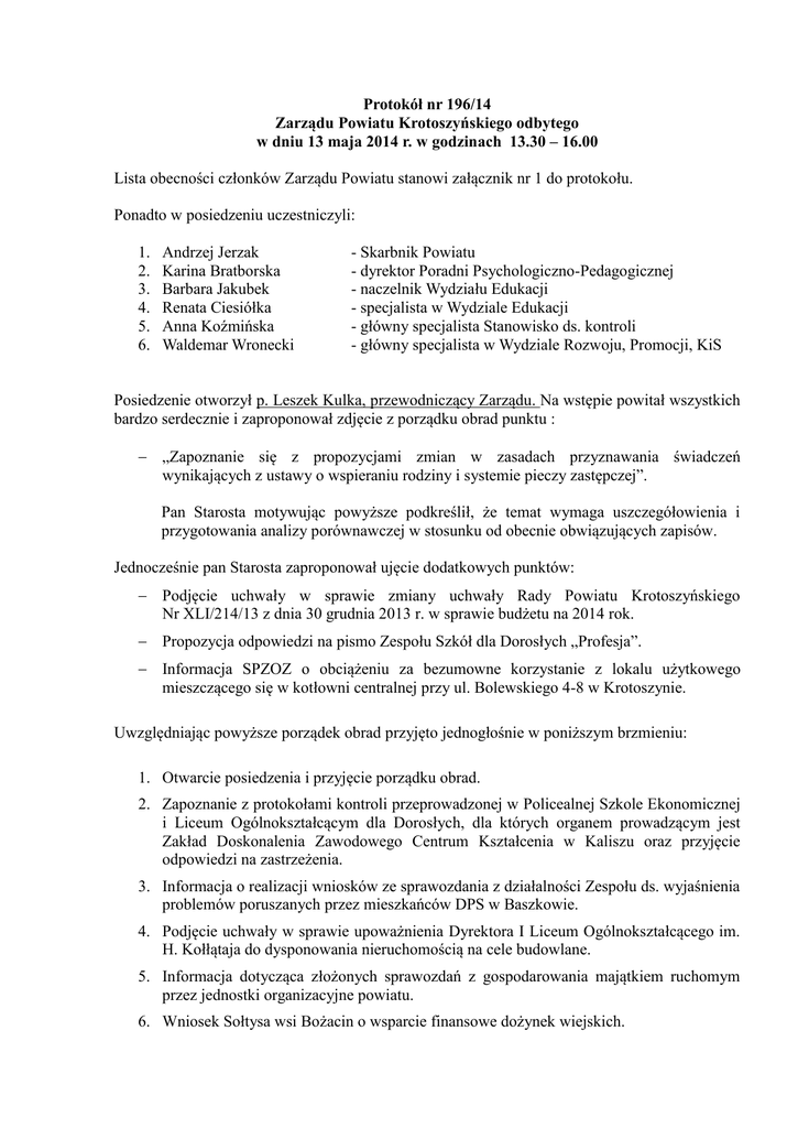 Protokół nr 196/14 Zarządu Powiatu Krotoszyńskiego odbytego w