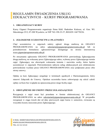 REGULAMIN ŚWIADCZENIA USŁUG EDUKACYJNYCH – KURSY PROGRAMOWANIA 1. ORGANIZUJACY KURSY Kursy Giganci Programowania organizuje firma K&L Radosław Kulesza, ul. Gen. Wł. Sikorskiego 25/2, 07-200 Wyszków, nr NIP 762-198-35-57, REGON 146770236. 2. ZGŁOSZENIE UCZESTNICTWA I PŁATNOŚCI Chęć uczestnictwa w zajęciach należy zgłosić drogą mailową do GIGANCI PROGRAMOWANIA na adres [email protected] lub za pośrednictwem formularza zgłoszeniowego dostępnego na stronie internetowej www.giganciprogramowania.edu.pl. Po otrzymaniu zgłoszenia GIGANCI PROGRAMOWANIA potwierdzają Zgłaszającemu drogą mailową, na wskazany przez Zgłaszającego adres, wybrany przez Zgłaszającego termin zajęć. Zgłaszający ma obowiązek wskazania imienia i nazwiska osoby, która będzie uczestniczyć w zajęciach. Potwierdzeniem nabycia usług edukacyjnych jest elektroniczne potwierdzenie wysłane przez GIGANCI PROGRAMOWANIA oraz podpisanie przez obie strony umowy. Opłatę za kurs Zgłaszający ureguluje w terminach zgodnych z Harmonogramem, który stanowi Załącznik do Umowy. Opiekun uczestnika kursu zobowiązuje się uiścić całość opłaty za Kurs bez względu na opuszczoną przez niego liczbę zajęć. 3. ODSTĄPIENIE OD UMOWY PRZEZ ZGŁASZAJĄCEGO Rezygnacja z zajęć musi być przesłana w formie elektronicznej do GIGANCI PROGRAMOWANIA na adres [email protected]. W przypadku rezygnacji w ciągu trzech dni od daty pierwszych zajęć kursu w semestrze, zwracane są wszystkie koszty uiszczone przez Zgłaszającego. E-MAIL: [email protected] WWW.GIGANCIPROGRAMOWANIA.EDU.PL TEL: 22 112 10 63 W przypadku rezygnacji w późniejszym terminie obowiązuje 2 miesięczne wypowiedzenie Umowy. W przypadku rezygnacji z kursów wakacyjnych całość kwoty uiszczonej przez Zgłaszającego nie podlega zwrotowi. 4. ODSTĄPIENIE OD UMOWY PRZEZ GIGANCI PROGRAMOWANIA GIGANCI PROGRAMOWANIA zastrzegają sobie prawo do odstąpienia od umowy w przypadku zebrania mniej niż 5 uczestników na dany kurs. W tym przypadku przysługuje Opiekunowi zwrot opłat zapłaconych za zajęcia przypadające po dacie odstąpienia od umowy W przypadku, gdy Uczestnik kursu nie jest w stanie uczestniczyć z jakiegokolwiek powodu, w którychkolwiek zajęciach w ramach kursu, przysługuje możliwość odrobienia zajęć z inną grupą, w której realizowany jest ten sam program, w ramach dostępnych miejsc w danym terminie. Odrabianie musi być poprzedzone kontaktem i zgodą pracownika GIGANCI PROGRAMOWANIA. Nieobecność nie uprawnia do otrzymania zwrotu bądź obniżenia kwoty, która musi być uiszczona przez Zgłaszającego. 5. DARMOWY VOUCHER NA KURS Otrzymany darmowy voucher na kurs uprawnia do uczestnictwa w jednym, wybranym kursie wakacyjnym. Uczestnictwo musi być zgłoszone do tygodnia przed rozpoczęciem danego kursu i potwierdzone drogą mailową przez pracownika GIGANCI PROGRAMOWANIA. Voucher jest jednorazowy, nie podlega wymianie na gotówkę, nie może być sprzedany. Organem właściwym do przekazania vouchera są pracownicy GIGANCI PROGRAMOWANIA. 6. RABAT „5++” W przypadku jednoczesnego zapisu 5 lub większej ilości osób na wybrany kurs wakacyjny lub semestralny obowiązuje zniżka 10% ceny kursu dla każdego uczestnika. E-MAIL: [email protected] WWW.GIGANCIPROGRAMOWANIA.EDU.PL TEL: 22 112 10 63 7. CZAS TRWANIA ZAJĘĆ ORAZ PRZERWY Zajęcia kursów semestralnych prowadzone są raz w tygodniu i trwają dwie godziny lekcyjne (2x45 min). Po 45 minutach zajęć obowiązuje przerwa 10 minut. Zajęcia kursów wakacyjnych prowadzone są pięć razy w tygodniu (od poniedziałku do piątku) i trwają dwie godziny lekcyjne (2x45 min). Po 45 minutach zajęć obowiązuje przerwa 10 minut. 8. HARMONOGRAM OPŁAT Opłatę za kurs Zgłaszający ureguluje w terminach zgodnych z Harmonogramem, który stanowi Załącznik do Umowy. 9. ODPOWIEDZIALNOŚĆ Za szkody materialne wyrządzone przez Uczestników kursu - dzieci oraz młodzież odpowiada Opiekun. GIGANCI PROGRAMOWANIA nie ponoszą odpowiedzialności za bezpieczeństwo dzieci i młodzieży przed i po zakończeniu zajęć. Na terenie szkoły obowiązuje bezwzględny zakaz spożywania alkoholu, palenia tytoniu oraz używania wszelkiego rodzaju środków odurzających. Ze względu na wymogi bezpieczeństwa w placówce w której prowadzone są zajęcia obowiązuje zakaz poruszania się na łyżworolkach, deskorolkach, hulajnogach i rowerach. E-MAIL: [email protected] WWW.GIGANCIPROGRAMOWANIA.EDU.PL TEL: 22 112 10 63