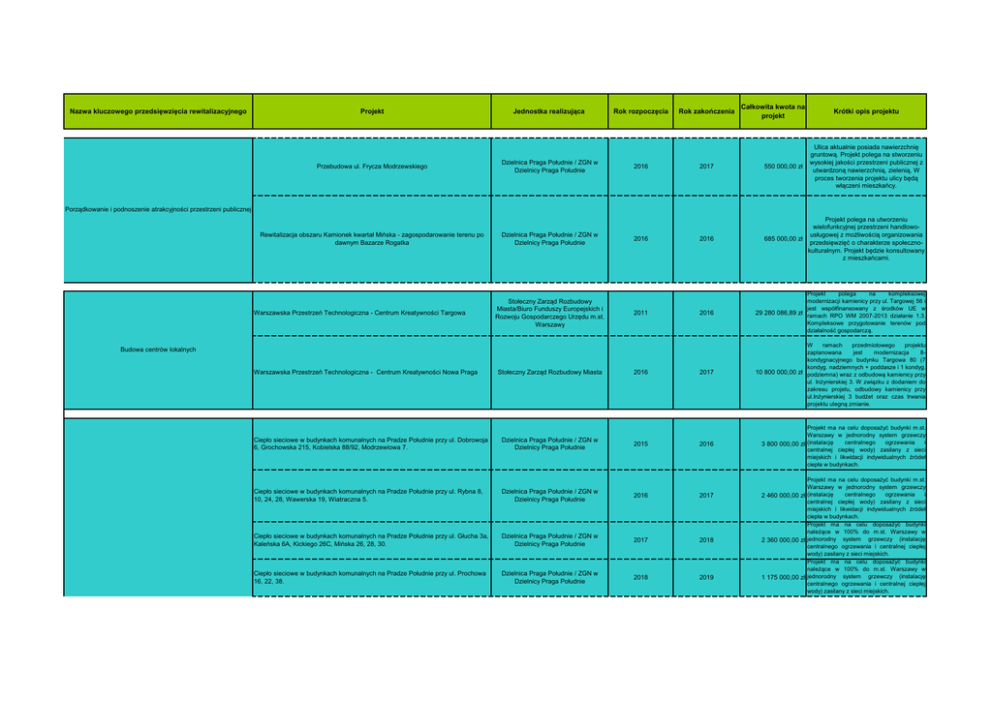Nazwa kluczowego przedsięwzięcia rewitalizacyjnego Projekt Jednostka realizująca Przebudowa ul. Frycza Modrzewskiego Dzielnica Praga Południe / ZGN w Dzielnicy Praga Południe Rewitalizacja obszaru Kamionek kwartał Mińska - zagospodarowanie terenu po dawnym Bazarze Rogatka Dzielnica Praga Południe / ZGN w Dzielnicy Praga Południe Rok rozpoczęcia 2016 Rok zakończenia Całkowita kwota na projekt Krótki opis projektu Ulica aktualnie posiada nawierzchnię gruntową. Projekt polega na stworzeniu wysokiej jakości przestrzeni publicznej z utwardzoną nawierzchnią, zielenią, W proces tworzenia projektu ulicy będą włączeni mieszkańcy. 2017 550 000,00 zł 2016 Projekt polega na utworzeniu wielofunkcyjnej przestrzeni handlowousługowej z możliwością organizowania 685 000,00 zł przedsięwzięć o charakterze społecznokulturalnym. Projekt będzie konsultowany z mieszkańcami. 2016 Projekt polega na kompleksowej modernizacji kamienicy przy ul. Targowej 56 i jest współfinansowany z środków UE w 29 280 086,89 zł ramach RPO WM 2007-2013 działanie 1.3. Kompleksowe przygotowanie terenów pod działalność gospodarczą. W ramach przedmiotowego projektu zaplanowana jest modernizacja 8kondygnacyjnego budynku Targowa 80 (7 kondyg. nadziemnych + poddasze i 1 kondyg. 10 800 000,00 zł podziemna) wraz z odbudową kamienicy przy ul. Inżynierskiej 3. W związku z dodaniem do zakresu projetu, odbudowy kamienicy przy ul.Inżynierskiej 3 budżet oraz czas trwania projektu ulegną zmianie. Porządkowanie i podnoszenie atrakcyjności przestrzeni publicznej Warszawska Przestrzeń Technologiczna - Centrum Kreatywności Targowa Stołeczny Zarząd Rozbudowy Miasta/Biuro Funduszy Europejskich i Rozwoju Gospodarczego Urzędu m.st. Warszawy 2016 2011 Budowa centrów lokalnych Warszawska Przestrzeń Technologiczna - Centrum Kreatywności Nowa Praga Stołeczny Zarząd Rozbudowy Miasta 2016 2017 Ciepło sieciowe w budynkach komunalnych na Pradze Południe przy ul. Dobrowoja 6, Grochowska 215, Kobielska 88/92, Modrzewiowa 7. Dzielnica Praga Południe / ZGN w Dzielnicy Praga Południe 2015 2016 3 800 000,00 zł (instalację Ciepło sieciowe w budynkach komunalnych na Pradze Południe przy ul. Rybna 8, 10, 24, 28, Wawerska 19, Wiatraczna 5. Dzielnica Praga Południe / ZGN w Dzielnicy Praga Południe 2016 2017 2 460 000,00 zł (instalację Ciepło sieciowe w budynkach komunalnych na Pradze Południe przy ul. Głucha 3a, Kaleńska 6A, Kickiego 26C, Mińska 26, 28, 30. Dzielnica Praga Południe / ZGN w Dzielnicy Praga Południe 2017 2018 Ciepło sieciowe w budynkach komunalnych na Pradze Południe przy ul. Prochowa 16, 22, 38. Dzielnica Praga Południe / ZGN w Dzielnicy Praga Południe 2018 2019 Projekt ma na celu doposażyć budynki m.st. Warszawy w jednorodny system grzewczy centralnego ogrzewania i centralnej ciepłej wody) zasilany z sieci miejskich i likwidacji indywidualnych źródeł ciepła w budynkach. Projekt ma na celu doposażyć budynki m.st. Warszawy w jednorodny system grzewczy centralnego ogrzewania i centralnej ciepłej wody) zasilany z sieci miejskich i likwidacji indywidualnych źródeł ciepła w budynkach. Projekt ma na celu doposażyć budynki należące w 100% do m.st. Warszawy w jednorodny system grzewczy (instalację 2 360 000,00 zł centralnego ogrzewania i centralnej ciepłej wody) zasilany z sieci miejskich. Projekt ma na celu doposażyć budynki należące w 100% do m.st. Warszawy w jednorodny system grzewczy (instalację 1 175 000,00 zł centralnego ogrzewania i centralnej ciepłej wody) zasilany z sieci miejskich. Likwidacja indywidualnych źródeł ciepła w budynkach Projekt ma na celu doposażyć budynki należące w 100% do m.st. Warszawy w system grzewczy (instalację centralnego ogrzewania i centralnej ciepłej wody) zasilany z sieci miejskich. Projekt ma na celu doposażyć budynki należące w 100% do m.st. Warszawy w jednorodny system grzewczy (instalację centralnego ogrzewania i centralnej ciepłej wody) zasilany z sieci miejskich. Projekt ma na celu doposażyć budynki należące w 100% do m.st. Warszawy w jednorodny system grzewczy (instalację centralnego ogrzewania i centralnej ciepłej wody) zasilany z sieci miejskich. Projekt ma na celu doposażyć budynki należące w 100% do m.st. Warszawy w jednorodny system grzewczy (instalację centralnego ogrzewania i centralnej ciepłej wody) zasilany z sieci miejskich. Projekt ma na celu doposażyć budynki należące w 100% do m.st. Warszawy w jednorodny system grzewczy (instalację centralnego ogrzewania i centralnej ciepłej wody) zasilany z sieci miejskich. Projekt ma na celu doposażyć budynki należące w 100% do m.st. Warszawy w jednorodny system grzewczy (instalację centralnego ogrzewania i centralnej ciepłej wody) zasilany z sieci miejskich. Projekt ma na celu doposażyć budynki należące w 100% do m.st. Warszawy w jednorodny system grzewczy (instalację centralnego ogrzewania i centralnej ciepłej wody) zasilany z sieci miejskich. Projekt ma na celu doposażyć budynki należące w 100% do m.st. Warszawy w jednorodny system grzewczy (instalację centralnego ogrzewania i centralnej ciepłej wody) zasilany z sieci miejskich. Projekt ma na celu doposażyć budynki należące w 100% do m.st. Warszawy w jednorodny system grzewczy (instalację centralnego ogrzewania i centralnej ciepłej wody) zasilany z sieci miejskich. Projekt ma na celu doposażyć budynki należące w 100% do m.st. Warszawy w jednorodny system grzewczy (instalację centralnego ogrzewania i centralnej ciepłej wody) zasilany z sieci miejskich. Projekt ma na celu doposażyć budynki należące w 100% do m.st. Warszawy w jednorodny system grzewczy (instalację centralnego ogrzewania i centralnej ciepłej wody) zasilany z sieci miejskich. Ciepło sieciowe w budynkach komunalnych na Pradze Północ przy ul. 11 Listopada 26, Lęborska 4, 6, Łochowska 17, 31, 37, 38A, 40, 43, 52, 54, Łomżyńska 31, Radzymińska 8, 16, 29A, 32, 35, 37, 47, 5