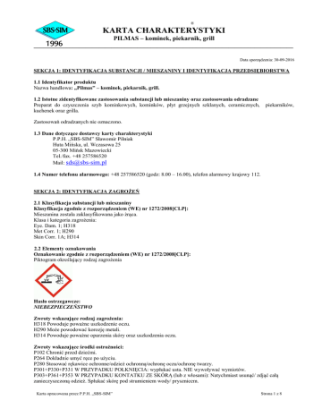 ® KARTA CHARAKTERYSTYKI PILMAS – kominek, piekarnik, grill ________________________________________________________________________________ Data sporządzenia: 30-09-2016 SEKCJA 1: IDENTYFIKACJA SUBSTANCJI / MIESZANINY I IDENTYFIKACJA PRZEDSIĘBIORSTWA 1.1 Identyfikator produktu Nazwa handlowa: „Pilmas” – kominek, piekarnik, grill. 1.2 Istotne zidentyfikowane zastosowania substancji lub mieszaniny oraz zastosowania odradzane Preparat do czyszczenia szyb kominkowych, kominków, płyt grzejnych szklanych, ceramicznych, kuchenek oraz grilla. piekarników, Zastosowań odradzanych nie oznaczono. 1.3 Dane dotyczące dostawcy karty charakterystyki P.P.H. „SBS-SIM” Sławomir Pilniak Huta Mińska, ul. Wczasowa 25 05-300 Mińsk Mazowiecki Tel./fax. +48 257586520 Mail: [email protected] 1.4 Numer telefonu alarmowego: +48 257586520 (godz: 8.00 – 16.00), telefon alarmowy krajowy 112. SEKCJA 2: IDENTYFIKACJA ZAGROŻEŃ 2.1 Klasyfikacja substancji lub mieszaniny Klasyfikacja zgodnie z rozporządzeniem (WE) nr 1272/2008[CLP]: Mieszanina została zaklasyfikowana jako żrąca. Klasa i kategoria zagrożenia: Eye. Dam. 1; H318 Met Corr. 1; H290 Skin Corr. 1A; H314 2.2 Elementy oznakowania Oznakowanie zgodnie z rozporządzeniem (WE) nr 1272/2008[CLP]: Piktogram określający rodzaj zagrożenia Hasło ostrzegawcze: NIEBEZPIECZEŃSTWO Zwroty wskazujące rodzaj zagrożenia: H318 Powoduje poważne uszkodzenie oczu. H290 Może powodować korozję metali. H314 Powoduje poważne oparzenia skóry oraz uszkodzenia oczu. Zwroty wskazujące środki ostrożności: P102 Chronić przed dziećmi. P264 Dokładnie umyć ręce po użyciu. P280 Stosować rękawice ochronne/odzież ochronną/ochronę oczu/ochronę twarzy. P301+P330+P331 W PRZYPADKU POŁKNIĘCIA: wypłukać usta. NIE wywoływać wymiotów. P303+P361+P353 W PRZYPADKU KONTATKU ZE SKÓRĄ (lub z włosami): Natychmiast usunąć/ zdjąć całą zanieczyszczoną odzież. Spłukać skórę pod strumieniem wody/ prysznicem. Karta opracowana przez P.P.H. „SBS-SIM” Strona 1 z 8 ® KARTA CHARAKTERYSTYKI PILMAS – kominek, piekarnik, grill ________________________________________________________________________________ P305+P351+P338 W PRZYPADKU DOSTANIA SIĘ DO OCZU: Ostrożnie płukać wodą przez kilka minut. Wyjąć soczewki kontaktowe, jeżeli są i można je łatwo usunąć. Nadal płukać. P310 Natychmiast skontaktować się z OŚRODKIEM ZATRUĆ lub lekarzem. P501 Zawartość/pojemnik usuwać do upoważnionego odbiorcy odpadów. Zawiera: Wodorotlenek sodu, EDTA oraz środki powierzchniowo czynne 5% lub więcej, ale mniej niż 15%. 2.3 Inne zagrożenia Produkt nie spełnia kryteriów PBT i vPvB zawartych w załączniku XIII do rozporządzenia 1907/2006 REACH SEKCJA 3: SKŁAD / INFORMACJA O SKŁADNIKACH 3.1 Substancje: Nie dotyczy. 3.2 Mieszaniny Substancja/ Nr rejestracji Zawartość CAS WE Klasyfikacja WE 1272/2008 (CLP) Wersenian czterosodowy dwuwodny 607-428-00-2 5% 10378-23-1 200-573-9 Acute Tox. 4; H302 Eye Dam. 1; H318 Wodorotlenek sodu 011-002-00-6 01-2119457892-27-xxxx 6% 1310-73-2 215-185-5 Met Corr. 1; H290 Skin Corr. 1A; H314 C6 Alkyl glucoside 01-2119492545-29-xxxx 4% 54549-24-5 259-217-6 Eye Dam. 1; H318 2-Propyllheptanolethoxilate 2,4% 160875-66-1 Alkohol izopropylowy (propan-2ol) 603-117-00-0 01-2119457558-25-xxxx 5% 67-63-0 200-661-7 Tallowbis(2-hydroxyetyl)amine oxide 2,5 61791-46-6 263-179-6 Eye Dam. 1; H318 Flam. Liq. 2; H225 Eye Irrit. 2; H319 STOT SE 3; H336 Skin Irrit. 2; H315 Eye Irrit. 2; H319 Aquatic Acute 1; H400 Współczynnik M (Ostre): 1 Znaczenie użytych symboli zagrożenia oraz zwrotów H wyjaśniono w punkcie 16 niniejszej karty. SEKCJA 4: ŚRODKI PIERWSZEJ POMOCY 4.1 Opis środków pierwszej pomocy Zalecenia ogólne: Jak najszybciej przerwać ekspozycję na działanie mieszaniny: zdjąć zanieczyszczone ubranie. Po narażeniu drogą oddechową – Wyjść natychmiast na świeże powietrze. W przypadku utrzymującego się podrażnienia dróg oddechowych lub wystąpienia innych objawów szkodliwego działania, takich jak trudności w oddychaniu, skorzystać z pomocy lekarskiej. Po kontakcie ze skórą – Jak najszybciej przemyć skórę dużą ilością wody. W przypadku wystąpienia podrażnień wskazana konsultacja z lekarzem. W kontakcie z okiem – Przemyć oczy dużą ilością czystej wody, przytrzymując odchylone powieki przynajmniej 1015 minut. Niezbędna konsultacja z lekarzem okulistą. W przypadku spożycia – Wypłukać jamę ustną. W miarę możliwości podać dużą ilość płynu do wypicia. Niezwłocznie zasięgnąć porady lekarza. Nie podawać środków zobojętniających. Karta opracowana przez P.P.H. „SBS-SIM” Strona 2 z 8 ® KARTA CHARAKTERYSTYKI PILMAS – kominek, piekarnik, grill ________________________________________________________________________________ Uwaga! Płukanie ust i podanie wody możliwe jedynie w przypadku jeżeli poszkodowany jest przytomny. 4.2 Najważniejsze ostre i opóźnione objawy oraz skutki narażenia -wdychanie -objawy : kichanie, wysięk z nosa, kaszel, ból gardła, trudności w oddychaniu, a nawet śpiączka. -kontakt ze skórą – objawy : możliwe poważne oparzenia; mogą powstawać rany, głębokie owrzodzenia, skóra zimna, rozmiękczona, sina lub bardzo blada. -kontakt z oczami – objawy : uszkodzenia rogówki i spojówek (zaczerwienienie, silny ból) prowadzące do nieodwracalnego pogorszenia widzenia , lub całkowitej utraty wzroku. -spożycie – objawy:- silny ból, wymioty, biegunka, spadek ciśnienia krwi; objawy uszkodzeń mogą pojawić się nawet kilka dni po narażeniu. 4.3 Wskazania dotyczące wszelkiej natychmiastowej pomocy lekarskiej i szczególnego postępowania z poszkodowanym Jeśli poszkodowany jest przytomny upewnić się, czy drogi oddechowe są drożne i ułożyć go w pozycji ustalonej bocznej. Zapewnić pomoc lekarską SEKCJA 5: POSTĘPOWANIE W PRZYPADKU POŻARU 5.1 Środki gaśnicze: Produkt niepalny. Stosować środki gaśn