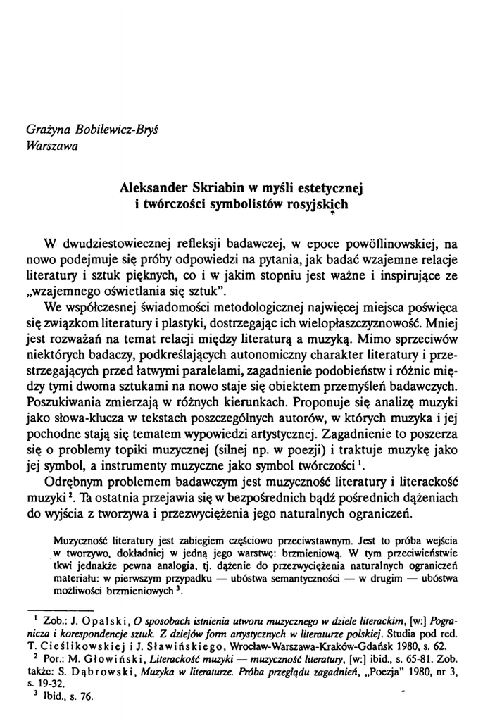 Grażyna Bobilewicz-Bryś Warszawa Aleksander Skriabin w myśli estetycznej i twórczości symbolistów rosyjskich W dwudziestowiecznej refleksji badawczej, w epoce powòflinowskiej, na nowo podejmuje się próby odpowiedzi na pytania, jak badać wzajemne relacje literatury i sztuk pięknych, co i w jakim stopniu jest ważne i inspirujące ze „wzajemnego oświetlania się sztuk". We współczesnej świadomości metodologicznej najwięcej miejsca poświęca się związkom literatury i plastyki, dostrzegając ich wielopłaszczyznowość. Mniej jest rozważań na temat relacji między literaturą a muzyką. Mimo sprzeciwów niektórych badaczy, podkreślających autonomiczny charakter literatury i przestrzegających przed łatwymi paralelami, zagadnienie podobieństw i różnic między tymi dwoma sztukami na nowo staje się obiektem przemyśleń badawczych. Poszukiwania zmierzają w różnych kierunkach. Proponuje się analizę muzyki jako słowa-klucza w tekstach poszczególnych autorów, w których muzyka i jej pochodne stają się tematem wypowiedzi artystycznej. Zagadnienie to poszerza się o problemy topiki muzycznej (silnej np. w poezji) i traktuje muzykę jako jej symbol, a instrumenty muzyczne jako symbol twórczości Odrębnym problemem badawczym jest muzyczność literatury i literackość muzyki 2 . Tk ostatnia przejawia się w bezpośrednich bądź pośrednich dążeniach do wyjścia z tworzywa i przezwyciężenia jego naturalnych ograniczeń. Muzyczność literatury jest zabiegiem częściowo przeciwstawnym. Jest to próba wejścia w tworzywo, dokładniej w jedną jego warstwę: brzmieniową. W tym przeciwieństwie tkwi jednakże pewna analogia, tj. dążenie do przezwyciężenia naturalnych ograniczeń materiału: w pierwszym przypadku — ubóstwa semantyczności — w drugim — ubóstwa możliwości brzmieniowych 3 . 1 Zob.: J. O p a l s k i , O sposobach istnienia utworu muzycznego w dziele literackim, [w:] Pogranicza i korespondencje sztuk. Z dziejów form artystycznych w literaturze polskiej. Studia pod red. T. C i e ś l i k o w s k i e j i J. S ł a w i ń s k i e g o , Wrocław-Warszawa-Kraków-Gdańsk 1980, s. 62. 2 Por.: M. G ł o w i ń s k i , Literackość muzyki — muzyczność literatury, [w:] ibid., s. 65-81. Zob. także: S. D ą b r o w s k i , Muzyka w literaturze. Próba przeglądu zagadnień, „Poezja" 1980, nr 3, s. 19-32. 3 Ibid., s. 76. Dyskusje na temat literackości muzyki w drugiej połowie XIX wieku wywodzą się z teorii monizmu estetycznego Eduarda Hanslicka, przezwyciężającej dualizm formy i treści. Teoria ta sprowadza się do sporu o muzykę absolutną. Już Hegel utrzymywał, że muzyka stała się wyrazem czystego ducha, najgłębszego jego wnętrza. Dla Schopenhauera natomiast muzyka była odbiciem woli, która popycha świat ku nieskończoności 4 . Jednocześnie rozwijająca się korespondencja pomiędzy wszystkimi sztukami wpływa na powstanie muzyki programowej inspirowanej przez inne rodzaje sztuk. Najliczniej reprezentowane są inspiracje literackie, zwłaszcza popularne tematy — Prometeusz, Makbet, Hamlet. Popularnością cieszą się mity i podania antyczne, пр. o Orfeuszu, Psyche. Liczne utwoiy nflizyczne powstają pod wpływem inspiracji plastycznych (np. Wyspa umarłych Siergieja Rachmaninowa według Arnolda Bòcklina). Znaczenie zyskuje kolorystyka dźwiękowa 5 . W okresie symbolizmu oraz impresjonizmu, podobnie jak w romantyzmie, ujawnia się zarówno odrębność stylistyczna poszczególnych sztuk, jak i przejawiają się procesy syntetyzujące. Znamiennym przykładem tych ostatnich jest układ cykliczny oparty na zasadzie tematycznego wiązania poszczególnych części utworu. Zabieg cyklizacji stosują zarówno literaci, malarze, jak i kompozytorzy. W muzycznych cyklach pojawiają się literackie tytuły, które wiążą się z określoną formą muzyczną (np. Poemat ekstazy Skriabina jest przykładem syntezy cyklu i formy sonatowej, Pieśń taneczna Ryszarda Straussa w symfonii Jako rzecze Zaratustra według Nietzschego jest rodzajem scherza). Oddziaływanie wzorców literacko-malarskich uwidacznia się w twórczości symfonicznej o charakterze obrazów. Przeważnie dotyczą one przyrody; mogą być to obrazy fantastyczne lub o wydźwięku narodowym. Natomiast pod wpływem osobistych przeżyć kompozytorów powstają utwoiy o charakterze psychologicznym. Liczne są także świadectwa inspiracji filozoficznych. Z punktu widzenia badań nad zagadnieniem muzyczności literatury interesująca wydaje się interpretacja utworu muzycznego jako modelu konstrukcyjnego dzieła literackiego (może to dotyczyć całego utworu lub jego fragmentu). Interpretacja muzyki jako elementu fikcji literackiej czy interpretacja rzeczywistej kompozycji muzycznej, będącej samoistnym bytem wpisanym w utwór literacki 6 . 4 Zob.: J. C h o m i ń s k i , K. W i l k o w s k a - C h o m i ń s k a , Historia muzyki, t. II, Warszawa 1990, s. 88. 5 O stosowaniu metafor muzycznych w odniesieniu do malarstwa oraz o idei pokrewieństwa muzyki i malarstwa pisze Maria R z e p i ń s k a , [w:] t e j ż e , Historia w dziejach malarstwa europejskiego, t. I, Kraków 1970, s. 331, t. II, Kraków 1979, s. 178. Zob. także: I. E m b e r , Musik in der Malerei. Musik Ais Symbol In Der Molerei Der Europàischen Renaissance Und Des Barock. Corvina Kiadó, Budapest 1984. 6 Zob.: J. O p a l s k i , O sposobach..., op. cit. s. 47-64. Konstruktywne może być także badanie dialogu sztuk lub dialogu arcydzieł, tj. bezpośrednich nawiązań między dziełami, sformułowanymi w innych systemach znakowych. Dzieło artystyczne może bowiem nawiązywać w sposób zamierzony do innego, znanego powszechnie «tekstu», i wymagać od odbiorcy określonej p o s t a w y . Tak rozumiana intertekstualność najczęściej ujawnia się poprzez tytuły utworów. Szczegółowe analizy intertekstualnych nawiązań i sposobu opracowania «cudzych» motywów i wątków pokazuj