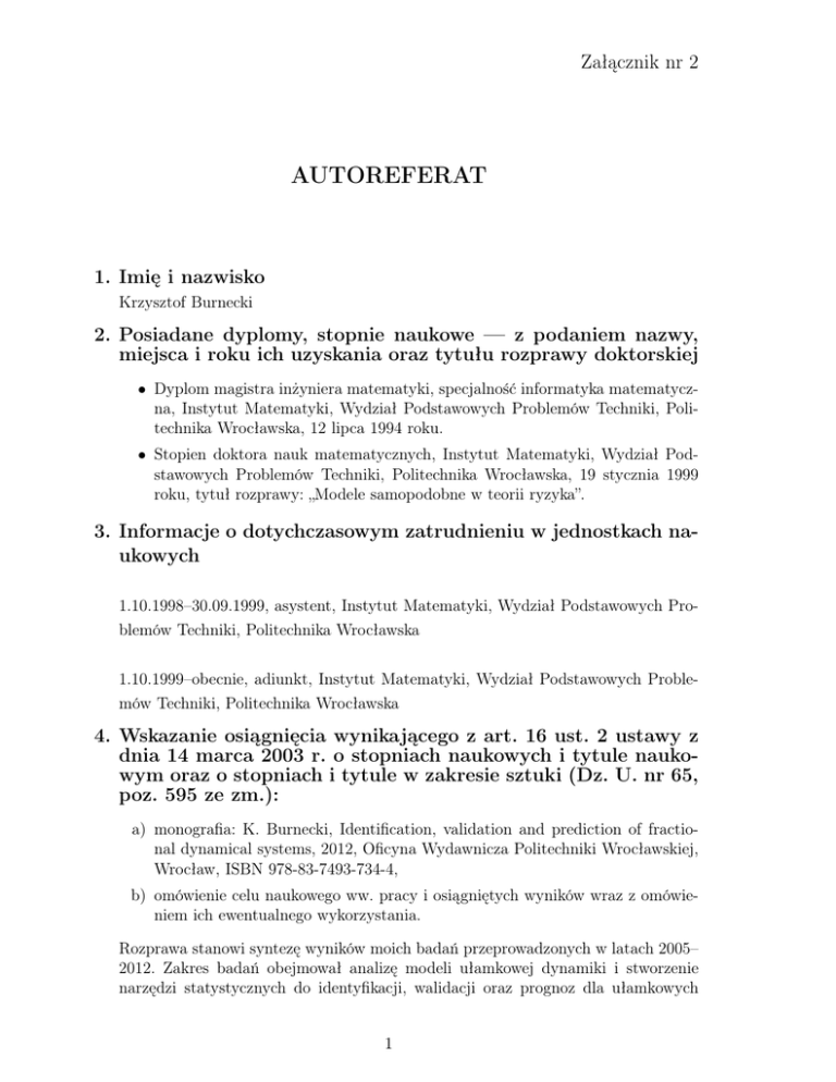 Załącznik nr 2 AUTOREFERAT 1. Imię i nazwisko Krzysztof Burnecki 2. Posiadane dyplomy, stopnie naukowe — z podaniem nazwy, miejsca i roku ich uzyskania oraz tytułu rozprawy doktorskiej • Dyplom magistra inżyniera matematyki, specjalność informatyka matematyczna, Instytut Matematyki, Wydział Podstawowych Problemów Techniki, Politechnika Wrocławska, 12 lipca 1994 roku. • Stopien doktora nauk matematycznych, Instytut Matematyki, Wydział Podstawowych Problemów Techniki, Politechnika Wrocławska, 19 stycznia 1999 roku, tytuł rozprawy: „Modele samopodobne w teorii ryzyka”. 3. Informacje o dotychczasowym zatrudnieniu w jednostkach naukowych 1.10.1998–30.09.1999, asystent, Instytut Matematyki, Wydział Podstawowych Problemów Techniki, Politechnika Wrocławska 1.10.1999–obecnie, adiunkt, Instytut Matematyki, Wydział Podstawowych Problemów Techniki, Politechnika Wrocławska 4. Wskazanie osiągnięcia wynikającego z art. 16 ust. 2 ustawy z dnia 14 marca 2003 r. o stopniach naukowych i tytule naukowym oraz o stopniach i tytule w zakresie sztuki (Dz. U. nr 65, poz. 595 ze zm.): a) monografia: K. Burnecki, Identification, validation and prediction of fractional dynamical systems, 2012, Oficyna Wydawnicza Politechniki Wrocławskiej, Wrocław, ISBN 978-83-7493-734-4, b) omówienie celu naukowego ww. pracy i osiągniętych wyników wraz z omówieniem ich ewentualnego wykorzystania. Rozprawa stanowi syntezę wyników moich badań przeprowadzonych w latach 2005– 2012. Zakres badań obejmował analizę modeli ułamkowej dynamiki i stworzenie narzędzi statystycznych do identyfikacji, walidacji oraz prognoz dla ułamkowych 1 systemów dynamicznych. Ponadto analizowałem zjawiska, które mogą być opisywane za pomocą ułamkowych modeli. Ułamkowe systemy dynamiczne są związane z koncepcją równań ułamkowej dynamiki. Jest to bardzo aktualne pole badań w fizyce, matematyce, mechanice i ekonomii, które zajmują się badaniem obiektów i systemów opisanymi pochodnymi ułamkowych rzędów. Znane ułamkowe równanie Fokkera-Plancka opisujące anomalną dynamikę w obecności zewnętrznego potencjału V (x) opisane jest następujących równaniem: ∂ V 0 (x) ∂2 ∂w(x, t) = 0 Dt1−α + K 2 w(x, t). ∂t ∂x η ∂x " # (1) Równanie zostało wprowadzone w [57] wraz z rozwiązaniami dla szczególnych przypadków. Operator 0 Dt1−α , α ∈ (0, 1) jest pochodną ułamkową typu RiemannaLiouville’a [63]. Wiadomo jest, że 0 Dt1−α wprowadza splot całkowy z wolno zanikającym jądrem potęgowych, które jest typowe dla efektów pamięci w systemach złożonych [65]. W równaniu (1) w(x, t) jest gęstością a symbol (0 ) oznacza pochodną względem współrzędnych przestrzennych wiążąc siłę F (x) oraz potencjał V (x) za pomocą równania F (x) = −V 0 (x). Stała K jest współczynnikiem anomalnej dyfuzji, a η jest uogólnionym współczynnikiem tarcia. Dla α → 1, równanie (1) staję się klasycznym równaniem Fokkera-Plancka. Ułamkowe równanie Fokkera-Plancka opisuje subdyfuzję i podlega uogólnionemu twierdzeniu fluktuacyjno-dysypacyjnemu [57]. Ułamkowe systemy pojawiają się obecnie w bardziej stosowanych dziedzinach. Na przykład termin „anomalna dyfuzja” otrzymuje corocznie około 11 tys. cytowań [51]. W ostatniej dekadzie koncepcje dynamiki fraktalnej oraz anomalnej dyfuzji stały się jednymi z najistotniejszych tematów badan fizyki statystycznej. Proces stochastyczny nazywamy procesem anomalnej dyfuzji, jeśli jego średniokwadratowe przemieszczenie (ang. mean-squared displacement – MSD) posiada własność: EX 2 (t) ∼ ta , gdzie dla 0 < a < 1 obserwujemy subdyfuzję a dla a > 1 superdyfuzję [57] (w przeciwieństwie do klasycznej brownowskiej dyfuzji, dla której a = 1). Lista systemów fizycznych i biologicznych o charakterze anomalnym jest długa i różnorodna. Najważniejsze z nich to: ruch w komórkach biologicznych, transport ładunku w półprzewodnikach, struktury porowate i fraktalne, transport światła w specjalnych układach optycznych, kwantowe przestrzenie optyczne oraz turbulencja plazmowa [57]. W naukach technicznych, w których ułamkowa dynamika ma długą historię do opisu materiałów lepkosprężystych czy kontroli procesu, jest popularna jak nigdy [51]. Pochodne i całki ułamkowych rzędów są używane do opisu obiektów, które mogą być scharakteryzowane przez długą (potęgową) pamięć (zależności długoterminowe) czy samopodobieństwo. Ostatnie lata charakteryzują się dużym zainteresowaniem procesami samopodobnymi i o własności długiej pamięci, w szczególności ułamkowym ruchem Browna (URB), ułamkowym ruchem stabilnym (URS) i szeregami czasowymi FARIMA (ang. Fractional AutoRegressive Integrated Moving Average) [64]. To zainteresowanie widoczne jest chociażby przez dużą liczbą publikacji, które mają któreś z tych pojęć w tytule: w dziedzinach takich jak finanse i ubezpieczenia [54, 58, 6, 53], ekonometria [61], telekomunikacja [3, 2, 72, 48, 68], hydrologia [59], klimatologia [70], lingwistyka [1], sekwencjonowanie DNA [49] czy medycyna [60]. Procesy samopodobne i o własności długiej pamięci pojawiają się także szeroko w biofizyce [69, 55, 31, 50, 7, 24] i 2 astronomii [12, 66]. Wymienione publikacje zawierają analizy wielu problemów z nimi związanych: detekcja własności długiej pamięci i samopodobieństwa, twierdzenia graniczne oraz symulacje procesów o tych własnościach. W rozprawie zajmuję się tylko parametryczną identyfikacją systemów. Nieparametryczna identyfikacja nieliniowych systemów takich jak Hammersteina czy Wienera była już szczegółowo analizowana w literaturze, patrz np. [44]. Zjawiska analizowane w rozprawie wiążą się z projektem „Czujniki i sensory do pomiarów czynników stanowiących zagrożenia w środowisku – modelowanie i monitoring zagrożeń” (Umowa o dofinansowanie nr POIG.01.03.01-02-002/08-00 z dnia 15.12.2008), w k