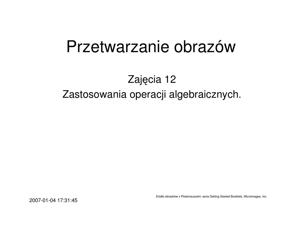Przetwarzanie obrazów Zajęcia 12 Zastosowania operacji algebraicznych. 2007-01-04 17:31:45 Zródło obrazków z Ptolemeuszem: seria Getting Started Booklets, Microimages, Inc. Zasady wykonania ćwiczenia • • • • • Obrazy wynikowe do zadań zapisujemy w pliku nazwiskonr.rvc (bieżące nr 1) a komentarze do wyników zapisujemy w pliku NazwiskoNR.doc, według wskazówek schematów zawartych w ćwiczeniu NIE UMIESZCZAĆ SPACJI I POLSKICH ZNAKÓW W NAZWACH PLIKÓW (geoinfo posiada w2k) Po zajęciach ładujemy pliki z wynikami i komentarzem na serwer przez stronę http://www.geoinfo.amu.edu.pl/geoinf 1) Logujemy się, 2) wybieramy plik do upload’u, 3) Ładujemy, 4) powtarzamy te czynność odpowiednią ilość razy 5) sprawdzamy zawartość katalogu ćwiczenia nr....* • Jeżeli ktoś jest nieobecny na ćwiczeniach to wykonuje ćwiczenie samodzielnie w domu. Opisy do ćwiczeń dostępne są w Internecie pod adresem http://ztg.amu.edu.pl/zajecia.htm, dalej należy wybrać odpowiedni przedmiot • * Jak ten sposób nie będzie działał, to wówczas to proszę wysłać poczta (lotniczą ☺) na adres: [email protected] Metody Panshapening’u Wykonanie Pansharpening’ ma zastosowanie w przygotowaniu obrazów do wizualizacji ekranowej wykorzystywanej podczas interpretacji jak i wydruków w postaci np. wielkoformatowych posterów. Istotą wszystkich metod tego typu jest połączenie informacji zawartej w kanałach wielospektralnych ze szczegółowością obrazu w kanale panchromatycznym (dzięki czemu następuje wyostrzenie obrazu). Metody te oparte są na „podziale” jednego piksela multispektralnego czterema (PanFuse) lub szesnastoma (PanSharp) pikselami obrazu panchromatycznego. W przypadku łączenia obrazów z różnych źródeł (np. panchromatycznego SPOT’a z Landsat’em 5) stosunek podziału może być inny. Wykonywanie PanSharpening’u w systemach IP/GIS może odbywać się w sposób wieloetapowy z pomocą operacji łączenia i operacji geometrycznych lub w kompleksowych procesach specjalnie przygotowanych do jednoetapowego wykonania tych operacji (np. w TNTmips Raster/Combine/Mulitresolution Fusion), bez konieczności wstępnego sprowadzenia obrazów do wspólnej rozdzielczości. Istnieje wiele metod panshapening’u, z których omówione zostaną następujące: BROVEY’a, IHS (HIS), średniej, ESRI, Paris’a i Pendock’a. Metoda BROVEY’a jest najbardziej znaną i jest dostępna w wielu pakietach oprogramowania IP/GIS. Niektóre metody jak ESRI (ArcMap, ArcInfo), Paris’a (TNTmips) czy Pendock’a (TNTmips) mogą być stosowane tylko w określonych pakietach oprogramowania – wynika to między innymi z tego, że są wykonywane na konkretne zamówienie. Nie zawsze wyniki uzyskane określoną metodą będą zadowalające. Stąd znajomość kilku metod pozwoli na osiągnięcie optymalnych rezultatów. Obraz powstały z połączenia dwóch typów obrazu (SPOT XS + Pan) (rozdzielczość 10 metrów) Kompozycja przygotowana przez Z.Zdunek, Fin Skog Geomatics Int. Metody Panshapening’u Metoda BROVEY’a została przedstawiona w zadaniu 3 w ramach ćwiczenia 3, przy omawianiu operacji łączenia. Zaprezentowano tam wersję tej metody dla trzech kanałów (RGB) oraz kanału panchromatycznego. Obecnie w metodach Pansharpenigu wykorzystuje się przy tych transformacjach kanał podczerwony. Dla pięciu kanałów transformacja ta będzie matematycznie zdefiniowana w następujący sposób: W=R+G+B+Ir; DNF = (P – Ir2 *W) / (R2*W + G2*W + B2*W) Red_out = R * DNF, Green_out = G * DNF, Blue = B * DNF, Infrared_out = Ir * DNF gdzie: P – obraz panchromatyczny, R – kanał czerwony, G – kanał zielony, B – kanał niebieski, Ir – kanał podczerwony; W – suma; Realizacja tej metody w takiej postaci w TNTmips możliwa jest z wykorzystanie operacji elementarnych lub po przez napisanie odpowiedniego skryptu SML lub za pomocą procesu Raster/Combine/Mulitresolution Fusion. W pierwszym przypadku na końcowym etapie – wizualizacji - należy wykorzystać model barwny RGBI. Metoda IHS oparta jest o konwersję przestrzeni barwnej RGB do HIS i z powrotem HIS na RGB, przy czym podczas powrotnej operacji zamienia się składową Intensity na kanał panchromatyczny. Operacja ta przeprowadzana musi być na rastrach o tej samej rozdzielczości przestrzennej. Dlatego przed samą operacją pansharpening’u metodą IHS należy doprowadzić rastry do jednakowego wymiaru. Wykonanie tej operacji jest możliwe poprzez automatyczny resampling wykorzystujący zewnętrzny układ współrzędnych do zrównania liczby wierszy i kolumn w obiektach rastrowych. Do tego celu należy użyć procesu Raster/Resampling/Automatic.... ... Metody Panshapening’u Istnieje wiele odmian tej metody. Poniżej zostanie podana postać matematyczna dla czterech kanałów spektralnych i panchromatycznego. Podczas pierwszego etapu konwersji RGB -> HIS jako RGB podstawia się odpowiednio kanały spektralne czerwony, zielony i niebieski. Następnie w etapie powrotnym podstawia się zamiast Intensity, obraz utworzony w oparciu o następujące równanie: I= Pan – Ir2*W, W= R+G+B+I; W TNTmips konwersję pomiędzy przestrzeniami kolorów wykonuje się za pomocą procesu Raster/Combine/Convert Color. W drugim etapie zamiast trzech kanałów RGB można od razu stworzyć 24-bitowy raster złożony RGB (pojedyncza warstwa rastrowa). 1) 1) Metoda prostego uśrednienia posiada następującą postać matematyczną: Dla trzech kanałów spektralnych: Rout = 0.5 * (Rin + Pan), Gout = 0.5 * (Gin + Pan), Bout = 0.5 * (Bin + Pan), Gdzie: R, G, B, Pan – oznaczenia kanałów spektralnych, in – jasność początkowa, out – jasność wynikowa; Dla czterech kanałów spektralnych: a) Rout = 1/3 * (Rin + Pan + Ir), Gout = 1/3 * (Gin + Pan + Ir), Bout = 1/3 * (Bin + Pan + Ir), Gdzie: R, G, B, Ir, Pan – oznaczenia kanałów spektralnych, in – jasność początkowa, out – jasność wynikowa; b) Rout = 0.5 * (Rin + Pan), Go