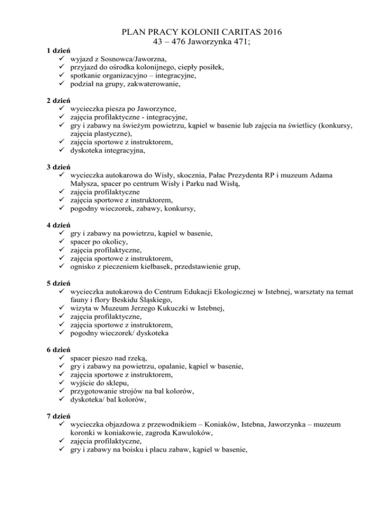 PLAN PRACY KOLONII CARITAS 2016 43 – 476 Jaworzynka 471; 1 dzień wyjazd z Sosnowca/Jaworzna, przyjazd do ośrodka kolonijnego, ciepły posiłek, spotkanie organizacyjno – integracyjne, podział na grupy, zakwaterowanie, 2 dzień wycieczka piesza po Jaworzynce, zajęcia profilaktyczne - integracyjne, gry i zabawy na świeżym powietrzu, kąpiel w basenie lub zajęcia na świetlicy (konkursy, zajęcia plastyczne), zajęcia sportowe z instruktorem, dyskoteka integracyjna, 3 dzień wycieczka autokarowa do Wisły, skocznia, Pałac Prezydenta RP i muzeum Adama Małysza, spacer po centrum Wisły i Parku nad Wisłą, zajęcia profilaktyczne zajęcia sportowe z instruktorem, pogodny wieczorek, zabawy, konkursy, 4 dzień gry i zabawy na powietrzu, kąpiel w basenie, spacer po okolicy, zajęcia profilaktyczne, zajęcia sportowe z instruktorem, ognisko z pieczeniem kiełbasek, przedstawienie grup, 5 dzień wycieczka autokarowa do Centrum Edukacji Ekologicznej w Istebnej, warsztaty na temat fauny i flory Beskidu Śląskiego, wizyta w Muzeum Jerzego Kukuczki w Istebnej, zajęcia profilaktyczne, zajęcia sportowe z instruktorem, pogodny wieczorek/ dyskoteka 6 dzień spacer pieszo nad rzeką, gry i zabawy na powietrzu, opalanie, kąpiel w basenie, zajęcia sportowe z instruktorem, wyjście do sklepu, przygotowanie strojów na bal kolorów, dyskoteka/ bal kolorów, 7 dzień wycieczka objazdowa z przewodnikiem – Koniaków, Istebna, Jaworzynka – muzeum koronki w koniakowie, zagroda Kawuloków, zajęcia profilaktyczne, gry i zabawy na boisku i placu zabaw, kąpiel w basenie, 8 dzień przejście pieszo do miejsca styku trzech granic (Trzycatek), zajęcia profilaktyczne, wieczór regionalny w szałasie góralskim, poznanie stroju góralskiego, degustacja produktów regionalnych, (oscypek, bunc), występ zespołu regionalnego w strojach. 9 dzień wycieczka autokarowa do Cieszyna z przewodnikiem, spacer po Rynku, wzgórze zamkowe, Chlebowa Chata Górki Małe – warsztaty, gry i zabawy na powietrzu, basen lub zajęcia na świetlicy (konkursy, zajęcia plastyczne), zajęcia profilaktyczne, 10 dzień Dzień sportu, turnieje sportowe, zajęcia sportowe z instruktorem, wyłonienie zwycięzców, wręczenie dyplomów i nagród, konkurs talentów, 11 dzień wycieczka autokarowa do Ustronia, Leśny Park Niespodzianek – ścieżka edukacyjna z dziedziny fauny i flory, ścieżka rekreacyjna – aleja bajek, plac zabaw, gry i zabawy na powietrzu, basen lub zajęcia na świetlicy (konkursy, zajęcia plastyczne), zajęcia profilaktyczne, ognisko z pieczeniem kiełbasek, 12 dzień wycieczka piesza do Muzeum Świerka i Woliera Pokazowa Głuszców w Jaworzynce gry i zabawy na powietrzu, basen lub zajęcia na świetlicy (konkursy, zajęcia plastyczne), zajęcia sportowe z instruktorem na orliku – tenis, siatkówka, zajęcia profilaktyczne, 13 dzień wycieczka piesza do Galerii Granica, na granicy Polsko - Czeskiej, zakup pamiątek, Spotkanie na zakończenie kolonii, rozstrzygnięcie konkursów, wręczenie nagród, Dyskoteka, 14 dzień porządkowanie pokoi, powrót do Jaworzna/Sosnowca, UWAGA !!! Plan będzie dostosowany od warunków pogodowych i możliwości uczestników. Może ulec zmianie w zależności od decyzji kierownika kolonii i wychowawców.