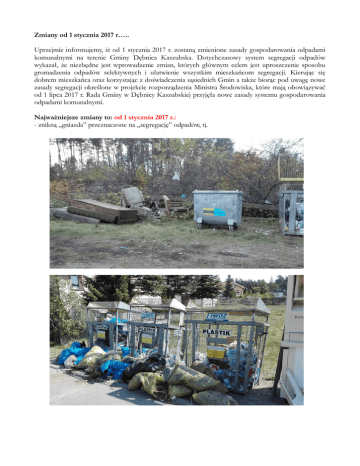 Zmiany od 1 stycznia 2017 r….. Uprzejmie informujemy, iż od 1 stycznia 2017 r. zostaną zmienione zasady gospodarowania odpadami komunalnymi na terenie Gminy Dębnica Kaszubska. Dotychczasowy system segregacji odpadów wykazał, że niezbędne jest wprowadzenie zmian, których głównym celem jest uproszczenie sposobu gromadzenia odpadów selektywnych i ułatwienie wszystkim mieszkańcom segregacji. Kierując się dobrem mieszkańca oraz korzystając z doświadczenia sąsiednich Gmin a także biorąc pod uwagę nowe zasady segregacji określone w projekcie rozporządzenia Ministra Środowiska, które mają obowiązywać od 1 lipca 2017 r. Rada Gminy w Dębnicy Kaszubskiej przyjęła nowe zasady systemu gospodarowania odpadami komunalnymi. Najważniejsze zmiany to: od 1 stycznia 2017 r.: - znikną „gniazda” przeznaczone na „segregację” odpadów, tj. - zacznie obowiązywać segregacja tzw. „u źródła”, czyli odbiór poszczególnych frakcji odpadów bezpośrednio z nieruchomości.; każde gospodarstwo w ramach opłaty będzie otrzymywało worki w różnych kolorach, przeznaczonych do segregacji poszczególnych odpadów komunalnych, tj.: 1) worek w kolorze żółtym przeznaczony na zbieranie tworzyw sztucznych, drobnych metali oraz opakowań wielomateriałowych, odbiór prowadzony będzie raz w miesiącu; 2) worek w kolorze zielonym przeznaczony na zbieranie szkła zarówno bezbarwnego jaki i kolorowego, odbiór prowadzony będzie raz na dwa miesiące; 3) worek w kolorze niebieskim przeznaczony na zbieranie papierów i tektury, odbiór prowadzony będzie raz na kwartał; 4) worek w kolorze brązowym przeznaczony na zbieranie odpadów biodegradowalnych (zielonych), w sezonie zimowym (listopad- marzec) odbiór prowadzony będzie raz na dwa miesiące a w sezonie letnim (kwiecień-październik) prowadzony będzie raz w miesiącu, - każda z wyżej wymienionych frakcji odbierana będzie osobno, zgodnie z harmonogramem odbioru odpadów, - worki do gospodarstw dostarczane będą w trakcie prowadzonego odbioru, w takiej samej ilości co została wystawiona, czyli w przypadku wystawienia w dniu odbioru, np. tworzyw sztucznych 5 sztuk żółtych worków tyle samo firma będzie miała obowiązek Państwu zostawić, - w przypadku niewystarczającej ilości otrzymanych worków, będzie je można pobrać u Sołtysa danego Sołectwa, w Punkcie Selektywnej Zbiórki Odpadów Komunalnych (PSZOK) oraz w Urzędzie Gminy; - dopuszcza się wyposażenie na własny koszt nieruchomości w pojemniki przeznaczone na każdą z wyżej wymienionych frakcji, - dwa razy do roku prowadzona będzie objazdowa zbiórka odpadów wielkogabarytowych, zużytego sprzętu elektrycznego i elektronicznego oraz odzieży i tekstyliów. Dokładne daty odbioru tych frakcji będą podane w harmonogramie odbioru. - przed dniem 1 stycznia 2017 r. każde gospodarstwo, które zadeklarowało segregację otrzyma: 1) zestaw worków do selektywnego gromadzenia odpadów komunalnych, 2) ulotkę informacyjną, co w poszczególnym worku można gromadzić, 3) ponadto do każdego gospodarstwa (również do tego gospodarstwa, które nie wyraziło woli segregowania odpadów) dostarczony zostanie harmonogram odbioru odpadów. - do gromadzenia odpadów poza dostarczanymi workami, bez zmian pozostaje wymóg wyposażenia każdej nieruchomości w pojemnik na gromadzenie zmieszanych odpadów komunalnych, czyli tych które pozostają po wysortowaniu zgromadzonych odpadów, - Właściciel nieruchomości jest zobowiązany wystawić pojemnik/worek z poszczególną frakcją odpadu w dniu prowadzenia jego odbioru przed posesję. W danym dniu nie będą odbierane wystawione inne rodzaje odpadów niż określone w harmonogramie odbioru. Ważną zmianą w naszym systemie jest również fakt, iż od 1 stycznia 2017 r. z systemu gospodarki odpadami komunalnymi zostają wyłączone nieruchomości na których nie zamieszkują mieszkańcy a powstają odpady komunalne (nieruchomości niezamieszkałe), czyli np. zakłady, sklepy, cmentarze itp. Decyzja o wyłączeniu tych nieruchomości była podyktowana przede wszystkim tym, iż w wielu przypadkach podmioty prowadzące działalność miały trudności w rozróżnieniu co stanowi odpad komunalny a co jest odpadem powstającym na skutek prowadzenie ich działalności (poprodukcyjnym) co skutkowało nadmiernym tonażem oddawanych odpadów, również utrudnienie sprawiała częstotliwość odbioru odpadów komunalnych. Podmioty te zobowiązane są od 1 stycznia 2017 r. podpisać indywidualną umowę z przedsiębiorcą wpisanym do rejestru działalności regulowanej na odbiór odpadów komunalnych. Bez zmian pozostaje: - prowadzenie odbioru odpadów tzw. problemowych, tj. 1) zużyte baterie i akumulatorki można dostarczać do placówek oświatowych na terenie Gminy Dębnica Kaszubska oraz Urzędu Gminy, 2) przeterminowane leki można dostarczać do punktów aptecznych i ośrodków zdrowia zlokalizowanych na terenie Gminy Dębnica Kaszubska oraz Urzędu Gminy, - Punkt Selektywnej Zbiórki Odpadów Komunalnych (PSZOK), zlokalizowany przy Zakładzie Gospodarki Komunalnej w Dębnicy Kaszubskiej, gdzie bezpłatnie można oddać: 1) papier i tekturę, tworzywa sztuczne, metal, opakowania wielomateriaowe, szkło, 2) odpady ulegające biodegradacji, 3) przeterminowane chemikalia, 4) zużyty sprzęt elektryczny i elektroniczny, 5) meble i inne odpady wielkogabarytowe, 6) zużyte opony, 7) odpady budowlane i rozbiórkowe stanowiące odpady komunalne, 8) odzież i tekstylia. PSZOK czynny jest od wtorku do piątku w godzinach od 10 do 18 oraz w soboty od 7 do 15. Transport odpadów do PSZOKu prowadzony jest we własnym zakresie i na własny koszt. Mieszkańcu! Dla usprawnienia systemu pamiętajmy aby: - oznaczyć nieruchomość numerem porządkowym, - koniecznie wyposażyć nieruchomość w pojemnik na odpady zmieszane, - podpisać pojemnik na odpady zmieszane numerem porządkowym nieruchomości, - wystawiać przed posesję
