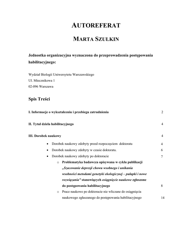 AUTOREFERAT MARTA SZULKIN Jednostka organizacyjna wyznaczona do przeprowadzenia postępowania habilitacyjnego: Wydział Biologii Uniwersytetu Warszawskiego Ul. Miecznikowa 1 02-096 Warszawa Spis Treści I. Informacje o wykształceniu i przebiegu zatrudnienia 2 II. Tytuł dzieła habilitacyjnego 4 III. Dorobek naukowy 4 Dorobek naukowy zdobyty przed rozpoczęciem doktoratu 4 Dorobek naukowy zdobyty w czasie doktoratu. 6 Dorobek naukowy zdobyty po doktoracie 7 o Problematyka badawcza opisywana w cyklu publikacji „Szacowanie depresji chowu wsobnego i unikania wsobności metodami genetyki ekologicznej – pułapki i nowe rozwiązania” stanowiących osiągnięcie naukowe zgłoszone do postępowania habilitacyjnego 8 o Prace naukowe po doktoracie nie wliczane do osiągnięcia naukowego zgłaszanego do postępowania habilitacyjnego 14 Marta Szulkin - Autoreferat I. Informacje o wykształceniu i przebiegu zatrudnienia Wykształcenie 10. 2004 – 05. 2008. Studia Doktoranckie, Wydział Zoologii, University of Oxford, Wielka Brytania. Tytuł pracy: „Chów wsobny i jego unikanie w populacji dzikich ptaków”. (ang. "Inbreeding and its avoidance in a wild bird poulation”) Promotor pracy: Profesor Ben C. Sheldon, Edward Grey Institute, Wydział Zoologii, University of Oxford, Wielka Brytania. 10. 2002 – 09. 2003. Studia Magisterskie w dziedzinie Biologii, Wydział Zoologii, University of Oxford, Wielka Brytania. Tytuł pracy pierwszej: „Zastosowanie starego DNA do zbadania historii ewolucyjnej dwóch wymarłych gatunków orłów z Nowej Zelandii”. (ang. "Using ancient DNA to investigate the evolutionary history of two extinct New Zealand Eagles") Promotor pracy: Dr Michael Bunce, Ancient Biomolecules Centre, Wydział Zoologii, University of Oxford, Wielka Brytania. Tytuł pracy drugiej: „Wpływy płci i czynników genetycznych na wzrost sikorek modraszek w gniazdach o eksperymentalnie zmienionej proporcji płci” (ang. "The influence of sex and genetic factors on Blue Tit growth in sex ratio manipulated broods") Promotor pracy: Prof. Ben C. Sheldon, Edward Grey Institute, Wydział Zoologii, University of Oxford, Wielka Brytania. 10. 1998 – 04. 2004. Studia magisterskie na wydziale Biologii, Uniwersytet Warszawski, Polska. Tytuł pracy: „Synchronizacja aktywności ruchowej Daphnia pulicaria w sytuacji zagrożenia ze strony drapieżcy”. Promotor pracy: Prof. Dr hab. Piotr Dawidowicz, Zakład Hydrobiologii, Instytut Zoologii, Wydział Biologii Uniwersytetu Warszawskiego. 2 Marta Szulkin - Autoreferat Zatrudnienie 05.2012- stan obecny. IEF Marie Curie Fellow, CNRS, Centre d’Ecologie Fonctionnelle et Evolutive (CEFE), Montpellier, Francja. 02.2012-03.2012. Konsultant dla Food and Agriculture Organisation Organizacji Narodów Zjednoczonych (UN FAO), Forest Biodiversity Team, Rzym, Włochy. 11.2011- stan obecny. University of Oxford Zoology Department Research Associate, Wielka Brytania. 10.2007-12.2011. Research Fellow in Biology, Magdalen College oraz Wydział Zoologii, University of Oxford, Wielka Brytania. 3 Marta Szulkin - Autoreferat II. Tytuł dzieła habilitacyjnego „Szacowanie depresji chowu wsobnego i unikania wsobności metodami genetyki ekologicznej – pułapki i nowe rozwiązania” ang. “Quantifying inbreeding depression and inbreeding avoidance in ecological genetics – pitfalls and new solutions” III. Dorobek Naukowy Dorobek naukowy zdobyty przed rozpoczęciem doktoratu Aktywne zaangażowanie w prace badawczą rozpoczęłam w 2001 roku, gdy na trzecim roku studiów magisterskich na wydziale biologii Uniwersytetu Warszawskiego wyjechałam w ramach wymiany Erazmus do Uniwersytetu Montpellier II we Francji. Odbyłam tam 5-cio miesięczny staż z genetyki populacyjnej pod opieką Dr Nicolas Bierne (ISEM / CNRS Sète, Francja). Ten właśnie pobyt zapoczątkował moje wieloletnie zainteresowanie ekologią ewolucyjną. Zafascynowało mnie, jak wielką rolę mogą odgrywać procesy genetyczne w dynamice ekologicznej populacji. Publikacja naukowa, która powstała na podstawie mojej pracy laboratoryjnej ukazała się w 2006 roku (Bierne et al. 2006 Proceedings of the Royal Society B) i dotyczyła genetyki populacji strefy hybrydowej omułka jadalnego (Mytilus edulis). Zebrane przeze mnie dane zostały również wykorzystane w publikacji Dr Nicolas Bierne w 2003 roku (Bierne et al. 2003 Molecular Ecology). Następne lata pracy badawczej rozwinęły moje zainteresowania szeroko pojętą biologią ewolucyjną, a ściślej – kwestiami z zakresu genetyki ekologicznej – czyli nauki o genetyce populacji żyjących w warunkach naturanych , ekologii behawioralnej oraz genetyki ochrony przyrody (ang. conservation genetics). Po czwartym roku studiów magisterskich na wydziale biologii Uniwersytetu Warszawskiego rozpoczęłam roczne studia magisterskie z Biologii Integratywnej (ang. MSc in Integrative Biosciences) na wydziale zoologii Uniwersytetu w Oksfordzie. Poza pracami zaliczeniowymi, musiałam odbyć dwa 4 miesięczne staże naukowe w wybranych laboratoriach badawczych na wydziałach przyrodniczych Uniwersytetu w 4 Marta Szulkin - Autoreferat Oksfordzie. Pierwszy staż odbyłam w laboratorium „Starego DNA” (Henry Wellcome Ancient Biomolecules Centre), gdzie zsekwencjonowałam odcinki Cytochromu B prób sprzed 2000 lat wymarłego gatunku Nowozelandzkiego orła olbrzyma (ang. New Zealand giant eagle, Harpagornis moorei) oraz 13 dodatkowych gatunków orłow, aby ustalić pokrewieństwo filogenetyczne H. moorei. Ku wielkiemu zdumieniu wszystkich, i wbrew ustalonej filogenezie orła opartej na analizie osteologicznej sugerujące najbliższe pokrewieństwo z Orłem australijskim Aquila audax, najbliższymi krewniakami Orła olbrzyma okazały się małe Orzełki z rodzaju Hieraaetus sp. Praca ta zostałą wzbogacona o dane z DNA jądrowego (do których przyczyniłąm się tylko częściowo), a następnie opublikowana przez mojego opiekuna naukowego w PLoS Biology (Bunce,