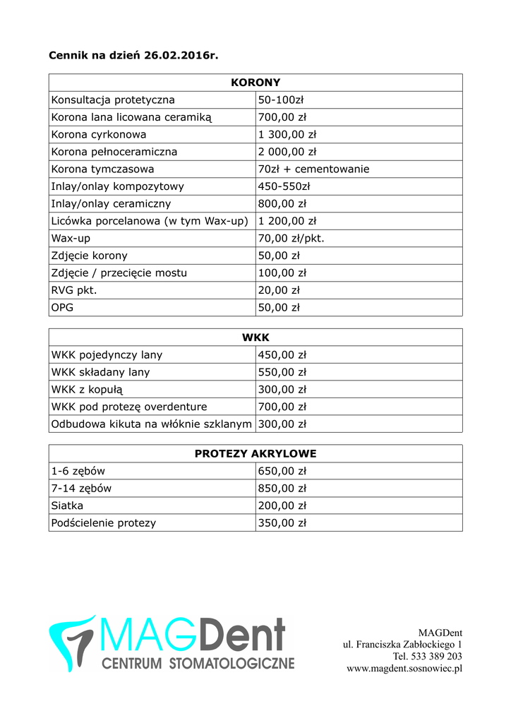 Cennik na dzień 26.02.2016r. KORONY Konsultacja protetyczna 50-100zł Korona lana licowana ceramiką 700,00 zł Korona cyrkonowa 1 300,00 zł Korona pełnoceramiczna 2 000,00 zł Korona tymczasowa 70zł + cementowanie Inlay/onlay kompozytowy 450-550zł Inlay/onlay ceramiczny 800,00 zł Licówka porcelanowa (w tym Wax-up) 1 200,00 zł Wax-up 70,00 zł/pkt. Zdjęcie korony 50,00 zł Zdjęcie / przecięcie mostu 100,00 zł RVG pkt. 20,00 zł OPG 50,00 zł WKK WKK pojedynczy lany 450,00 zł WKK składany lany 550,00 zł WKK z kopułą 300,00 zł WKK pod protezę overdenture 700,00 zł Odbudowa kikuta na włóknie szklanym 300,00 zł PROTEZY AKRYLOWE 1-6 zębów 650,00 zł 7-14 zębów 850,00 zł Siatka 200,00 zł Podścielenie protezy 350,00 zł MAGDent ul. Franciszka Zabłockiego 1 Tel. 533 389 203 www.magdent.sosnowiec.pl PROTEZY SZKIELETOWE Proteza szkieletowa 1 500,00 zł Szynoproteza 1 700,00 zł Zasuwy/zatrzaski (1 sztuka) 400,00 zł NAPRAWY Sklejenie pękniętej protezy akrylowej 100,00 zł Dostawienie zęba do protezy akrylowej 100,00 zł (kolejny +20,00zł) Dostawienie ciernia / klamry do protezy szkieletowej 200-300zł Zacementowanie korony / mostu 50,00 zł wykonanego w gabinecie po gwarancji Korekta protezy akrylowej wykonanej poza gabinetem 50,00 zł SZYNY Relaksacyjna 400,00 zł (w tym 2 kontrole) MAGDent ul. Franciszka Zabłockiego 1 Tel. 533 389 203 www.magdent.sosnowiec.pl STOMATOLOGIA ZACHOWAWCZA Klasa I 130,00 zł Klasa II MO / OD 150,00 zł Klasa II MOD 170,00 zł Klasa III 130,00 zł Klasa IV 130,00 zł Klasa V 100,00 zł Odbudowa estetyczna zęba 200,00 zł Odbudowa zęba trzonowego 200,00 zł Odbudowa zęba do leczenia endodontycznego (kompozyt) 80,00 zł Osadzenie włókna szklanego 200,00 zł (+ wypełnienie) Opatrunek glassjonomerowy 80,00 zł Opatrunek ZnO+E 50,00 zł Opatrunek Coltosol F 20,00 zł Lakowanie bruzd (1 ząb) 50,00 zł RVG pkt. 20,00 zł OPG 50,00 zł MAGDent ul. Franciszka Zabłockiego 1 Tel. 533 389 203 www.magdent.sosnowiec.pl PEDODONCJA Wizyta adaptacyjna 50,00 zł Wizyta pacjenta niewspółpracującego 50,00 zł (po podjęciu próby leczenia) Wypełnienie kompozytowe / kompomerowe 120,00 zł Wypełnienie glassjonomerowe 100,00 zł Dewitalizacja 100,00 zł Leczenie endodontyczne 100,00 zł (każda kolejna wizyta) Usunięcie zęba mlecznego 50-100zł Lakowanie bruzd (1 ząb) 50,00 zł RVG pkt. 20,00 zł OPG 50,00 zł PROFILAKTYKA Lakowanie bruzd (1ząb) 50,00 zł Scaling 100-150zł Scaling+piaskowanie+fluoryzacja 200-300zł Fluoryzacja pianką 50,00 zł Fluoryzacja FluorProtector 100,00 zł Leczenie nadwrażliwości (1 ząb bond / 30,00 zł fluor) Profesjonalny instruktarz higieny (dobór szczoteczki, pasty, płynu do płukania, szczoteczek międzyzębowych, nici, techniki mycia itd) 50,00 zł PERIODONTOLOGIA I BŁONY ŚLUZOWE Konsultacja periodontologiczna 100,00 zł Leczenie kieszeni przyzębnej 20,00 zł Kiretaż zamknięty (1 ząb) 100,00 zł Kiretaż zamknięty (1 łuk) 400,00 zł Leczenie zmian na błonie śluzowej 50,00 zł MAGDent ul. Franciszka Zabłockiego 1 Tel. 533 389 203 www.magdent.sosnowiec.pl ENDODONCJA (wyłącznie mikroskopowa) Konsultacja endodontyczna 50-100,00 zł Dewitalizacja / ekstyrpacja 100,00 zł Odbudowa zęba do leczenia endodontycznego (kompozyt) 80,00 zł Pierwotne leczenie endodontyczne (opracowanie i wypełnienie kanału korzeniowego) 200,00 zł Powtórne leczenie endodontyczne (udrożnienie, opracowanie i wypełnienie kanału korzeniowego) 250,00 zł (do 300zł w trudnych przypadkach np. cement w kk.) Opatrunek endodontyczny (1 kanał korzeniowy) 20,00 zł Usunięcie WKK lanego 150,00 zł Usunięcie WKK gwintowanego 150,00 zł Osadzenie WKK z włókna szklanego 200,00 zł Zamknięcie perforacji w dnie komory MTA 150,00 zł Zamknięcie perforacji w kanale korzeniowym MTA 150,00 zł Zamknięcie wierzchołków MTA 50,00 zł (za jedne wierzchołek) Usunięcie złamanego narzędzia z kanału korzeniowego 150-250zł Wypisanie recepty 20,00 zł Wybielanie pojedynczego zęba po endodoncji 100,00 zł Leczenie przez koronę protetyczną Plus 50zł do ceny wyjściowej za kanał korzeniowy RVG pkt. 20,00 zł OPG 50,00 zł MAGDent ul. Franciszka Zabłockiego 1 Tel. 533 389 203 www.magdent.sosnowiec.pl CHIRURGIA STOMATOLOGICZNA Konsultacja chirurgiczna 50-100,00 zł Ekstrakcja z. 1 korzeniowy 120,00 zł Ekstrakcja z. 2 korzeniowy 150,00 zł Ekstrakcja z. Trzonowy 200,00 zł Ekstrakcja chirurgiczna 150-450zł Ekstrakcja zęba zatrzymanego 400-600zł Ekstrakcja zęba złamanego poza gabinetem Plus 100,00 zł Usunięcie zęba mlecznego 50-100zł Znieczulenie 20,00 zł Znieczulenie The Wand 40,00 zł Nacięcie ropnia 150,00 zł Nakłucie ropnia/nacieku zapalnego 100,00 zł Szycie ranny 50,00 zł Zaopatrzenie PUZ 200,00 zł Leczenie zapalenia zębodołu (po ekstrakcji poza gabinetem) 50-100zł Wycięcie kieszeni ósemki 100,00 zł Hemisekcja 400,00 zł Premolaryzacja 400,00 zł Resekcja wierzchołka z wypełnieniem wstecznym MTA 600,00 zł Wycięcie przerostu błony śluzowej (za 1 ćwiartkę łuku) 400,00 zł Wycięcie zmiany na błonie śluzowej 350,00 zł Wypisanie recepty 20,00 zł RVG pkt. 20,00 zł OPG 50,00 zł MAGDent ul. Franciszka Zabłockiego 1 Tel. 533 389 203 www.magdent.sosnowiec.pl WYBIELANIE Nakładkowe 600,00 zł Lampa UV (scaling+piaskowanie+polerowanie gratis) 800,00 zł Pojedynczego zęba po endodoncji 100,00 zł RADIOLOGIA RVG pkt. 20,00 zł OPG 50,00 zł POZOSTAŁE Pakiet: OPG + RVG pkt. 3 szt. + 200,00 zł modele diagnostyczne + plan leczenia MAGDent ul. Franciszka Zabłockiego 1 Tel. 533 389 203 www.magdent.sosnowiec.pl