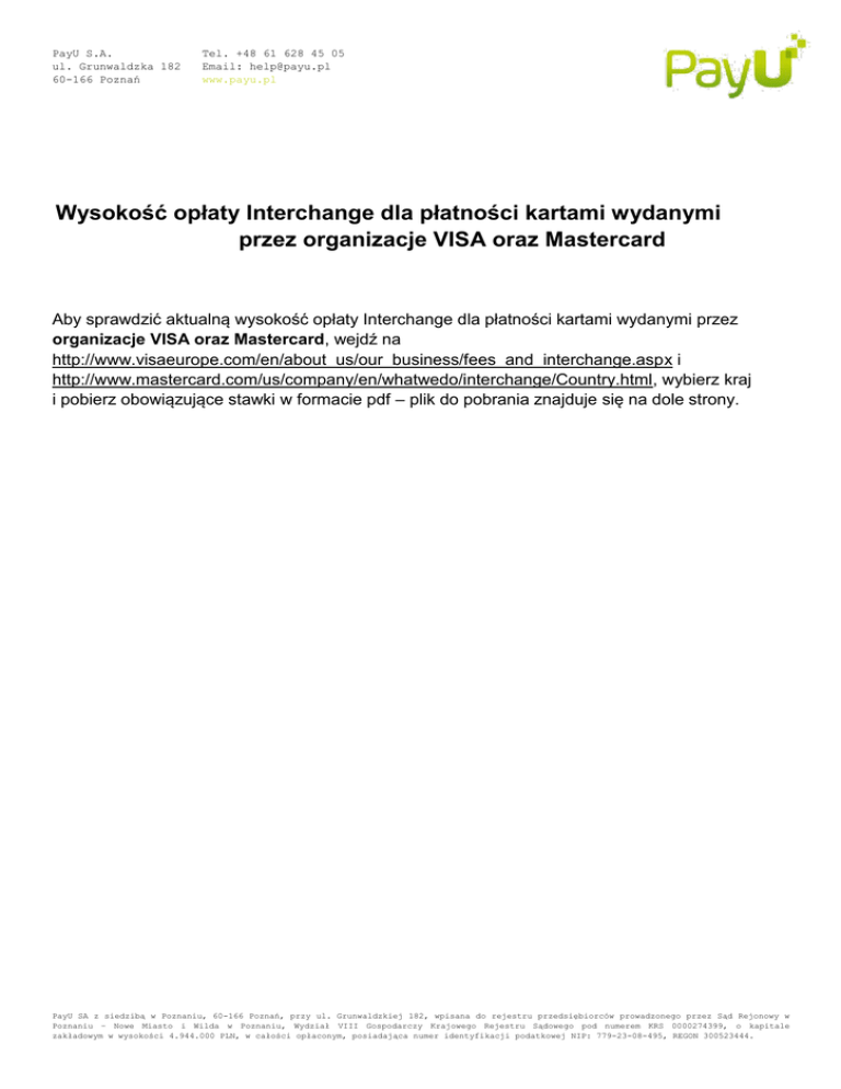 PayU S.A. ul. Grunwaldzka 182 60-166 Poznań Tel. +48 61 628 45 05 Email: [email protected] www.payu.pl Wysokość opłaty Interchange dla płatności kartami wydanymi przez organizacje VISA oraz Mastercard Aby sprawdzić aktualną wysokość opłaty Interchange dla płatności kartami wydanymi przez organizacje VISA oraz Mastercard, wejdź na http://www.visaeurope.com/en/about_us/our_business/fees_and_interchange.aspx i http://www.mastercard.com/us/company/en/whatwedo/interchange/Country.html, wybierz kraj i pobierz obowiązujące stawki w formacie pdf – plik do pobrania znajduje się na dole strony. PayU SA z siedzibą w Poznaniu, 60-166 Poznań, przy ul. Grunwaldzkiej 182, wpisana do rejestru przedsiębiorców prowadzonego przez Sąd Rejonowy w Poznaniu – Nowe Miasto i Wilda w Poznaniu, Wydział VIII Gospodarczy Krajowego Rejestru Sądowego pod numerem KRS 0000274399, o kapitale zakładowym w wysokości 4.944.000 PLN, w całości opłaconym, posiadająca numer identyfikacji podatkowej NIP: 779-23-08-495, REGON 300523444.