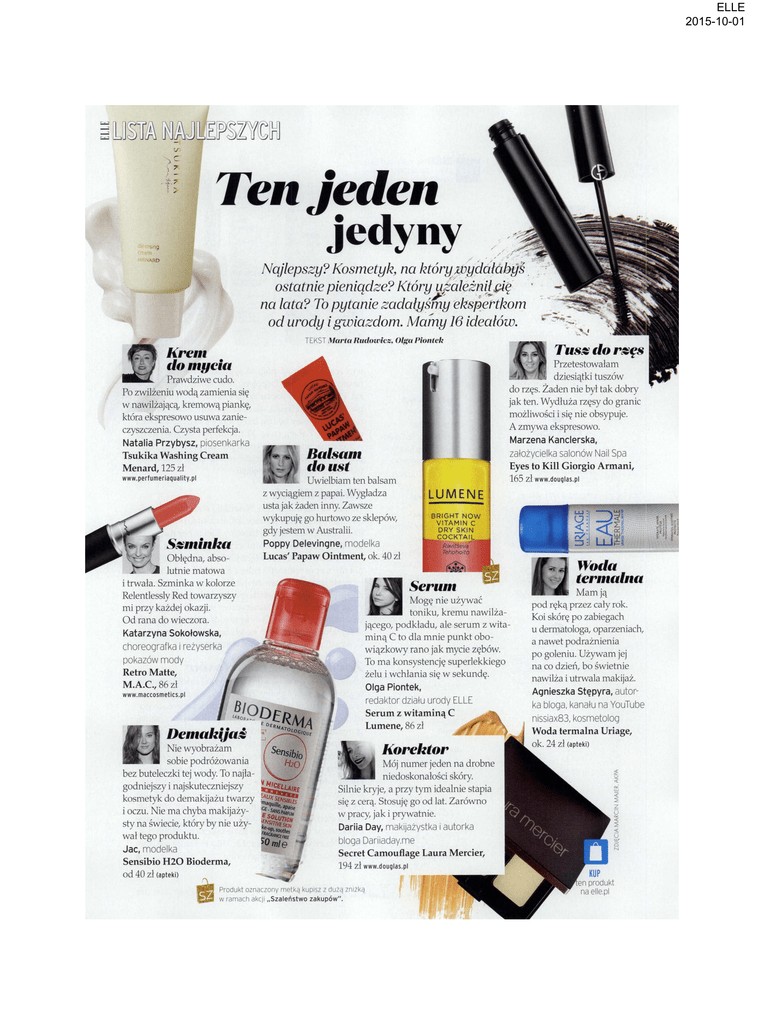 ELLE 2015-10-01 3USMM1FSZ1 V Ten jeden jedyny >-ng z Najlepszy? Kosmetyk, na który wydałabyś ostatnie pieniądze? Który uzależniłgię na lata? To pytanie zadałyśmy ekspertkom od urody i gwiazdom. Mamy 16 ideałów. TEKST Marta Krem do mycia Rudowics, Olga Piontek Tusz tlo rzęs Przetestowałam dziesiątki tuszów do rzęs. Żaden nie był tak dobry jak ten. Wydłuża rzęsy do granic możliwości i się nie obsypuje. A zmywa ekspresowo. Prawdziwe cudo. Po zwilżeniu wodą zamienia się w nawilżającą, kremową piankę, która ekspresowo usuwa zanie czyszczenia. Czysta perfekcja. Marzena Kanclerska, Natalia Przybysz, piosenkarka Balsam do ust Tsukika Washing Cream Menard, 125 zl www.perfumeriaquality.pl Szminka Obłędna, abso* lutnie matowa i trwała. Szminka w kolorze Relentlessly Red towarzyszy mi przy każdej okazji. Od rana do wieczora. założycielka salonów Nail Spa Eyes to Kill Giorgio Armani, 165 zł www.douglas.pl Uwielbiam ten balsam z wyciągiem z papai. Wygładza usta jak żaden inny. Zawsze wykupuję go hurtowo ze sklepów, gdy jestem w Australii. LUMENE — BRIGHT NOW VITAMIN C DRY SKIN COCKTAIL Poppy Delevinqne, modelka liii Si1 Woda termalna Serum Mogę nie używać toniku, kremu nawilża jącego, podkładu, ale serum z wita miną C to dla mnie punkt obo wiązkowy rano jak mycie zębów. To ma konsystencję superlekkiego żelu i wchłania się w sekundę. choreografka i reżyserka pokazów mody Retro Matte, M.A.C., 86 zł Olga Piontek, www.maccosmetics.pl Serum z witaminą C Lumene, 86 zł jś Nie wyobrażam sobie podróżowania bez buteleczki tej wody. To najła godniejszy i najskuteczniejszy kosmetyk do demakijażu twarzy i oczu. Nie ma chyba makijaży- ® sty na świecie, który by nie używał tego produktu. 5 °m/e Jac, modelka Sensibio H20 Bioderma, od 40 zł (apteki) Korektor Mam ją pod ręką przez cały rok. Koi skórę po zabiegach u dermatologa, oparzeniach, a nawet podrażnienia po goleniu. Używam jej na co dzień, bo świetnie nawilża i utrwala makijaż. Agnieszka Stępyra, autor redaktor działu urody ELLE Demakijaź ka błoga, kanału na YouTube x nissiax83, kosmetolog Woda termalna Uriage, ok. 24 zl (apteki) Mój numer jeden na drobne niedoskonałości skóry. Silnie kryje, a przy tym idealnie stapia się z cerą. Stosuję go od lat. Zarówno w pracy, jak i prywatnie. Dariia Day, makijażystka i autorka błoga Dariiaday.me Secret Camouflage Laura Mercier, 194 zl www.douglas.pl Produkt oznaczony metką kupisz z dużą zniżką w ramach akcji „Szaleństwo zakupów". ' Ravitseva Tehohoitó Lucas' Papaw Ointment, ok. 40 zł Katarzyna Sokołowska, UJ? :en produkt na elle.pl ELLE 2015-10-01 Pasta do zębów Smakuje kwitnącym w słońcu jaśminem owianym rześkim podmuchem mięty. Sprawia, że oddech jest świeży, a jednocześnie seksowny i zmysło wy: w sam raz do szeptania namiętnych słów. Kusi do wykradania pocałunków. Maska Najlepsza. Wręcz nie do zastąpienia. To głęboko oczyszczająca pasta, zawierająca kaolin, miód, miętę pieprzową, chlorofil i mieloną fasolkę adzuki. Pilinguje, rozjaśnia, dezynfekuje, odświeża. Skóra staje się idealnie gładka, napięta i nawilżona, jak po dobrym zabiegu u kosmetyczki. Agata Herbut, aktorka błoga Jasmine Mint Marvis, 25 zł www.galilu.pl olio lusso® lujcory fcx* od IHoz.(30al) Huiłe de kie pottt le mogę 11 Olejek Agatamanosa.blogspot.com Mask of Magnamity Lush, ok. 90 zł www.lush.com Siembab, blogerka i senselier RODI N Zawsze zabieram go w każdą podróż. To najbardziej uniwersalny kosmetyk. Regeneruje i dodaje blasku tak samo dobrze zarów no skórze, jak i włosom. Tusz flo rzęs Gdybym musiała wybrać jeden jedyny produkt, byłaby nim mascara. Ta z dwoma różnymi szczoteczkami momentalnie „dobudza" moje spojrzenie. V Zuzanna Bijoch, modelka Rodin Olio Lusso, ok. 550 zł Gwyneth Paltrow, aktorka www.oliolusso.com Excess Volume Impact Mascara Max Factor, 56 zł Szampon Jeden? Zbyt trudne zadanie. Ale mój najnowszy „naj" to balsam myjący do kręconych włosów. Nawilżający szampon, maska w jednym. Mogłabym nie stosować odżywki. Nie odmienił moje go życia, ale wygląd moich włosów zdecydowanie. Marta Rudowicz, szef działu urody ELLE Curl Conditioning Wash Living Proof, 98 zł www.hair2go.pl „ Serum Ten silny antyoksydant z wi taminą C, alfa-tokoferolem i kwasem ferulowym neutralizuje wol ne rodniki, chroni skórę przed fotostarzeniem i jednocześnie stymuluje syn tezę kolagenu. To moja ochrona przed miejskim życiem, które naraża skórę na stres oksydacyjny. Stosuję go rano z filtrem dla optymalnej ochrony ^-przed słońcem i upływającym czasem. tao-**40 tSSS* ^*(6 RADIA- Agnieszka Bliżanowska, dermatolog, założycielka WellDerm CE Ferulic Skinceuticals, 455 zł (gabinety) jUOAOSftC;1«UMSK30 DOIA .GABBANA Szmutka Kultowa szminka Roui Dior w kolorze 999 to i ,via, że czuję się ultrakć 2t gdy nie mam na twa więcej makijażu, rtman, aktorka :e Liostick, 155 zł Baza pod makijaż To najbardziej boski produkt, jakiego używałam. Robi wszystko ze skórą. Dodaje blasku, nawilża, wypełnia wszystkie zmarszczki, a przy tym działa jak dobry krem przeciwzmarszczkowy. Moja na zawsze. Linda Evangelista, modelka The Primer Dolce & Gabbana, ok. 320 zl www.dolcegabbana.com Produkt oznaczony metką kupisz z dużą zniżką w ramach akcji „Szaleństwo zakupów". z u