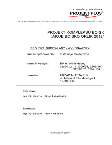 pracownia projektowa PROJEKT PLUS mgr inż. arch. Dariusz Jackowski 19-301 Ełk ul. Jana Pawła II 9/52 tel. 601-222-524 NIP: 848-108-03-52 REGON: 790188055 PROJEKT KOMPLEKSU BOISK „MOJE BOISKO ORLIK 2012” PROJEKT BUDOWLANY - WYKONAWCZY zakres opracowania: instalacje elektryczne adres inwestycji: Ełk ul. Kilińskiego, część dz. nr 3209/95, 3209/96, 3209/102, 3209/104 inwestor: URZĄD MIASTA EŁK ul. Marsz.J.Piłsudskiego 4 19-300 Ełk Opracował: mgr inż. elektryk Kinga Łukasiewicz Projektant: mgr inż. elektryk Piotr Filimoniuk Ełk kwiecień 2008r WSTĘP 1. Dokumentacja niniejsza została opracowana w zakresie budowlanym i zawiera : - część opisową : - wykonania instalacji elektrycznych wnętrzowych; - instalacji elektrycznych zasilania rozdzielnic; - instalacji piorunochronnej (odgromowej). - budowa linii kablowej nN oświetlenia zewnętrznego; - budowa, posadowienie słupów oświetlenia. - część rysunkową : - schematy wewnętrznych instalacji elektrycznych z podziałem na obwód oświetlenia, gniazd użytkowych nn; - schemat połączeń rozdzielnicy; - plan prowadzenia instalacji odgromowej; - schemat i plan prowadzenia instalacji oświetlenia zewnętrznego; 2. Dokumentacja zawiera wspólną część opisową oraz część rysunkową. 3. Dokumentację opracowano w oparciu o obowiązujące normy, zarządzenia, przepisy. 4. Bilans mocy, dobór zabezpieczenia głównego podano na schematach instalacji elektrycznych oraz w obliczeniach technicznych. 5. System ochrony od porażeń prądem elektrycznym dla projektowanego układu stanowić będzie szybkie wyłączenie w układzie TN-S. CZĘŚĆ OPISOWA 1. Zasilanie energią elektryczną. Zasilanie obiektu odbywać się będzie z układu pomiarowego który należy zainstalować w pomieszczeniu rozdzielni elektrycznej istniejącego budynku szkoły. Prowadzić wlz do rozdzielnicy RG kablem YKY 5 x 16mm2, w istniejącym budynku w listwach instalacyjnych KI60x40,1 na ścianach pod sufitem, na zewnątrz w wykopach. Długość wlz sprawdzić i ostatecznie ustalić po wykonaniu stanu surowego zamkniętego oraz wyznaczeniu trasy prowadzenia kabla w istniejącym budynku szkoły. Zastosować na RG rozdzielnicę o IP44 z drzwiczkami metalowymi wyposażonymi w zamek patentowy. Schemat oraz wartości i parametry linii zasilających przedstawiono na rysunkach. Wszystkie zastosowane rozdzielnice muszą posiadać atest badawczy. Dokumenty producentów należy dołączyć do dokumentacji powykonawczej. Podział przewodu PEN wykonać w złączu pomiarowym. W RG pod zacisk PE podłączyć przewody ochronne, uziemienie oraz wyprowadzenia metalowej konstrukcji ogrodzenia. 2. Układanie przewodów, osprzęt instalacyjny Rozprowadzenie przewodów instalacji elektrycznej pokazano na rysunkach rozdzielnic i rzutach. Instalację należy wykonać przewodami kabelkowymi YDYp lub YDY o ilości żył i przekrojach przedstawionych w opisach obwodów. Wszystkie obwody powinny być prowadzone z żyłą ochronną PE. 3. Obwód gniazd wtykowych Wszystkie instalacje obwodów gniazd jednofazowych wykonać przewodem YDYp3x2,5mm2. W pomieszczeniach narażonych na zawilgocenie (szatnia, wc itp.) instalować gniazda bryzgoszczelne na wysokości 1,2m od podłogi i w odległości min.0,6m od krawędzi urządzeń sanitarnych. 4. Łączniki instalacyjne Łączniki instalacyjne instalować na wysokości 1,4m od podłogi. W pomieszczeniach narażonych na zawilgocenie (szatni, wc itp.) zainstalować łączniki w obudowie bryzgoszczelnej. Wszystkie instalacje prowadzone podtynkowo do łączników, wykonać przewodem YDYp3x1,5mm2. 5. Obwód oświetlenia pomieszczeń (oświetlenia awaryjnego) Wszystkie obwody instalacji oświetlenia w budynku wykonać przewodem YDYp3x1,5mm2 lub YDY3x1,5mm2. W pomieszczeniach oprawy instalować na sufitach. Instalacje oświetlenia awaryjnego instalować zgonie z rysunkami. Na schematach zaznaczone zostały moduły podtrzymania świecenia awaryjnego literami „Aw”, oprawy te należy wyposażyć w system podtrzymania świecenia i podłączyć do instalacji oświetlenia awaryjnego. Oprawy z modułami awaryjnego świecenia powinny pracować w trybie użytkowo – awaryjnym. Cała instalacja świecenia awaryjnego powinna zadziałać w przypadku zaniku napięcia zasilającego np. - wyłączeniu wyłącznika głównego; - zaniku napięcia zasilającego. Instalacje oświetlenia awaryjnego należy sprawdzać każdorazowo przy przeglądach terminowych, alarmach próbnych i kontroli urządzeń przeciwpożarowych. Przy wykonaniu instalacji oświetlenia należy pamiętać o rozmieszczeniu i typach źródeł światła wyznaczonych w projekcie a opisanych w legendach na rysunkach. Wszystkie oprawy lamp fluorescencyjnych muszą być wyposażone w kondensatory kompensacyjne mocy biernej. Typy opraw oświetleniowych dobrane zostały przy pomocy komputerowych obliczeń natężenia oświetlenia na płaszczyznach roboczych. Zmiana typu oprawy może być dokonana tylko po wykonaniu nowych obliczeń natężeń oświetlenia na powierzchniach roboczych. 6. Oświetlenie zewnętrzne. Na terenach przewidziano zainstalowanie opraw oświetlenia zewnętrznego obiektów sportowych na słupach metalowych z wysięgnikami. Typ oprawy „Thorn Sonpak +” ze źródłem światła 250W. Zasilanie opraw obwodami z rozdzielnicy RG. W załączeniu do przedstawiono szczegółowe projekty oświetlenia boisk. Trasa prowadzenia linii kablowych nN została zaznaczona i opisana na rysunku. Obwody oświetlenia zaprojektowano kablem YKY 5x2,5 mm2. Przygotować zgodnie z rysunkiem trasę ułożenia linii kablowych. Przygotować wykopy o głębokości 0,7m. Przy układaniu kabla w ziemi należy wykonać z piasku podsypkę i nadsypkę grubości 0,1m następnie przysypać warstwą rodzimego gruntu 0,15m i ułożyć folię koloru niebieskiego o szerokości min. 0,2m i grubości 0,5mm. W wykopie prowadzić bednarkę ocynkowaną FeZn25x4 (drut FeZn śr.8mm) uziemiając słupy oświetleniowe. 
