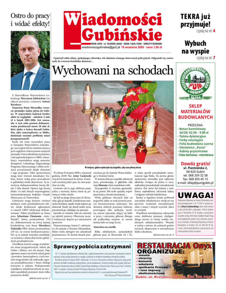 TEKRA już przyjmuje! Ostro do pracy i widać efekty! czytaj na str. 4 Wybuch na wyspie Upatrzyli sobie ofiarę, spokojnego człowieka, ich zdaniem winnego interwencji policyjnych. Odgrażali się, zastraszali, by wreszcie bestialsko skatować… czytaj na str. 7 Wychowani na schodach Z Marszałkiem Województwa Lubuskiego Marcinem Jabłońskim (na zdjęciu powyżej), rozmawia Antoni Barabasz: Szanowny Panie Marszałku, wreszcie pieniądze unijne płyną do Gubina. W poprzedniej kadencji bardzo słabo to wyglądało - zaledwie 2 mln zł w latach 2003-2006. Jest szansa, aby w tym roku poziom dofinansowania przekroczył nawet 30 mln zł. Ktoś chyba w końcu docenił Gubin. Pan, jako samorządowiec ze Słubic, doskonale rozumie problemy miast przygranicznych? Kiedy rok temu zaczynałem pracę w Zarządzie Województwa Lubuskiego, nasz region był na ostatnim miejscu pod względem wykorzystania unijnych pieniędzy. Ostro zabraliśmy się do pracy i tak naprawdę dopiero w 2009 r. mieszkańcy województwa mogą zauważyć dostępność Lubuskiego Regionalnego Programu Operacyjnego i efekty inwestycji poczynionych dzięki dotacjom z tego programu. Takie spostrzeżenia mogą mieć również mieszkańcy Gubina, którzy widzą prace prowadzone w gubińskiej strefie aktywności. Tę inwestycję dofinansowaliśmy kwotą blisko 3 mln złotych. Oprócz tego kwotą blisko 1,8 mln złotych wspomogliśmy termomodernizację budynku Urzędu Miasta przy ul. Piastowskiej. Gubinianie mogą dostrzec również działania wielu przedsiębiorców, którzy dzięki konkursom ogłaszanym w ramach LRPO zdobywają dofinansowanie. Takim przykładem są: firma pana Sebastiana Chomonta „AutoHandel”, której przekazaliśmy 350 tys. dofinansowania na nową myjnię bezdotykową oraz firma Mirosława Nadziejko PRO, której przekazaliśmy 230 tys. na wzrost konkurencyjności. Nie są to jednak wszystkie przykłady, co świadczy o dużej aktywności gubińskich przedsiębiorców. Chciałbym zwrócić uwagę, że położenie miast przygranicznych, takich jak Gubin i Słubice, jest ich atutem. Daje ogromne szanse na rozwój całych gmin i powiatów. Samorządowcy z tych terenów mogą działać jak ambasada, agencja przedsiębiorczości i biuro obsługi inwestora w jednym. Podejmowanie współpracy międzynarodowej na zasadach sąsiedzkich przynieść może tylko pozytywne skutki. dokończenie na str. 3 SKLEP MATERIAŁÓW BUDOWLANYCH PRZECENA: - Beton komórkowy 24/25/ 62.50 – 9.00 zł - Taśma dylatacyjna - Farby emulsyjne - Folia budowlana czarna - Ościeżnice „Porta” - Kabiny prysznicowe - Folia dachowa - membrana W miejscu, gdzie wydarzyła się tragedia, cały czas płoną znicze W sobotę 29 sierpnia 2009 r., tuż przed godziną 20.00 Pan Artur Cackowski wracał od znajomych do domu. Zamierzał wcześniej pójść spać, by rano pojechać na ryby. Łowienie ryb to jego ulubiona pasja, jedna z niewielu, której starał się poświęcać wolne chwile. Już był na progu domu przy ul. Roosevelta, gdy go dopadli. Zaatakowany znienacka brutalnie, upadł, wtedy dopiero go skatowali. Kiedy nie dawał znaku życia, pozostawili go, oddalając się spiesznie. Sąsiedzi to widzieli, nikt nie odważył się udzielić pomocy. Oburzenie zaczęli wykazywać dopiero po zatrzymaniu sprawców. Nieprzytomnego Artura C. odwieziono do szpitala w Krośnie Odrzańskim. Mimo wielu zabiegów nie odzyskiwał przytomności. Po dwóch dniach prze- wieziono go do Szpitala Wojewódzkiego w Zielonej Górze. W ósmym dniu po wypadku zakończył życie, pozostawiając w głębokim żalu żonę Marzenę i dwie nastoletnie córki. Na pogrzebie, 11 września, zgromadziło się prawie 300 osób: sąsiedzi, współpracownicy, również nieznajomi… Wielu gubinian obecnych było na pogrzebie jakby na znak protestu przeciw bezsensownemu umieraniu. Ten skromny elektryk przyjazny ludziom, postrzegany jako spokojny, życzliwy, zawsze uprzejmy, dający się lubić w pracy i otoczeniu, głównie dlatego, jak podkreślają znajomi, że zawsze można było na niego liczyć. w różny sposób przeszkadzało mieszkańcom tego bloku. Na pewno głośne zachowania, nierzadko pod wpływem alkoholu, trwające do późna w nocy, najbardziej przeszkadzały mieszkańcom parteru. Pan Artur był jednym z tych, którzy najdotkliwiej odczuwali hałasy i wulgarne wybryki młodzieńcze. Kiedyś w łagodnej formie próbował zawstydzić młodzieńców, wtedy po raz pierwszy wysłuchał niezasłużonych zdań o matce i innych wyzwisk. Jakoś to ścierpiał. Wspólnota mieszkaniowa odczuwała coraz dotkliwiej przejawy chuligańskiego terroru ze strony watahy niesfornych młodzieniaszków. Wrzaski w jednej z piwnic do późnych godzin Atmosfera na osiedlu nocnych, okupowanie w rozwydrzeniu Kilku młodzieńców, zamieszkałych klatki schodowej. głównie przy ul. Roosevelta 3A i 3C, dokończenie na str. 6 Sprawcy pobicia zatrzymani 10 i 11 września Sąd Rejonowy w Krośnie Odrz. wydał postanowienie o tymczasowym aresztowaniu czterech mężczyzn, którzy zostali zatrzymani w związku z pobiciem ze skutkiem śmiertelnym mieszkańca Gubina. Do pobicia doszło 29 sierpnia 2009 r. około godz. 19.25 na os. Roosevelta w Gubinie. Mężczyzna, stojąc przed wejściem do klatki schodowej swojego bloku, został zaatakowany i brutalnie pobity przez grupkę mężczyzn. Z licznymi obrażeniami głowy trafił do Szpitala Wojewódzkiego w Zielonej Górze. Mężczyzna zmarł 7 września 2009 r. w szpitalu. Sprawę prowadzi Prokuratura Rejonowa w Krośnie Odrz. Mężczyznom grozi kara pozbawienia wolności od roku do lat 15, o czym poinformowała Prokurator PR. Oficer Prasowy KPP Krosno Odrzańskie Dowóz gratis! ul. Piastowska 2, 66-620 Gubin tel. 068 359 32 58 fax. 068 455 45 15 e-mail: [email protected] UWAGA! Prokuratura Rejonowa w Krośnie Odrzańskim nadzoruje postępowanie 3 Ds 157/09 w sprawie pobicia Artura Cackowskiego, które miało miejsce w dniu 29.08.2009 r. około godz. 19.00