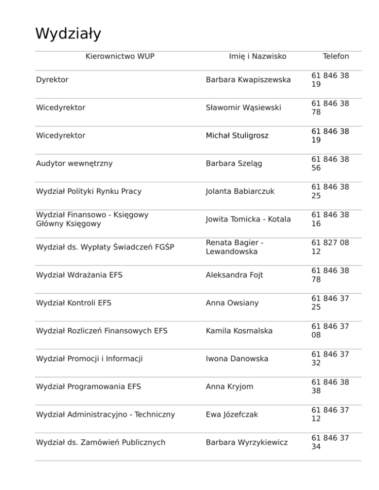Wydziały Kierownictwo WUP Imię i Nazwisko Telefon Dyrektor Barbara Kwapiszewska 61 846 38 19 Wicedyrektor Sławomir Wąsiewski 61 846 38 78 Wicedyrektor Michał Stuligrosz 61 846 38 19 Audytor wewnętrzny Barbara Szeląg 61 846 38 56 Wydział Polityki Rynku Pracy Jolanta Babiarczuk 61 846 38 25 Wydział Finansowo - Księgowy Główny Księgowy Jowita Tomicka - Kotala 61 846 38 16 Wydział ds. Wypłaty Świadczeń FGŚP Renata Bagier Lewandowska 61 827 08 12 Wydział Wdrażania EFS Aleksandra Fojt 61 846 38 78 Wydział Kontroli EFS Anna Owsiany 61 846 37 25 Wydział Rozliczeń Finansowych EFS Kamila Kosmalska 61 846 37 08 Wydział Promocji i Informacji Iwona Danowska 61 846 37 32 Wydział Programowania EFS Anna Kryjom 61 846 38 38 Wydział Administracyjno - Techniczny Ewa Józefczak 61 846 37 12 Wydział ds. Zamówień Publicznych Barbara Wyrzykiewicz 61 846 37 34 Wydział Organizacyjny Robert Pakulski 61 846 37 13 Wydział ds. Pośrednictwa Pracy Amadeusz Konieczny 61 846 38 07 Wydział Badań i Analiz Rynku Pracy Anna Górna Kubacka 61 846 38 26 Centrum Informacji i Planowania Kariery Zawodowej Olga Kaczmarek 61 846 38 53 Wydział Kadr Barbara Ast 61 846 37 11 Wydział Informatyki Monika Maćkowiak 61 846 38 12 Główny specjalista ds. komunikacji medialnej Bernadeta Ignasiak 61 846 38 34 Wydział Ewaluacji i Monitoringu EFS Justyna Pyzdrowska 61 846 37 31 Wydział ds. Dochodzenia Zwrotu Należności Agnieszka Rozmiarek FGŚP 61 827 08 11 Wydział ds. Działań Aktywizacyjnych 61 846 38 27 Elżbieta Soroka - Ratajczak