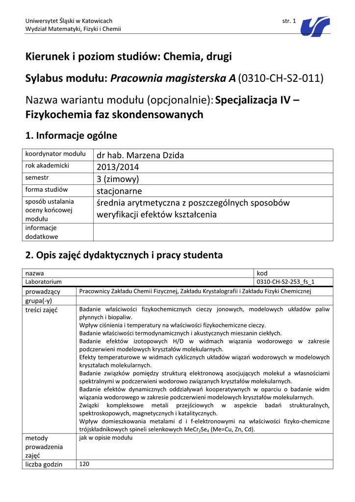 Uniwersytet Śląski w Katowicach Wydział Matematyki, Fizyki i Chemii str. 1 Kierunek i poziom studiów: Chemia, drugi Sylabus modułu: Pracownia magisterska A (0310-CH-S2-011) Nazwa wariantu modułu (opcjonalnie): Specjalizacja IV – Fizykochemia faz skondensowanych 1. Informacje ogólne koordynator modułu rok akademicki semestr forma studiów sposób ustalania oceny końcowej modułu informacje dodatkowe dr hab. Marzena Dzida 2013/2014 3 (zimowy) stacjonarne średnia arytmetyczna z poszczególnych sposobów weryfikacji efektów kształcenia 2. Opis zajęć dydaktycznych i pracy studenta nazwa Laboratorium prowadzący grupa(-y) treści zajęć metody prowadzenia zajęć liczba godzin kod 0310-CH-S2-253_fs_1 Pracownicy Zakładu Chemii Fizycznej, Zakładu Krystalografii i Zakładu Fizyki Chemicznej Badanie właściwości fizykochemicznych cieczy jonowych, modelowych układów paliw płynnych i biopaliw. Wpływ ciśnienia i temperatury na właściwości fizykochemiczne cieczy. Badanie właściwości termodynamicznych i akustycznych mieszanin ciekłych. Badanie efektów izotopowych H/D w widmach wiązania wodorowego w zakresie podczerwieni modelowych kryształów molekularnych. Efekty temperaturowe w widmach cyklicznych układów wiązań wodorowych w modelowych kryształach molekularnych. Badanie związków pomiędzy strukturą elektronową asocjujących molekuł a własnościami spektralnymi w podczerwieni wodorowo związanych kryształów molekularnych. Badanie efektów dynamicznych oddziaływań kooperatywnych w oparciu o badanie widm wiązania wodorowego w zakresie podczerwieni modelowych kryształów molekularnych. Związki kompleksowe metali przejściowych w aspekcie badań strukturalnych, spektroskopowych, magnetycznych i katalitycznych. Wpływ domieszkowania metalami d i f-elektronowymi na właściwości fizyko-chemiczne trójskładnikowych spineli selenkowych MeCr2Se4 (Me=Cu, Zn, Cd). jak w opisie modułu 120 Uniwersytet Śląski w Katowicach Wydział Matematyki, Fizyki i Chemii dydaktycznych (kontaktowych) liczba godzin pracy własnej studenta opis pracy własnej studenta organizacja zajęć literatura obowiązkowa literatura uzupełniająca str. 2 210 Przygotowanie do prac laboratoryjnych. Samodzielna praca z literaturą. Opracowywanie, analiza i interpretacja uzyskanych wyników pomiarów. 4 godziny (45 minut) dwa razy w tygodniu w ciągu semestru 1. H. Buchowski, W. Ufnalski, Roztwory, WNT, Warszawa, 1995. 2. J. B. Czermiński, A. Iwasiewicz, Z. Paszek, A. Sikorski, Metody statystyczne dla chemików, PWN, Warszawa, 1992. 3. Z. Kęcki, Podstawy spektroskopii molekularnej, PWN, Warszawa, 1992. 4. J. Sadlej, Spektroskopia molekularna, WNT, Warszawa, 2002. 5. G. A. Jeffrey – An introduction to hydrogen bonding, Oxford University Press, New York,1997. 6. G. R. Desiraju; T. Steiner – The Weak Hydrogen Bond in structural chemistry and biology, Oxford University Press Inc., New York, 1999. 7. M. Van Meerssche, J. Feneau-Dupont, Krystalografia i chemia strukturalna, PWN, Warszawa, 1984. 8. M. Cieślak-Golonka, J. Starosta, M. Wasielewski, Wstęp do chemii koordynacyjnej, PWN, Warszawa, 2010. 9. S. F. A. Ketlle, Fizyczna chemia nieorganiczna, PWN, Warszawa, 1999. 10. A. B. P. Lever, Inorganic Electronic Spectroscopy, Elsevier Science; 2 Sub edition (January 1, 1985). 11. J. Dereń, J. Haber, R. Pampuch, Chemia ciała stałego, PWN, Warszawa, 1975. 12. A. Szewczyk, A. Wiśniewski, R. Puźniak, H. Szymczak, Magnetyzm i nadprzewodnictwo, PWN, Warszawa, 2012. 13. A. P. Cracknell, Magnetyzm kryształów, PWN, Warszawa, 1982. 14. A. Oleś, Metody doświadczalne fizyki ciała stałego, WNT, Warszawa, 1998. Platforma zdalnego nauczania: http://el.us.edu.pl/upgow/course/category.php?id=9 Bazy danych dostępne w Bibliotece Uniwersytetu Śląskiego. Artykuły specjalistyczne dotyczące omawianych zagadnień. adres strony www zajęć informacje dodatkowe nazwa Konsultacje prowadzący grupa(-y) treści zajęć metody prowadzenia zajęć kod 0310-CH-S2-253_fs_2 Pracownicy Zakładu Chemii Fizycznej, Zakładu Krystalografii i Zakładu Fizyki Chemicznej Konsultacje bezpośrednie mające na celu pomoc w rozwiązywaniu bieżących trudności wynikających z realizacji treści programowych modułu. Jak w opisie modułu Uniwersytet Śląski w Katowicach Wydział Matematyki, Fizyki i Chemii liczba godzin dydaktycznych (kontaktowych) liczba godzin pracy własnej studenta opis pracy własnej studenta organizacja zajęć literatura obowiązkowa literatura uzupełniająca adres strony www zajęć informacje dodatkowe str. 3 75 0 - Indywidualne konsultacje Taka jak dla Laboratorium Taka jak dla Laboratorium 3. Opis sposobów weryfikacji efektów kształcenia modułu nazwa kod Ocenianie ciągłe 0310-CH-S2-253_w_1 kod(-y) zajęć osoba(-y) przeprowadzająca(e) weryfikację grupa(-y) wymagania merytoryczne 0310-CH-S2-253_fs_1 Pracownicy Zakładu Chemii Fizycznej, Zakładu Krystalografii i Zakładu Fizyki Chemicznej kryteria oceny Ocena bardzo dobra - student samodzielnie planuje i wykonuje eksperyment konsultując się z prowadzącym tylko w momentach istotnych dla poprawnego przebiegu ćwiczenia. Zna i rozumie realizowane zagadnienie, działanie aparatury, metodykę pomiaru. Prawidłowo planuje i wykonuje eksperyment, na bieżąco ocenia zgodność otrzymanych wyników z intuicją; Ocena dobra - student planuje i wykonuje eksperyment konsultując się z prowadzącym w miarę potrzeby. Zna i rozumie realizowane zagadnienie, działanie aparatury, metodykę pomiaru. Na ogół prawidłowo planuje i wykonuje eksperyment, na bieżąco ocenia zgodność otrzymanych wyników z intuicją po konsultacji z prowadzącym; Ocena dostateczna - student wykonuje eksperyment po konsultacjach z prowadzącym. Rozumie realizowane zagadnienie, działanie aparatury, metodykę pomiaru. Na ogół prawidłowo planuje i wykonuje eksperyment, na bieżąco ocenia zgodność otrzymanych wyników z intuicją po konsultacji z prowadzącym