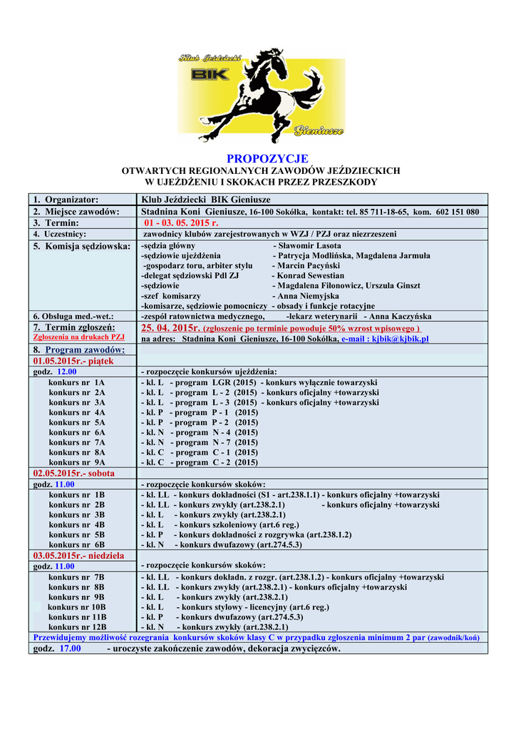PROPOZYCJE OTWARTYCH REGIONALNYCH ZAWODÓW JEŹDZIECKICH W UJEŻDŻENIU I SKOKACH PRZEZ PRZESZKODY 1. Organizator: 2. Miejsce zawodów: 3. Termin: Klub Jeździecki BIK Gieniusze Stadnina Koni Gieniusze, 16-100 Sokółka, kontakt: tel. 85 711-18-65, kom. 602 151 080 01 - 03. 05. 2015 r. 4. Uczestnicy: zawodnicy klubów zarejestrowanych w WZJ / PZJ oraz niezrzeszeni -sędzia główny - Sławomir Lasota -sędziowie ujeżdżenia - Patrycja Modlińska, Magdalena Jarmuła -gospodarz toru, arbiter stylu - Marcin Pacyński -delegat sędziowski Pdl ZJ - Konrad Sewestian -sędziowie - Magdalena Fiłonowicz, Urszula Ginszt -szef komisarzy - Anna Niemyjska -komisarze, sędziowie pomocniczy - obsady i funkcje rotacyjne -zespół ratownictwa medycznego, -lekarz weterynarii - Anna Kaczyńska 25. 04. 2015r. (zgłoszenie po terminie powoduje 50% wzrost wpisowego ) na adres: Stadnina Koni Gieniusze, 16-100 Sokółka, e-mail : [email protected] 5. Komisja sędziowska: 6. Obsługa med.-wet.: 7. Termin zgłoszeń: Zgłoszenia na drukach PZJ 8. Program zawodów: 01.05.2015r.- piątek godz. 12.00 konkurs nr konkurs nr konkurs nr konkurs nr konkurs nr konkurs nr konkurs nr konkurs nr konkurs nr - rozpoczęcie konkursów ujeżdżenia: - kl. L - program LGR (2015) - konkurs wyłącznie towarzyski - kl. L - program L - 2 (2015) - konkurs oficjalny +towarzyski - kl. L - program L - 3 (2015) - konkurs oficjalny +towarzyski - kl. P - program P - 1 (2015) - kl. P - program P - 2 (2015) - kl. N - program N - 4 (2015) - kl. N - program N - 7 (2015) - kl. C - program C - 1 (2015) - kl. C - program C - 2 (2015) 1A 2A 3A 4A 5A 6A 7A 8A 9A 02.05.2015r.- sobota godz. 11.00 konkurs nr konkurs nr konkurs nr konkurs nr konkurs nr konkurs nr - rozpoczęcie konkursów skoków: - kl. LL - konkurs dokładności (S1 - art.238.1.1) - konkurs oficjalny +towarzyski - kl. LL - konkurs zwykły (art.238.2.1) - konkurs oficjalny +towarzyski - kl. L - konkurs zwykły (art.238.2.1) - kl. L - konkurs szkoleniowy (art.6 reg.) - kl. P - konkurs dokładności z rozgrywka (art.238.1.2) - kl. N - konkurs dwufazowy (art.274.5.3) 1B 2B 3B 4B 5B 6B 03.05.2015r.- niedziela - rozpoczęcie konkursów skoków: godz. 11.00 konkurs nr 7B - kl. LL - konkurs dokładn. z rozgr. (art.238.1.2) - konkurs oficjalny +towarzyski konkurs nr 8B - kl. LL - konkurs zwykły (art.238.2.1) - konkurs oficjalny +towarzyski konkurs nr 9B - kl. L - konkurs zwykły (art.238.2.1) konkurs nr 10B - kl. L - konkurs stylowy - licencyjny (art.6 reg.) konkurs nr 11B - kl. P - konkurs dwufazowy (art.274.5.3) konkurs nr 12B - kl. N - konkurs zwykły (art.238.2.1) Przewidujemy możliwość rozegrania konkursów skoków klasy C w przypadku zgłoszenia minimum 2 par (zawodnik/koń) godz. 17.00 - uroczyste zakończenie zawodów, dekoracja zwycięzców. W konkursach ujeżdżenia prowadzona będzie oddzielna klasyfikacja kucy oraz dużych koni. W konkursach skoków klasy LL mogą również startować kuce (przeszkody będą obniżone). W konkursie ujeżdżenia nr. 1A jako towarzyskim mogą startować tylko zawodnicy bez licencji/klasy sportowej. Równolegle do konkursów nr. 2A, 3A, 1B, 2B, 7B, 8B rozegrane zostaną również konkursy towarzyskie, w których mogą startować tylko zawodnicy nie posiadający licencji/klasy sportowej. Wyniki wszystkich konkursów ujeżdżenia i skoków zaliczone będą do Rankingu Jeździeckiej Ligi Podlasia 2015. 9. Nagrody : puchary i nagrody zwycięzcom konkursów, medale, plakietki, flot’s, upominki. - parkur - podłoże piaszczyste (70x70), - czworobok - podłoże piaszczyste (20x60) Rozprężalnia - podłoże trawiaste Parkur wyposażony w kłódki atestowane. 10. Plac konkursowy 11. Sprawy organizacyjne: wysokość wpisowego - 50 zł od konia za każdy dzień zawodów opłata za boks - 120 zł za całe zawody (40 zł/dzień) wysokość startowego: - konkursy ujeżdżenia: w kl. L - 15zł, w kl. P - 20zł, w kl. N - 25 zł, w kl. C - 30zł - konkursy skoków: w kl. LL - 10zł, w kl. L - 15zł, w kl. P - 20zł, w kl. N - 25zł, w kl. C - 30zł ( startowe w całości przeznaczone na nagrody ) Opłaty należy uiszczać bezpośrednio po przybyciu na zawody Zgłoszenie na zawody jest równoznaczne z przyjęciem obowiązku wniesienia w/w opłat. Z obowiązku tego zwalnia tylko ważna przyczyna losowa uniemożliwiająca przybycie na zawody zgłoszonych koni i zawodników. Wszelkie zmiany w zgłoszeniach po wyznaczonym terminie powodujące konieczność poprawek na listach startowych mogą być dokonane po uzgodnieniu z organizatorem oraz sędzią głównym zawodów i wniesieniu dodatkowej opłaty w wysokości 20 zł za każdą zmianę. 12. Dokumenty, sprawy różne: - Zawodników i konie obowiązuje dokumentacja wg regulaminów i przepisów PZJ. W przypadku braku dokumentów zawodnika lub konia para nie będzie dopuszczona do startu w zawodach. - Wymagane są aktualne dokumenty identyfikacyjne oraz ważne szczepienia przeciw grypie koni. Konie nie posiadające ważnych szczepień nie zostaną wpuszczone na teren zawodów. - Organizator nie ponosi odpowiedzialności za kradzieże, wypadki i inne szkody mogące powstać w czasie trwania zawodów oraz transportu przed i po zawodach. - Zawody odbywają się zgodnie z przepisami i regulaminami PZJ oraz regulaminem Jeździeckiej Ligi Podlasia 2015. - Zawodnicy startujący w konkursach towarzyskich (1A, 2A, 3A, 1B, 2B, 7B, 8B) muszą posiadać aktualne badania lekarskie oraz ubezpieczenie NNW, a zawodnicy niepełnoletni – pisemną zgodę rodziców lub opiekunów prawnych na start w zawodach. Propozycje zgodne z kalendarzem imprez i zawodów Pdl ZJ. ZAPRASZAMY NA ZAWODY… ORGANIZATOR KLUB JEŹDZIECKI BIK GIENIUSZE Propozycje zatwierdzone przez Kolegium Sędziów Pdl ZJ