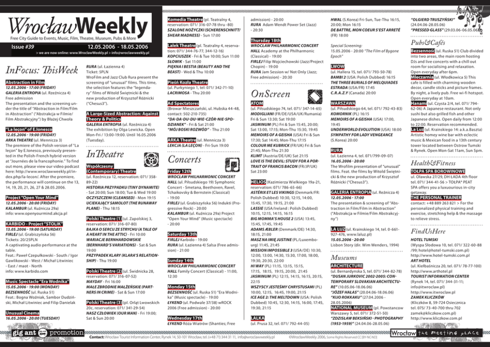 WrocławWeekly Free City Guide to Events, Music, Film, Theatre, Museum, Pubs & More Issue #39 12.05.2006 - 18.05.2006 > we are now online: www.WroclawWeekly.pl > [email protected] InFocus: ThisWeek Abstraction in Film 12.05.2006 - 17:00 (Friday) Galeria ENTROPIA (ul. Rzeźnicza 4) Free admission The presentation and the screening under the title of “Abstraction in Film/Film in Abstraction” (“Abstrakcja w Filmie/ Film Abstrakcyjny“) by Błażej Chwoła “La leçon” of E.Ionesco 12.05.2006 - 19:00 (Friday) ARKA Theatre (ul. Mennicza 3) The premiere of the Polish version of “La leçon” by E.Ionesco, previously presented in the Polish-French hybrid version at “Journées de la francophonie.” To find out more, please view our video podcast here: http://www.wroclawweekly.pl/index.php/la-lecon/. After the premiere, the performance will continue on the 13, 14, 19, 20, 21, 26, 27 & 28.05.2006. Project “Open Your Mind” 12.05.2006 - 20:00 (Friday) KALAMBUR (ul. Kuźnicza 29a) info: www.openyourmind.akcja.pl KARBIDO - Project “STOLIK” 13.05.2006 - 19:00 (Saturday) FIRLEJ (ul. Grabiszyńska 56) Tickets: 20/25PLN A captivating audio performance at the table. Feat.: Paweł Czepułkowski - South / Igor Gawlikowski - West / Michał Litwiniec - East / maot - North info: www.karbido.com Music Spectacle “Era Wodnika” 15.05.2006 - 19:00 (Monday) BEZSENNOŚĆ (ul. Ruska 51) Feat.: Bogna Woźniak, Sambor Dudziński, Michał Litwiniec and Filip Danielak Unusual Cinema 16.05.2006 - 20:00 (Tuesday) RURA (ul. Łazienna 4) Ticket: 5PLN WroFilm and Jazz Club Rura present the screening of “unusual” films. This time, the selection features the “legendary” films of Witold Świętnicki & the new production of Krzysztof Różnicki (“Chesus3”). A Large-Sized Abstraction: Against Theory & Politics Galeria ENTROPIA (ul. Rzeźnicza 4) The exhibition by Olga Lewicka. Open Mon-Fri / 13:00-19:00. Until 16.05.2006 (Tuesday). InTheatre Współczesny (Contemporary) Theatre (ul. Rzeźnicza 12, reservation: 071/ 35889-22) Historia przypadku (Tiny Dynamite) - Sat 20:00; Sun 18:00; Tue & Wed 19:00 Oczyszczeni (Cleansed) - Mon 19:15 Uciekający samolot (The Runaway Plane) - Thu 18:15 Polski Theatre (1) (ul. Zapolskiej 3, reservation: 071/ 316-07-80) Bajka o sercu ze strychu (a Tale of a Heart in The attic) - Fri 10:00 Wariacje bernhardowskie (Bernhard’s Variations) - Sat & Sun 19:00 Przypadek Klary (Klara’s Relationship) - Thu 19:00 Polski Theatre (2) (ul. Świdnicka 28, reservation: 071/ 316-07-52) Mayday - Fri 16:00 Małe zbrodnie małżeńskie (Partners in Crime) - Sat & Sun 17:00 Polski Theatre (3) (pl. Orląt Lwowskich 20c, reservation: 071/ 341-29-54) Nasz człowiek (Our Man) - Fri 19:00; Sat & Sun 20:00 Komedia Theatre (pl. Teatralny 4, reservation: 071/ 316-07-78 thru -80) Szalone Nożyczki (Scherenschnitt/ Shear Madness) - Sun 17:00 Lalek Theatre (pl. Teatralny 4, reservation: 071/ 344-76-77, 344-12-16) Kopciuszek - Fri & Tue 10:00; Sun 11:00 Słowik - Sat 11:00 Piękna i Bestia (Beauty and the Beast) - Wed & Thu 10:00 Pieśń Kozła Theatre (ul. Purkyniego 1, tel: 071/ 342-71-10) Lacrimosa - Thu 20:00 Ad Spectatores (Browar Mieszczański, ul. Hubska 44-48, contact: 502-210-735) “Da-da-du-du-wie-czór-nie-spodzianek” - Fri & Sat 21:00 “Mój boski rozwód” - Thu 21:00 ARKA Theatre (ul. Mennicza 3) Lekcja (La leçon) - Fri-Sun 19:00 Concerts Friday 12th WROCŁAW PHILHARMONIC CONCERT HALL (ul. Piłsudskiego 19) Symphonic Concert - Smetana, Beethoven, Ravel, Tchaikovsky & Bernstein (Classical) - 19:00 FIRLEJ (ul. Grabiszyńska 56) Indukti (Progressive Rock) - 20:00 KALAMBUR (ul. Kuźnicza 29a) Project “Open Your Mind” (Music spectacle) - 20:00 admission) - 20:00 RURA Adam Wendt Power Set (Jazz) - 20:30 Thursday 18th WROCŁAW PHILHARMONIC CONCERT HALL Academy at the Philharmonic (Classical) - 19:00 FIRLEJ Filip Wojciechowski (Jazz/Project Chopin) - 19:00 RURA Jam Session w/ Not Only (Jazz; Free admission) - 20:30 OnScreen (ul. Piłsudskiego 64, tel. 071/ 792-43-83) Komornik (PL) 16:15 Memoirs of a Geisha (USA) 17:00, 19:45 Underworld Evolution (USA) 18:00 Sympathy for Lady Vengeance (S.Korea) 20:00 HELIOS (Kazimierza Wielkiego 19a-21, LALKA ŁYKEND Róża Wiatrów (Shanties; Free (ul. Prusa 32, tel. 071/ 792-44-05) WROCŁAW PHILHARMONIC CONCERT HALL Family Concert (Classical) - 11:00, 12:30 Monday 15th (ul. Hallera 15, tel. 071/ 793-50-78) Bambi 2 (USA: Polish Dubbed) 16:15 The Three Burials of Melquiades Estrada (USA/FR) 17:45 C.R.A.Z.Y (Canada) 20:00 WARSZAWA Wednesday 17th Sunday 14th LWOW (ul. Piłsudskiego 74, tel. 071/ 347-14-65) Modigliani (FR/DE/USA/UK/Rumania) Fri & Sun 13:30; Sat 19:00 Jasminum (PL) Fri & Sun 15:45, 20:00; Sat 13:00, 17:15; Mon-Thu 15:30, 19:45 Memoirs of a Geisha (USA) Fri & Sun 17:30; Sat 14:45; Mon-Thu 17:15 Colour Me Kubrick (FR/UK) Fri & Sun 21:45; Mon-Thu 21:30 Klimt (Austria/DE/UK) Sat 21:15 Love Is the Devil: Study for a Portrait of Francis Bacon (FR/JP/UK) Sat 23:00 BEZSENNOŚĆ (ul. Ruska 51) “Era Wodnika” (Music spectacle) - 19:00 ŁYKEND (ul. Podwale 37/38) wROCK 2006 (Free admission) - 20:00 FIRLEJ Karbido - 19:00 RURA (ul. Łazienna 4) Salsa (Free admission) - 21:00 Special Screening: 15.05.2006 - 20:00 “The Film of Bygone Epoch” ATOM reservation: 071/ 786-65-66) Astérix et les Vikings (Denmark/FR: Polish Dubbed) 10:30, 12:15, 14:00, 15:45, 17:30, 19:15, 21:00 Lassie (USA/Ireland : Polish Dubbed) 10:15, 12:15, 14:15, 16:15 Big Momma’s House 2 (USA) 13:45, 15:45, 17:45, 19:45 Adams æbler (Denmark/DE) 14:30, 18:15, 21:00 Masz na imię Justine (PL/Luxembourg) 11:45, 21:45 Mission Impossible 3 (USA/DE) 10:30, 12:00, 13:00, 14:30, 15:30, 17:00, 18:00, 19:30, 20:30, 22:00 Hi Way (PL) 11:15, 13:15, 15:15, 17:15, 18:15, 19:15, 20:00, 21:45 Jasminum (PL) 12:15, 14:15, 16:15, 20:15, 22:15 Wszyscy jesteśmy Chrystusami (PL) 10:00, 12:15, 16:45, 19:00, 21:15 Ice Age 2: The Meltdown (USA: Polish Dubbed) 10:45, 12:30, 14:15, 16:00, 17:4