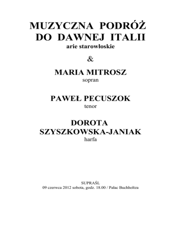 MUZYCZNA PODRÓŻ DO DAWNEJ ITALII arie starowłoskie & MARIA MITROSZ sopran PAWEŁ PECUSZOK tenor DOROTA SZYSZKOWSKA-JANIAK harfa SUPRAŚL 09 czerwca 2012 sobota, godz. 18.00 / Pałac Buchholtza MARIA MITROSZ - sopran Urodziła się w Białymstoku. W 1995 r. ukończyła z wyróżnieniem Wydział Wokalny Akademii Muzycznej im. Fryderyka Chopina w Warszawie w klasie Prof. Janiny Skalik. Uczestniczyła w kursach mistrzowskich Teresy Żylis-Gary, Ryszarda Karczykowskiego i Carla Bergonzi. Była stypendystką Ministerstwa Kultury i Sztuki i Prezydenta Miasta Stołecznego Warszawy. Obecnie pozostaje pod opieką wokalną Mariny Hristovej. W czasie studiów współpracowała z klasą kameralistyki Prof. Krystyny Borucińskiej i Mai Nosowskiej. Uczestniczyła w licznych koncertach w Polsce oraz za granicą - w Rosji, Niemczech, we Włoszech, na Litwie, w Kuwejcie, w Izraelu i w Bośni-Hercegowinie. Brała udział m.in. w przedstawieniu Claudio Monteverdiego "Koronacja Poppei" na Scenie Kameralnej Teatru Wielkiego w Warszawie (spektakl studencki), operze "Chopin" Giacomo Orefice w Teatrze Wielkim w Warszawie. W sezonie 96/97 występowała jako solistka w Teatrze muzycznym "Roma". Współpracowała z Estradą Kameralną Filharmonii Narodowej, Chórem Akademii Teologii Katolickiej i Orkiestrą Koncertową Wojska Polskiego im. Stanisława Moniuszki, z którą nagrała płytę kompaktową; z Operą na Zamku w Szczecinie (Nedda w Pajacach) i z Operą Krakowską (plenerowe wystawienie Halki),z Teatrem Narodowym im. W. Bogusławskiego w Warszawie, biorąc udział w spektaklach: "Saragossa" (reż.T.Bradecki), "Halka Spinoza" i "Nowe Bloomusalem" (reż. J.Grzegorzewski).Nagrywała dla Polskiego Radia i Telewizji. Od 2000r jest solistką Teatru Wielkiego im. St. Moniuszki w Poznaniu. DOROTA SZYSZKOWSKA-JANIAK harfistka Absolwentka Akademii Muzycznej im. Fryderyka Chopina w Warszawie.Z wyróżnieniem ukończyła naukę w klasie prof. Urszuli Mazurek, a następnie studia podyplomowe w klasie prof. Helgi Storck, w Akademii Muzycznej im. K. Szymanowskiego w Katowicach. Jest laureatką m. in. Specjalnego Wyróżnienia Konkursu „Muzyczne interpretacje Chopina”, a także Nagrody Specjalnej za muzykę do spektaklu teatralnego w ramach Festiwalu Teatralnego w Łodzi. Jako harfistka orkiestry Teatru Wielkiego w Łodzi oraz Ladies First Symphony Orchestra, wzięła udział w licznych tournees w całej Europie. Współpracuje z wieloma filharmoniami w całej Polsce. Akompaniowała m. in. Placido Domingo, Jose Carrerasowi, Andrea Bocellemu. Współpracowała z takimi zespołami jak Blue Cafe, Varius Manx a także z Jerzym Zelnikiem. Wraz z kwartetem im. A. Rubinsteina nagrała płytę „Cztery Pory Roku” Antonio Vivaldiego w autorskim opracowniu. Wzięła udział w projekcie grupy „YES”, w koncercie Amsterdamie, zarejestrowanym na DVD. Obecnie zajmuje się m. in. działalnością solową, kameralną i pedagogiczną. PAWEŁ PECUSZOK – tenor Ukończył Uniwersytet Muzyczny Fryderyka Chopina z wyróżnieniem (2010) w klasie śpiewu solowego Prof. Urszuli Trawińskiej –Moroz. Jest również lekarzem – absolwent Wydziału Lekarskiego Uniwersytetu Medycznego w Białymstoku (2004). Jest specjalistą Medycyny Rodzinnej, aktualnie jest w trakcie specjalizacji z Geriatrii. W wykonawstwie operowym zadebiutował jako student IV roku w podwójnej roli partią Franka oraz Feliksa w przedstawieniach operowych Stanisława Moniuszki „Flis” w Teatrze Dramatycznym w Białymstoku (reż. Natalia Babińska). Uczestniczy w licznych koncertach i przedsięwzięciach artystycznych w województwie podlaskim i w Polsce: m.in. Moniuszkowski Festiwal Podlasia (premiera ballady S. Moniuszki „Pani Twardowska”partia-Mefistofelesa), koncerty z cyklu „Muzyka w moim mieście”, koncerty w ramach Podlaskiego Festiwalu Nauki i Sztuki, Białowieskie Spotkania z Arią, Festiwal Muzyka w Starym Kościele w Białymstoku, Wieczory Moniuszkowskie, Spotkania z Naturą i Sztuką „Uroczysko” w Supraślu, Muzyczny Wersal Podlaski, Dni Wokalistyki Operowej w Krynicy. Współpracuje z wiedeńskim towarzystwem Passion Artist. Jest laureatem 3 miejsca Międzynarodowego Konkursu Wokalnego „Pieśń Wieczorna” w Białymstoku, ponadto zajął 4 miejsce podczas Ogólnopolskiego Konkursu Wokalnego w Warszawie „Polska Muzyka Wokalna” oraz wyróżnienie na Konkursie Wokalnym Hetmanowej Izabeli Branickiej. Jako tenor wykonywał partie solowe m.in. w Requiem g-moll S.Moniuszki, Mszy Des-dur oraz Mszy Es-dur S.Moniuszki, Mszy G-dur F. Schuberta, Kantatach J.S.Bacha BWV 97, BWV 4, BWV 196, BWV 190, Dixit Dominus A.Vivaldiego, Mszy Koronacyjnej oraz Requiem W.A.Mozarta. Ponadto brał udział w wykonaniach dzieł barokowych z Zespołem Camerata Podlaska m.in. w wykonaniach Pasji wg Św. Jana J.S. Bacha, Mesjasza G. F. Haendla oraz Mszy Wielkiej h-moll J.S. Bacha pod batutą Paula Goodwina. W repertuarze posiada arie oratoryjno-kantatowe, operowe, operetkowe i pieśni, w tym również cykle pieśni kompozytorów okresu romantyzmu i współczesnych. Szczególny nurt jego zainteresowań stanowią natywne pieśni ukraińskie oraz ukraińska liryka wokalna w opracowaniach klasycznych, którą prezentuje z powodzeniem zarówno podczas koncertów na Podlasiu, jak i na antenie Polskiego Radia Białystok i TVP3. Swoje umiejętności wokalne doskonalił na licznych kursach wokalnych: pod kierunkiem Urszuli Kryger, Piotra Kusiewicza, Heleny Łazarskiej, Daniela Weeksa (USA) oraz Urszuli Trawińskiej-Moroz. Jest pomysłodawcą, organizatorem i wykonawcą cieszącego się dużym uznaniem i popularnością cyklu koncertów kameralnych „Aria w Galerii” oraz „Opera w Puszczy” w ramach projektu "Gmina Supraśl: Mała Ojczyzna - Wielki Świat. Nagrał płyty: CD „Ukraińskie impresje” – pieśni pod patronatem Polskiego Radia Białystok oraz Gazety Wyborczej, CD Musica pro anima 2011. Jest laureatem stypendium Prezydenta miasta Białegostoku dla mł